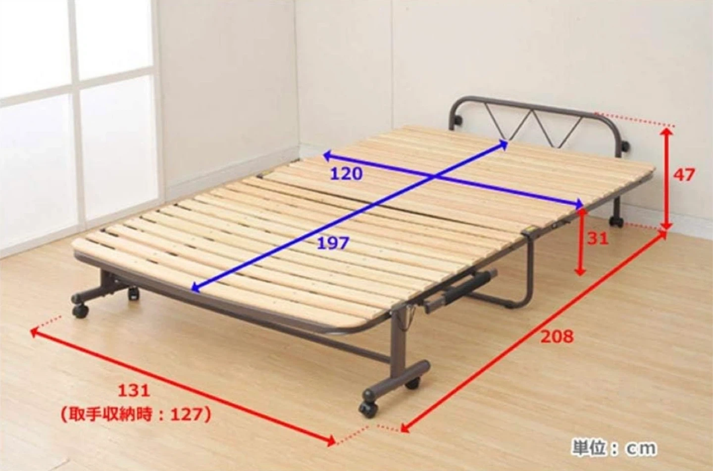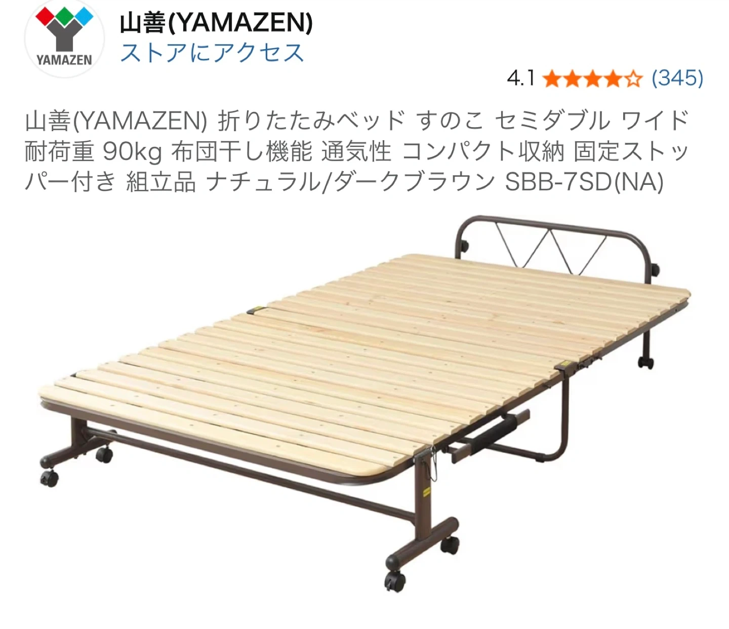 ヤマゼンの折りたたみベッドです 【情報】 ブランド:ヤマゼン 商品:折りたたみベッド サイズ: 幅 約120cm 長さ 約197cm 高さ 約47cm 型番:SBB-7SD(NA) 【状態】 中古品ですが、比較的きれいです 中古品であることご了承ください セミダブルなので、広々使えて寝心地もかなり良いです。 重さがあるので取りに来ていただける方、よろしくお願いいたします。 可能であれば受け取りは男性が来ていただけると、車への詰め込み等安心かなと思います。