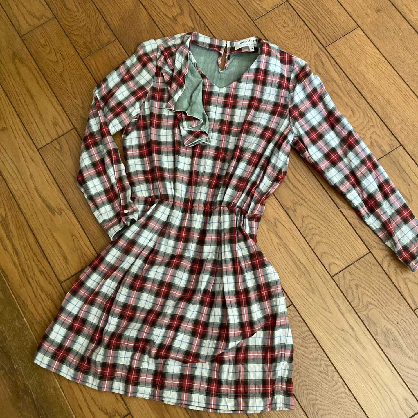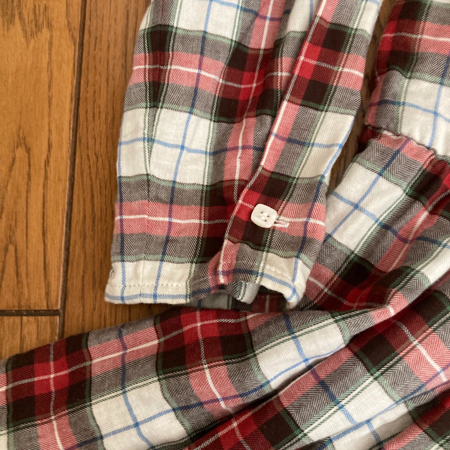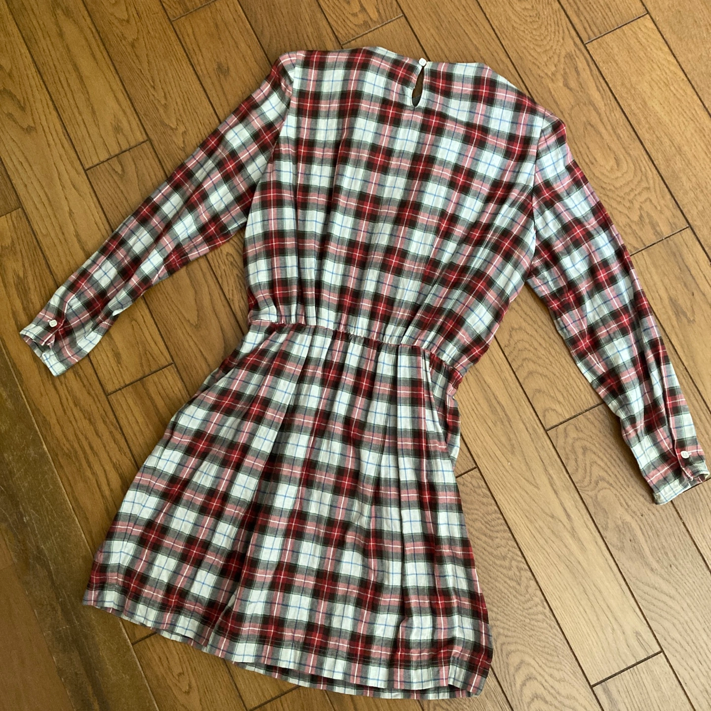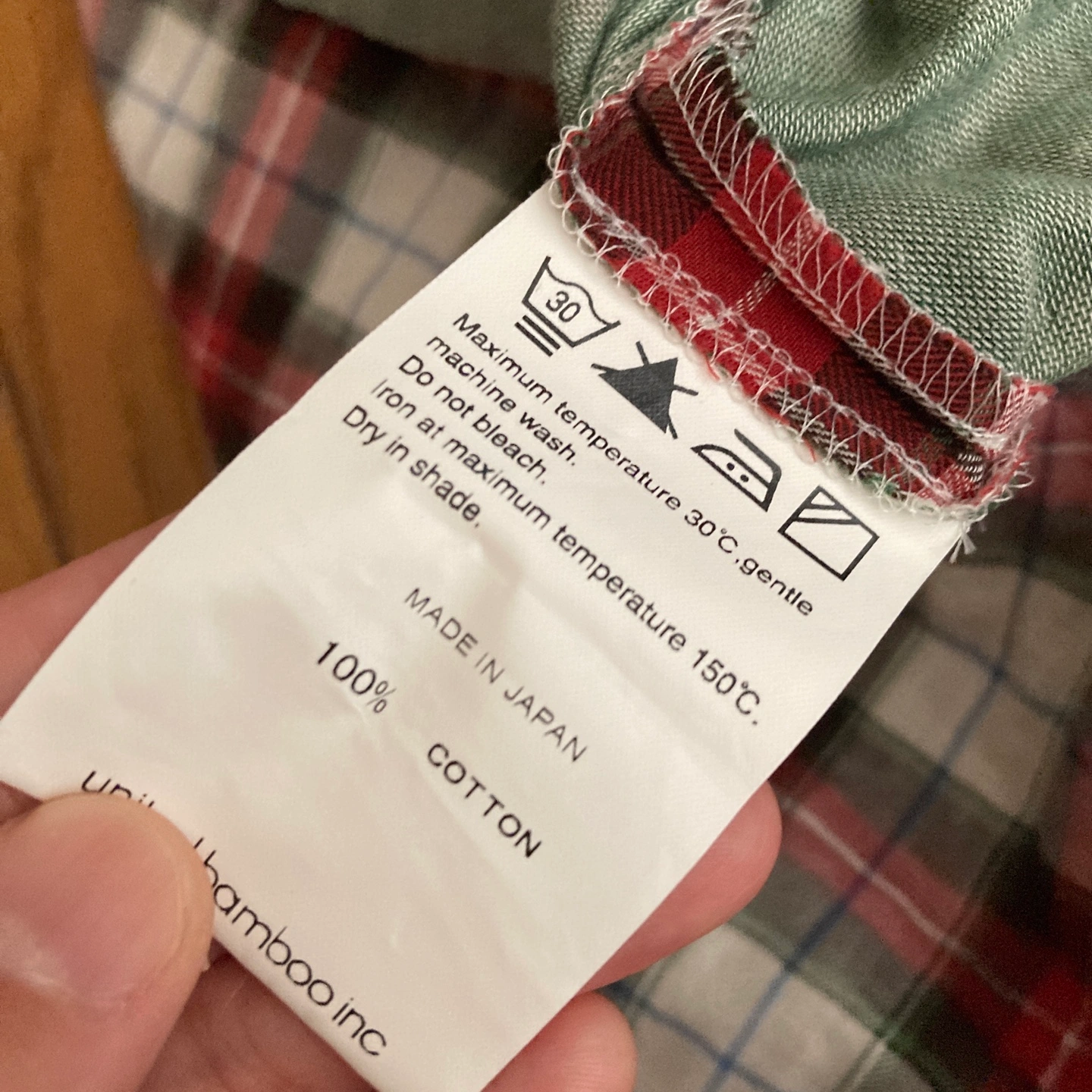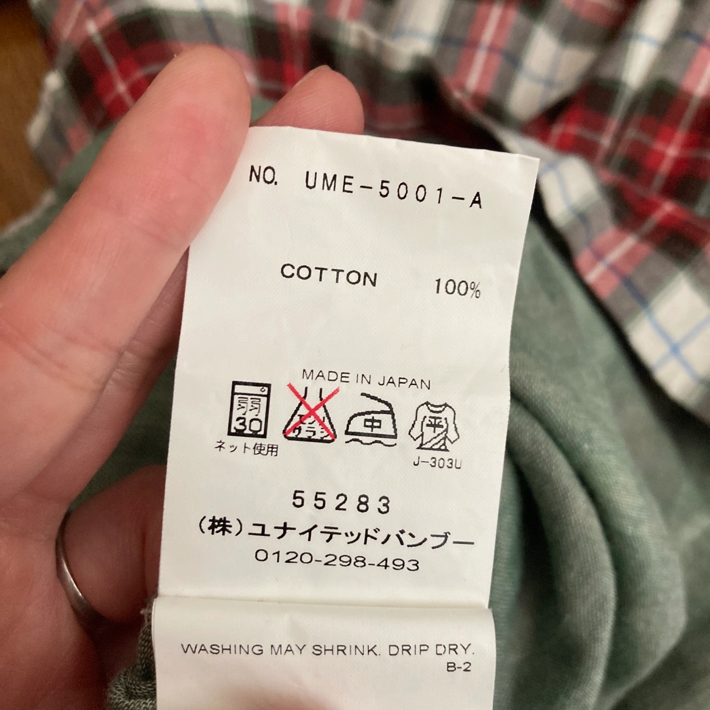 united bambooのチェック柄デザインワンピースです。かなりまえに正規店で購入しました。着用回数は2-3回と少ないですが長期間クローゼットに保管していたので、見えないシミなどあるかもしれません。 襟元のデザインが特徴的です。 身長158センチで着用し、膝上10センチくらいの長さです。ウエスト部分がゴムでコットン100%なのでとても着心地が良いです。 ちょっとしたおでかけや、発表会などにちょうど良いと思います。