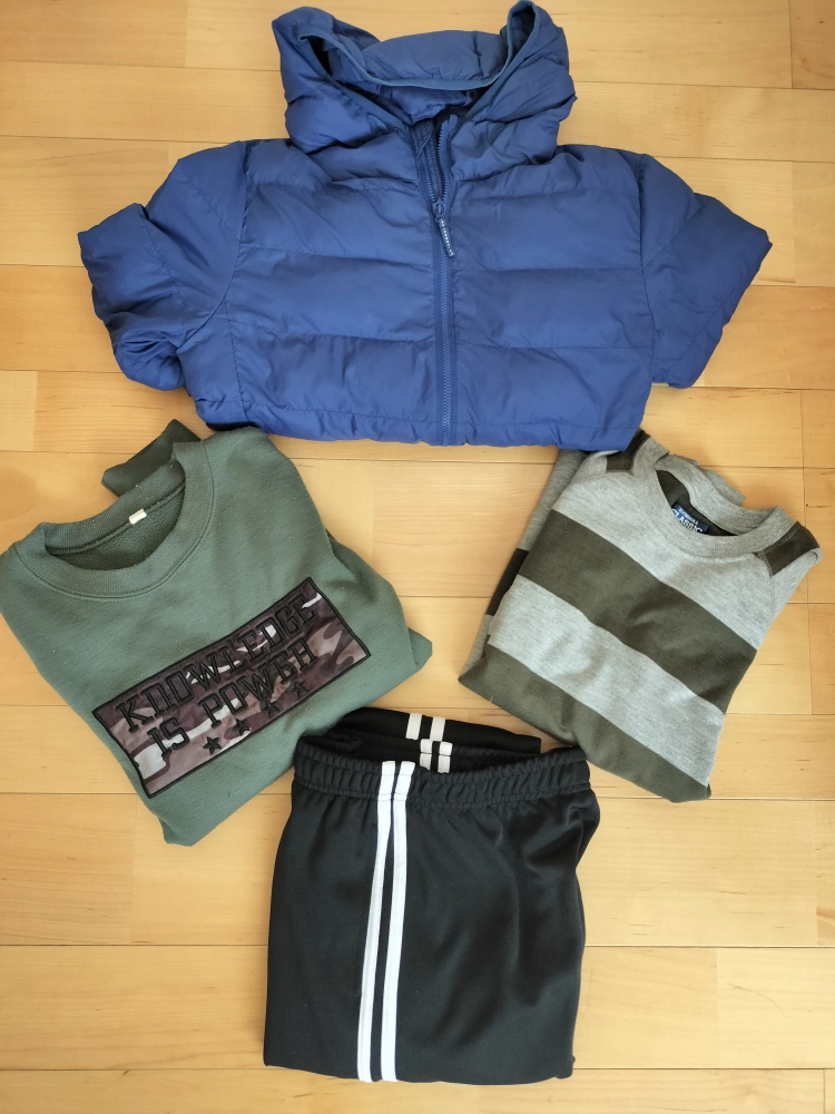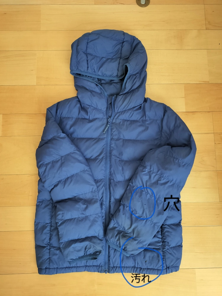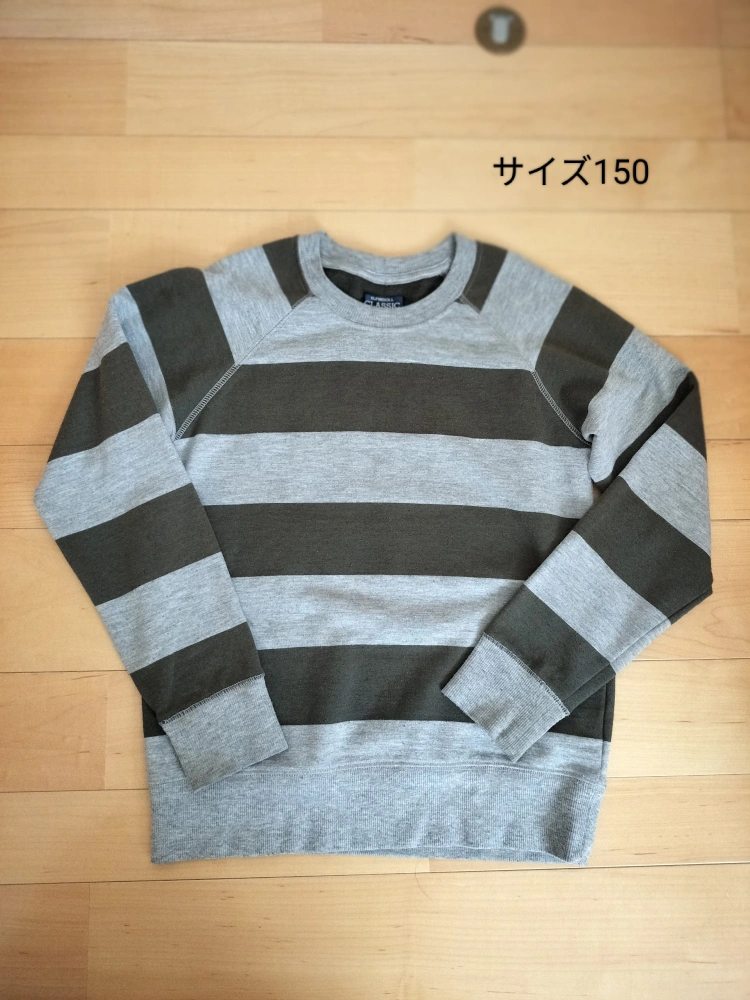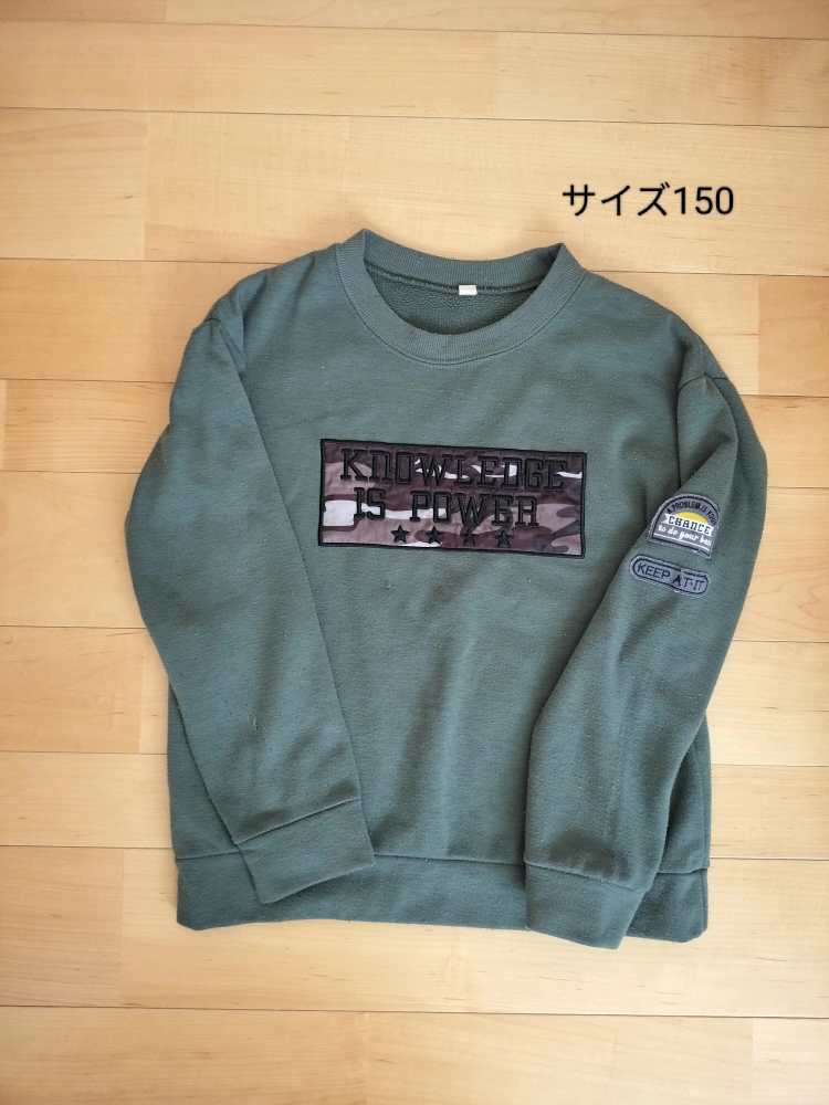 子供服 まとめ売りで す 【内容】 ・ユニクロ ダウンジャケット(青) サイズ:150 アウターの状態: 汚れあり、小さい穴あり ・トレーナー(カーキ色) 裏起毛、毛玉があります。 袖に汚れがあります。 ・トレーナー(グレーとカーキのボーダー) 多少毛玉があります。 ・ズボン(黒、白ライン入り) 1回のみ使用しました。 中古品であることご了承ください