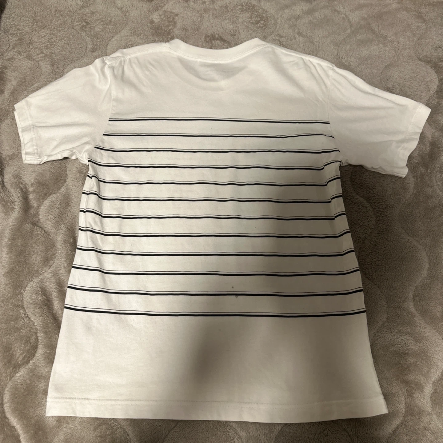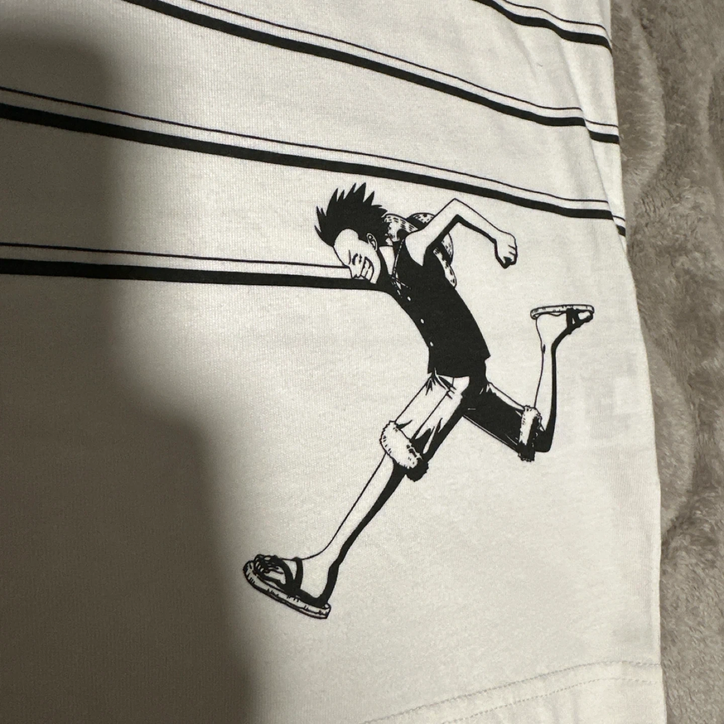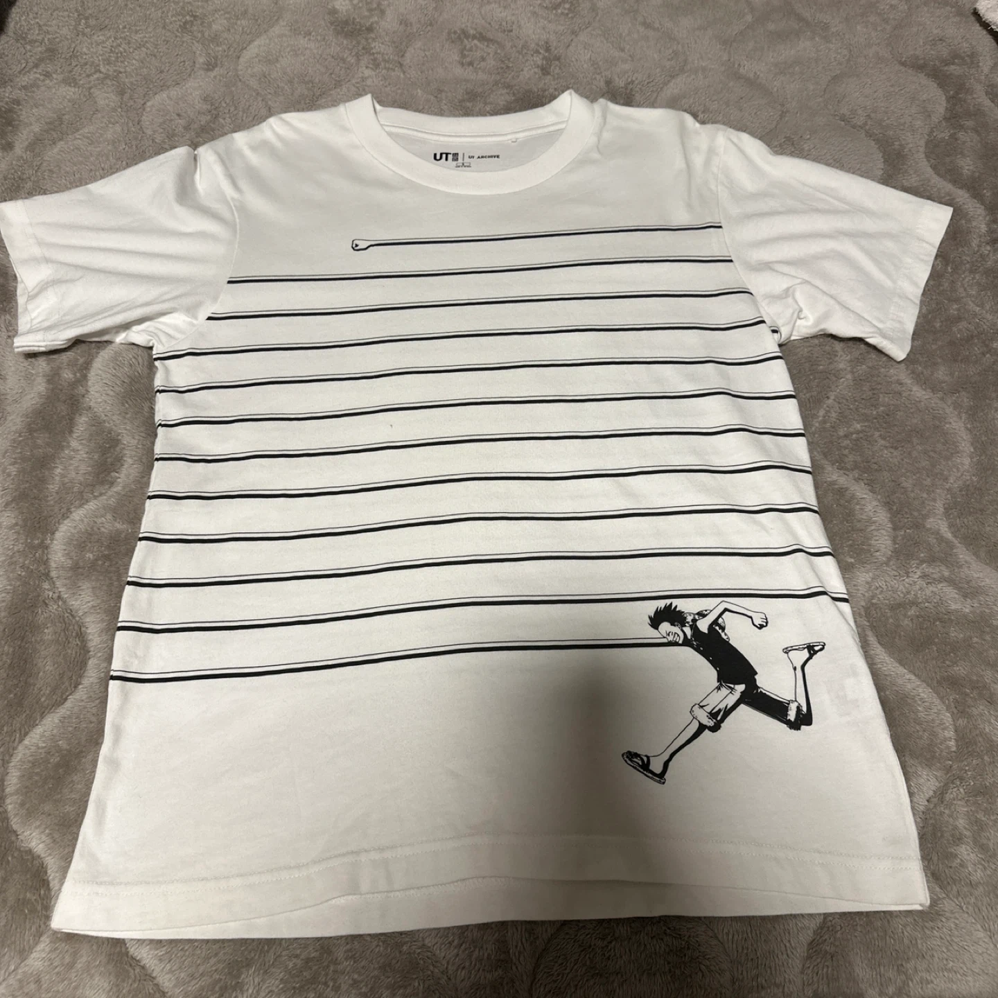 ユニクロUTのTシャツです ストライプデザインのUNIQLO UT ARCHIVE Tシャツ、Sサイズ、キャラクターのプリントが特徴。 やや背中に汚れがあります。おそらく息子が自転車に乗っていて背中に泥などが跳ねたものだと思います。 漂白等はしておりませんので落ちるかもしれませんが、納得いただける方にお願いします。 ・ブランド:ユニクロ ・サイズ:S ・カラー:白 ・UT ARCHIVE ・デザイン:ボーダー、ワンピースのルフィのプリント ・状態:小さなシミがいくつかあります 中古品であることご了承ください