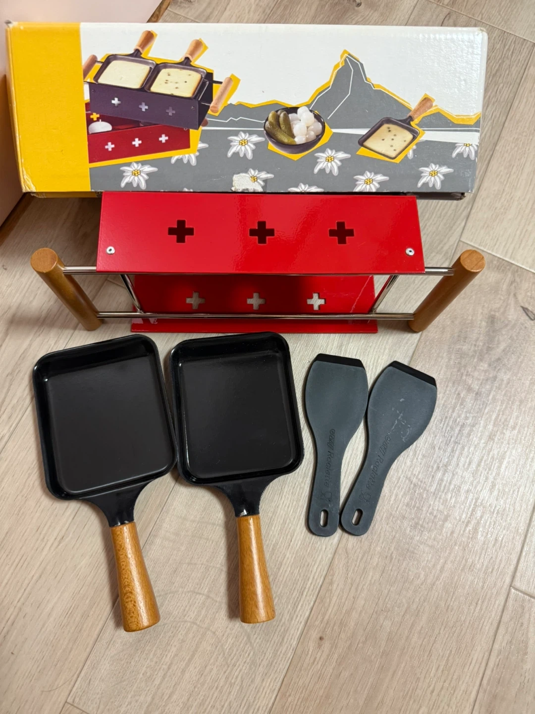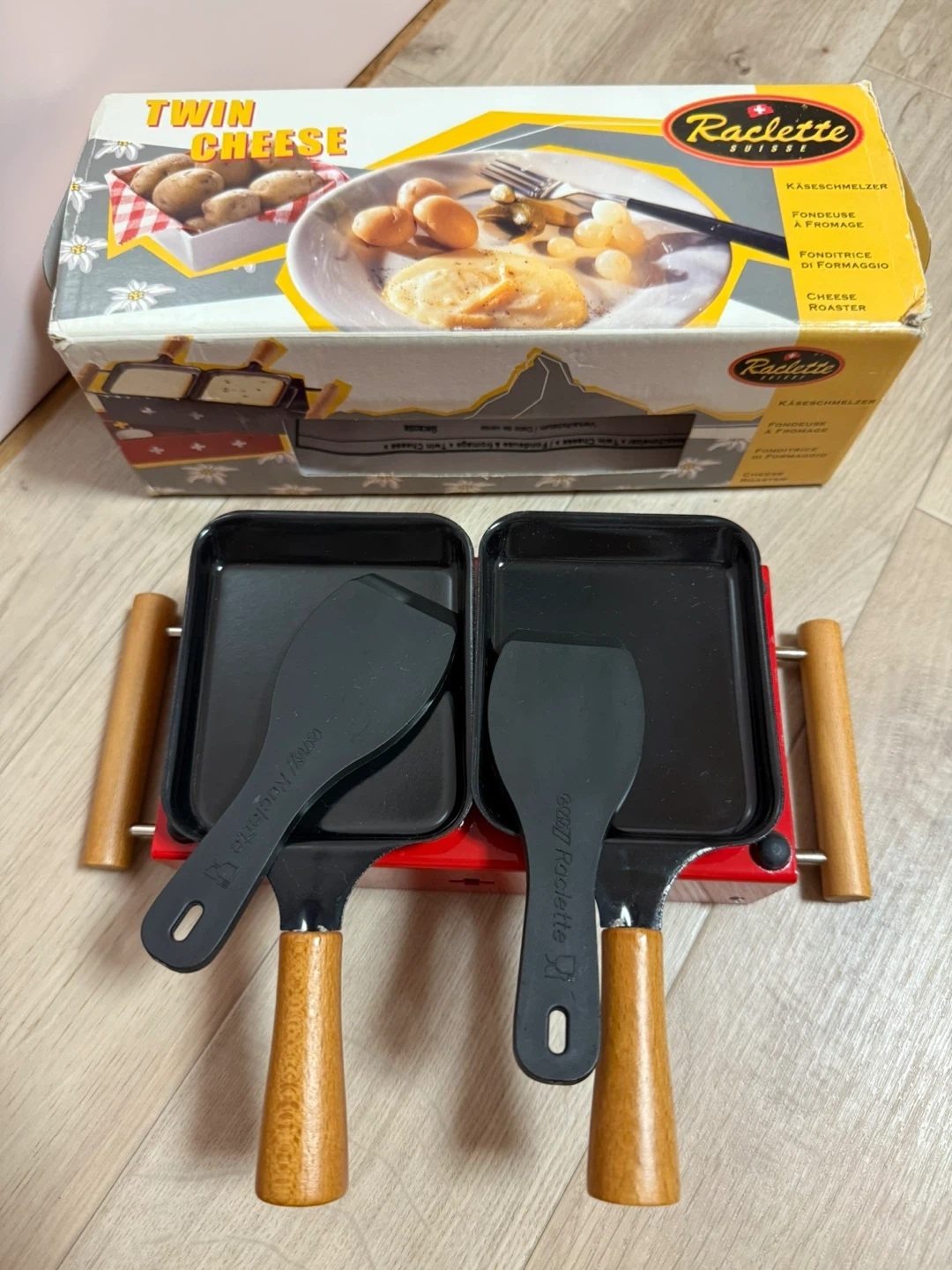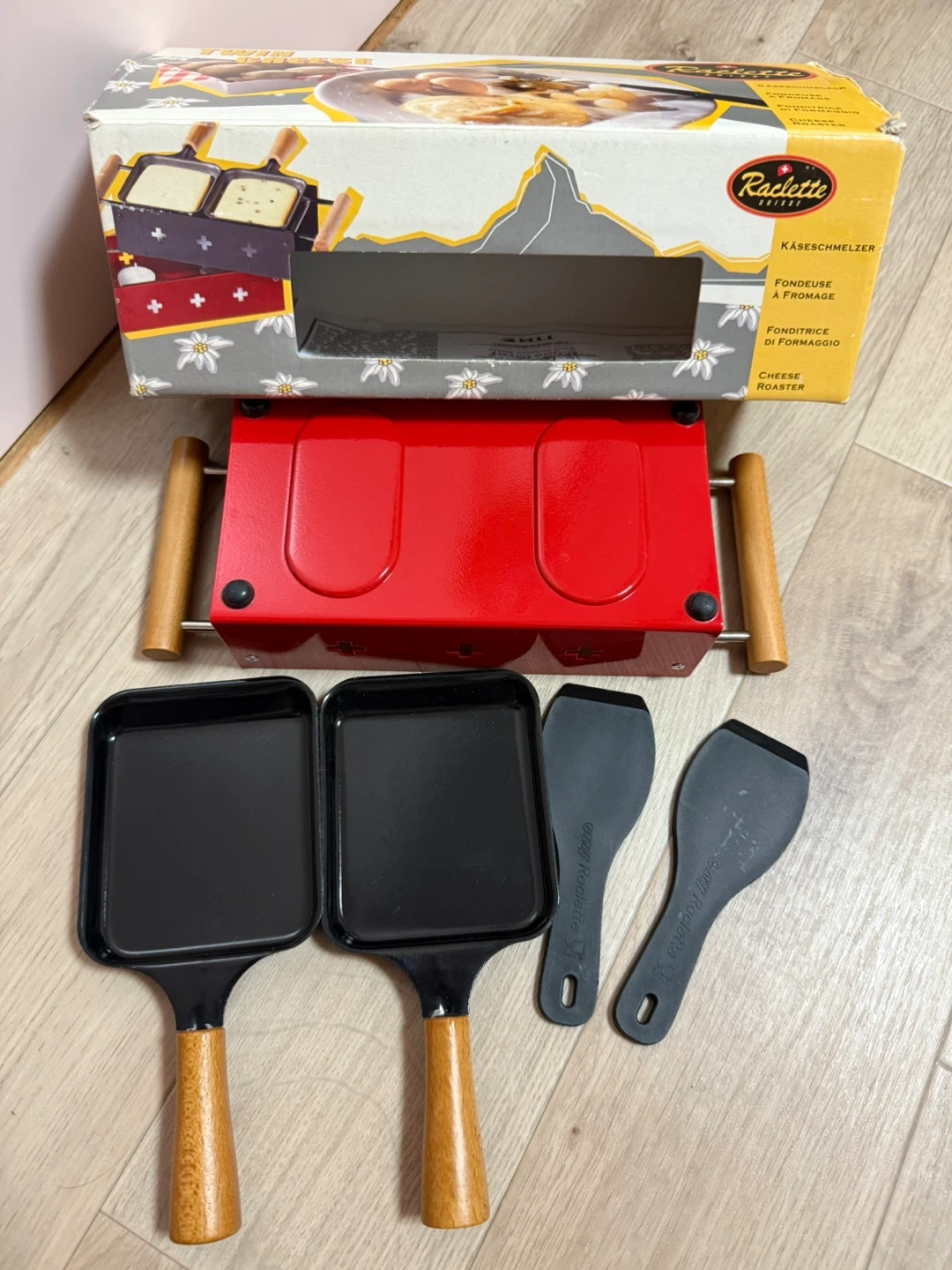 海外で購入しました。 ラクレット用のチーズロースターです 箱の写真のように、キャンドルを別購入して 赤い部分の底において、ミニパンで暖めて使います。箱とヘラに少し使用感がありますが、本体は綺麗 です。 ・付属品:箱、ヘラ2枚 ・状態:使用感少なめ