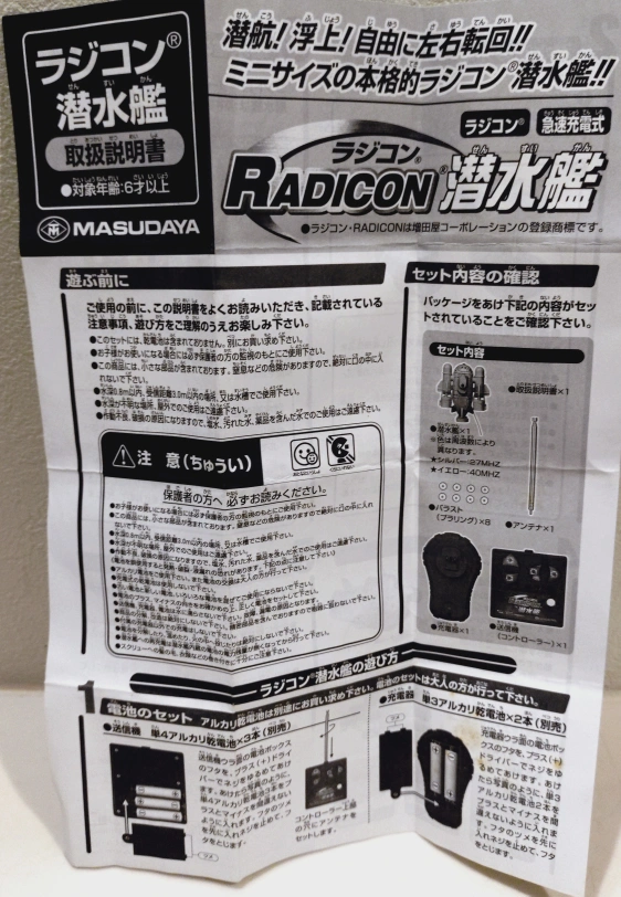 マスダヤのラジコン潜水艦です 【情報】 ブランド:マスダヤ 商品名:RADICON ラジコン潜水艦 【状態】 未使用品 ですが、かなり昔のですので、動くかわかりません、それでも構わない方のみご購入下さいませ 動かない時は模型として飾っても可愛いかと思います 電池は別売りです 【付属品】 完品(説明書付き) 中古品であることご了承ください