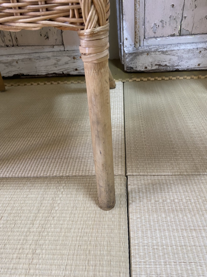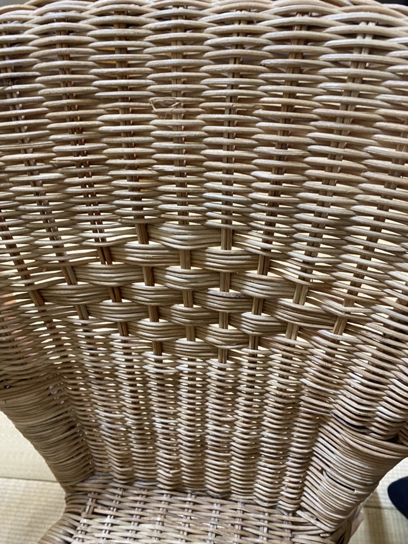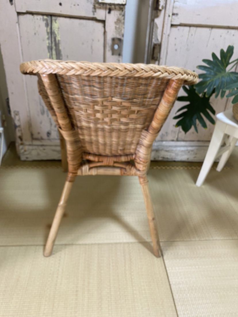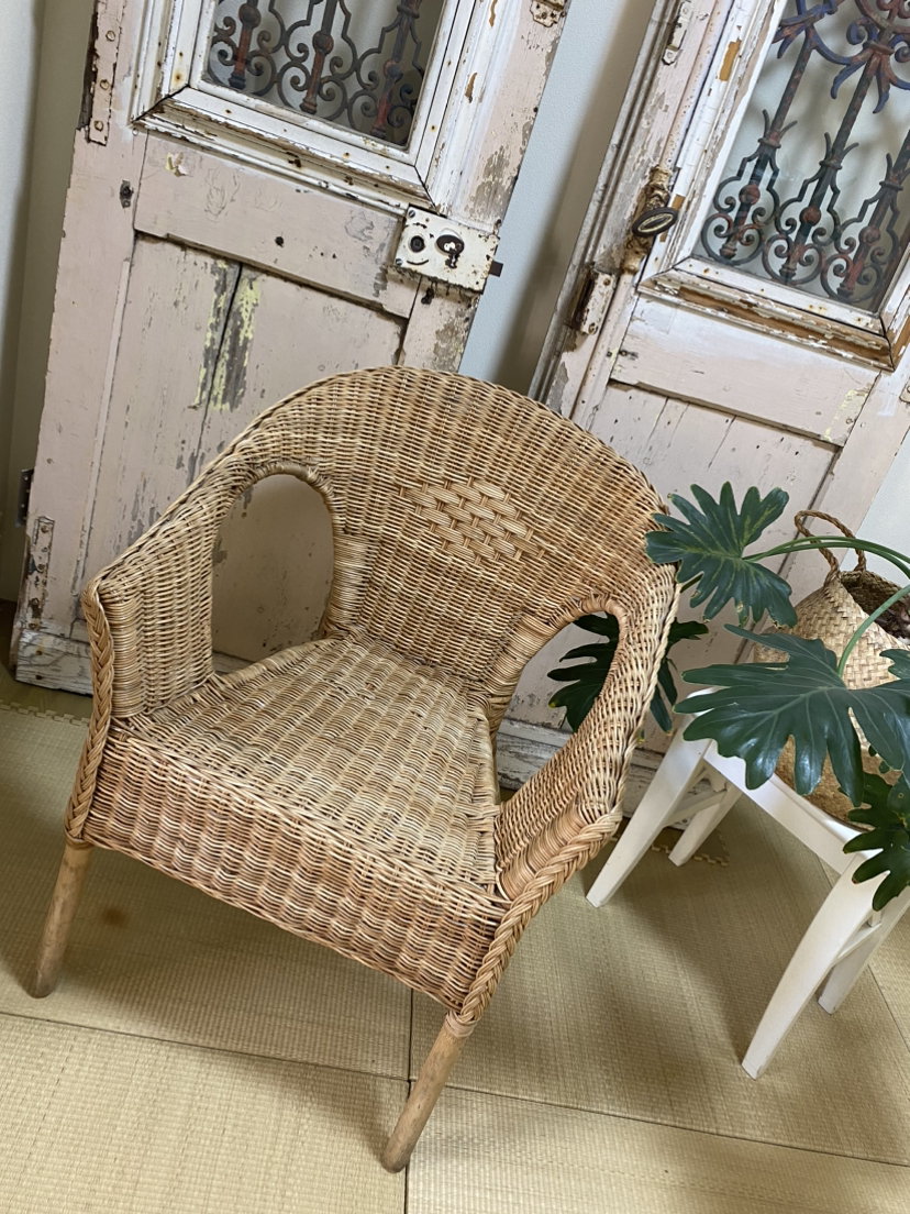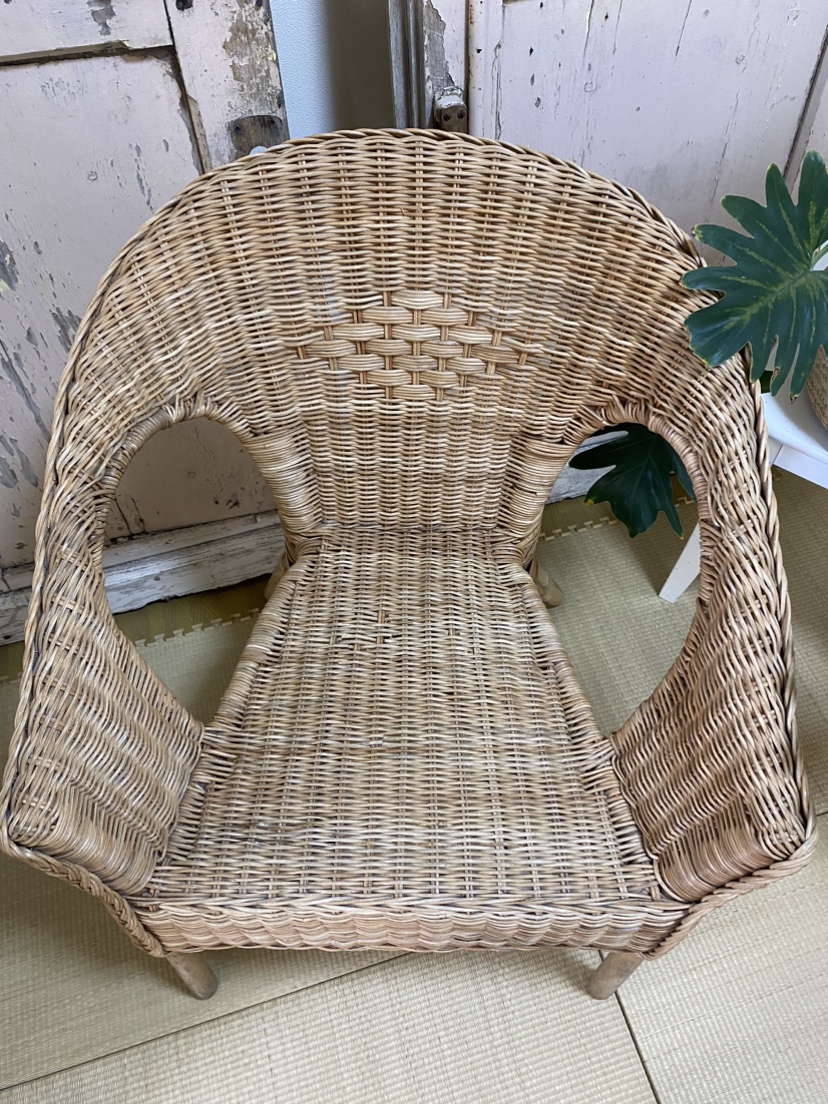 アンティークのラタン肘掛けチェアです。 何年か前にお店のフィッティング用の腰掛けとして、インテリアとしてアンティーク屋さんから購入したものです。 size 高さ 59センチ 座面まで 46センチ 横幅 最大 58センチ 重さはわかりませんが女性で楽に持ち上げられる軽さです。 丸みのあるシルエットが素敵です。 リビングでマイチェアにするのも良し! 玄関サイドで荷物置きにするも良し! 寝室に置いてゆっくり本を読むのも良し! 是非、お気に入りのインテリアにお役立て下さい! 傷や汚れ、特には脚の下の方は靴で蹴られたあとなのか、跡が残っています。 ご理解頂ける方に!