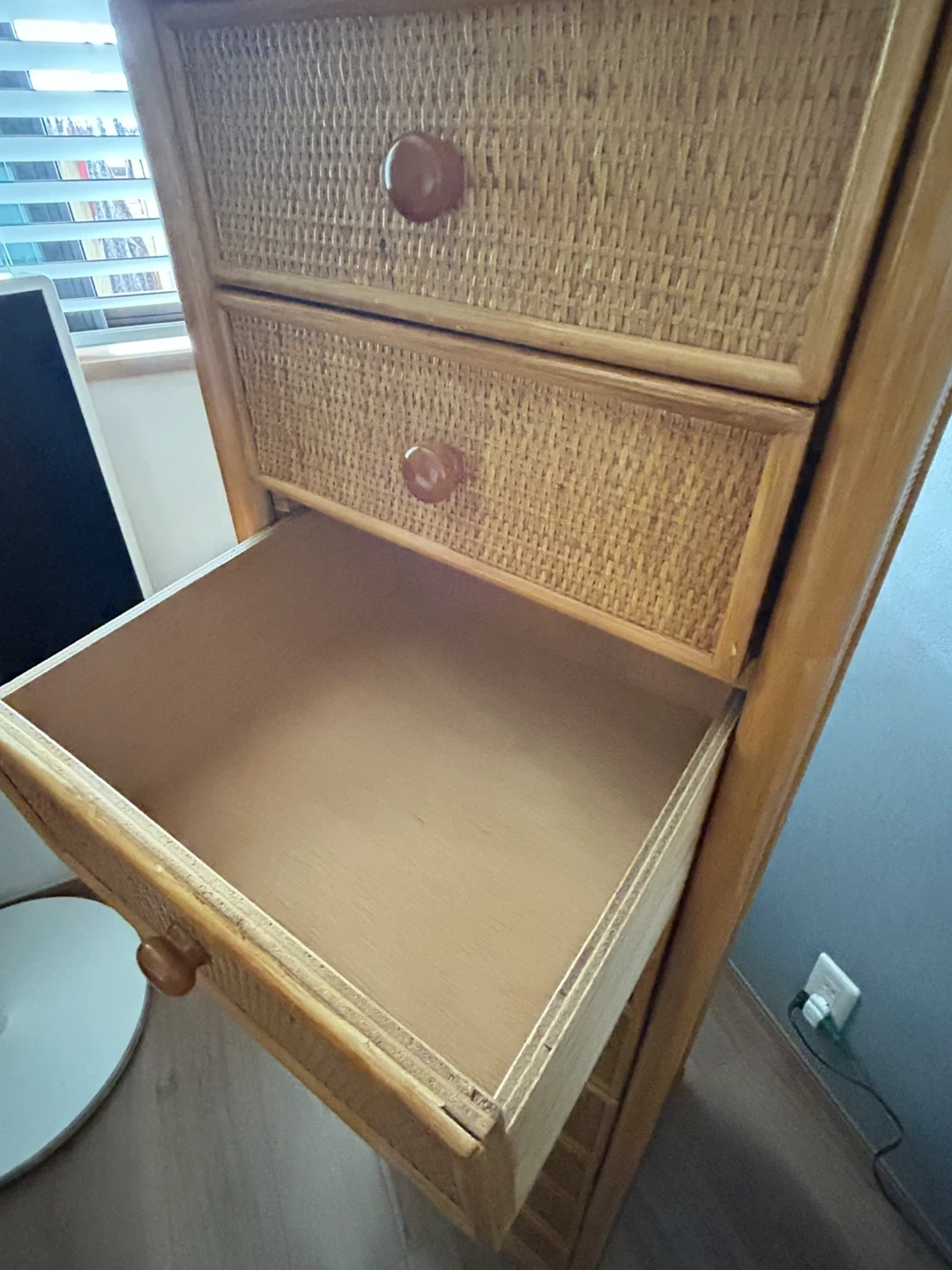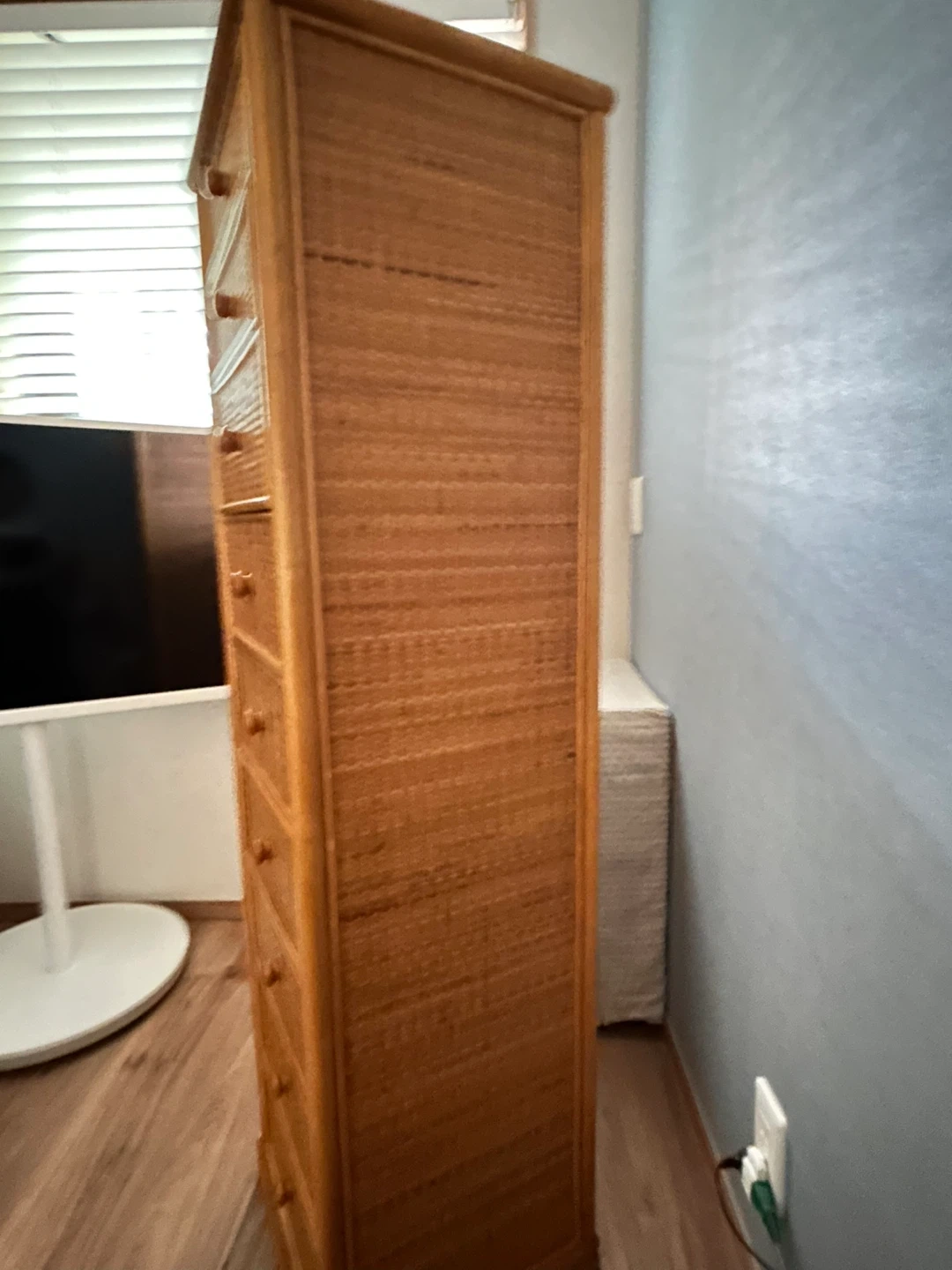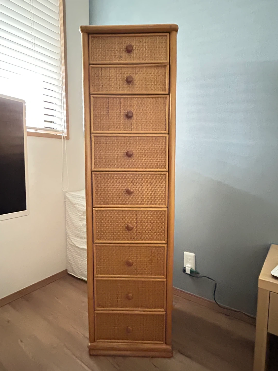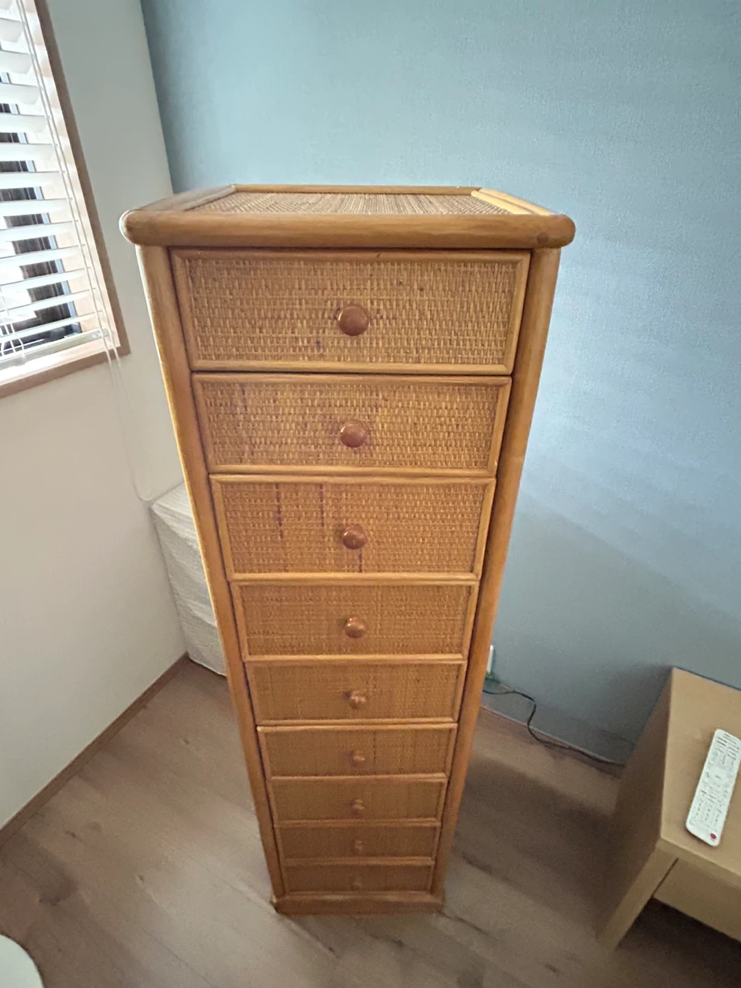ラタン調のチェストです。 ・9段チェスト ・素材:木材ラタン調 ・色:ナチュラル ・本体幅39㌢、奥行35.5㌢、高さ140㌢ ・引出し内寸幅30㌢、奥行29㌢ほど 長い期間愛用しておりましたのでそれなりの使用感はありますが大きなダメージは有りません。 細かな生活用品の整理などに役立ちました♪ 中古品であることご了承ください、また自宅まで引取りに来れる方にお譲りします。 (当方都合で土日月で)