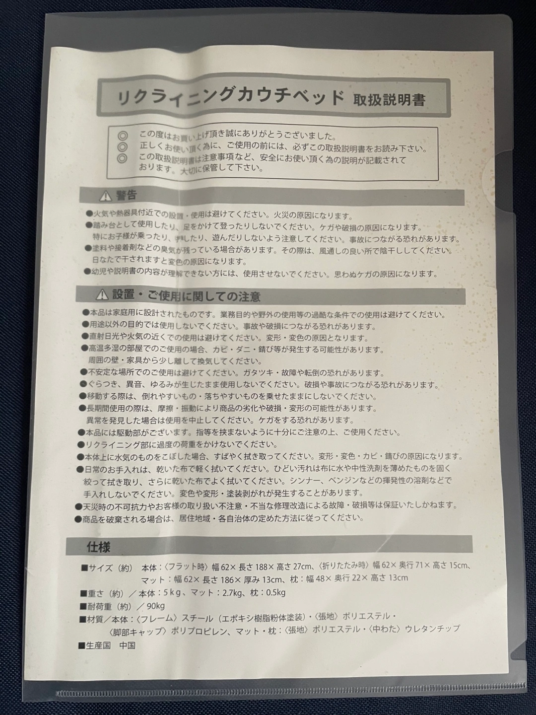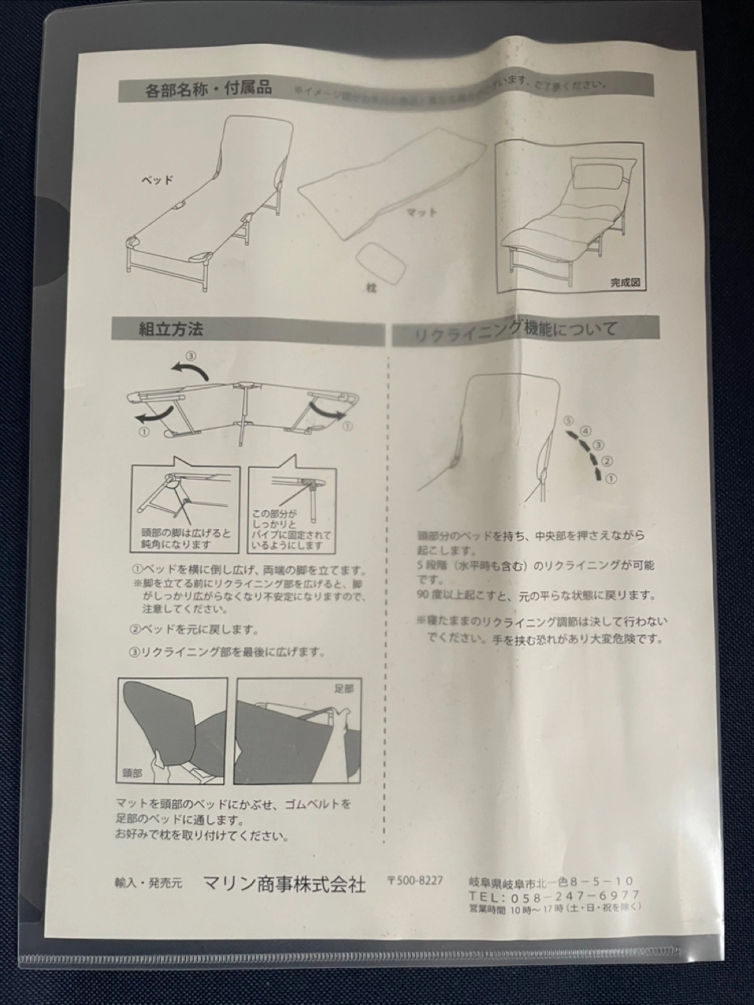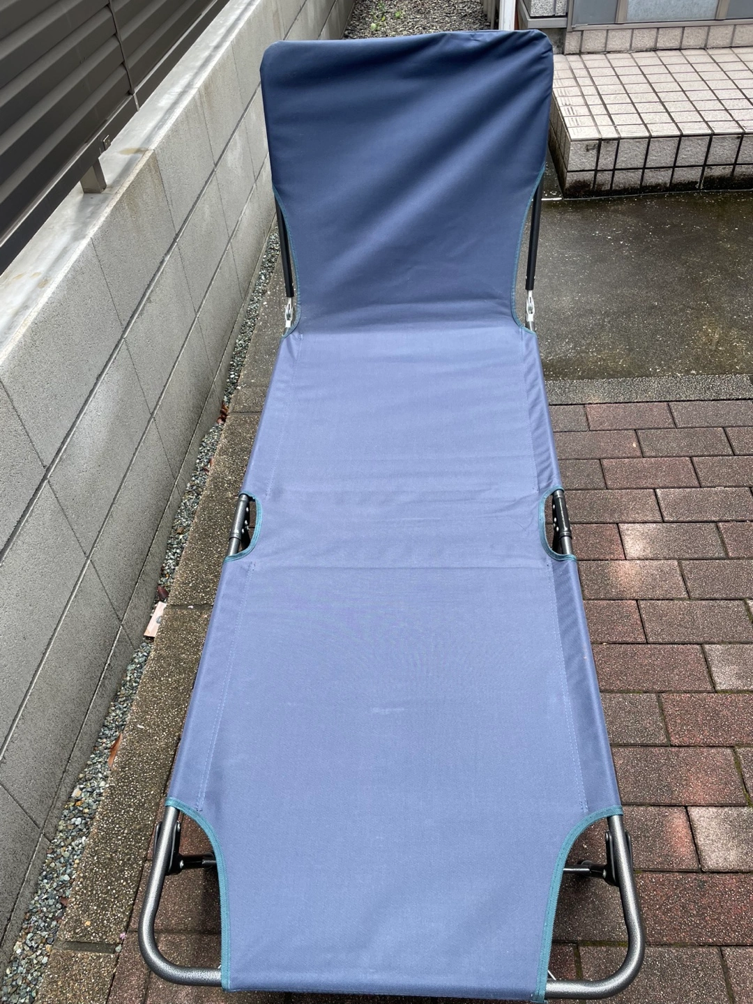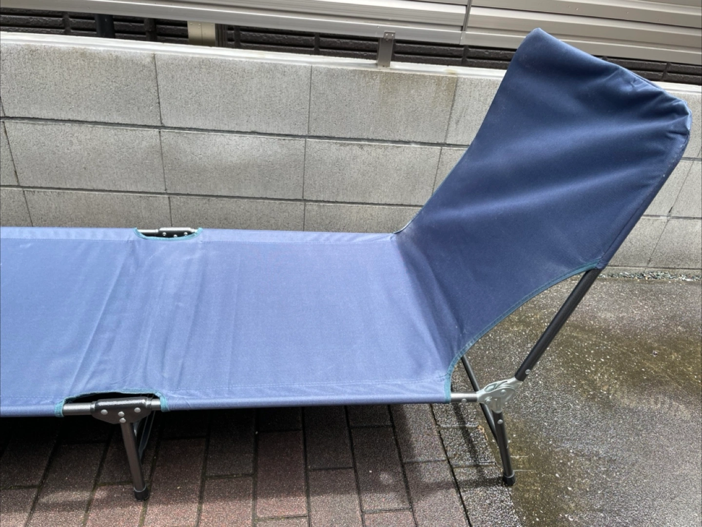 リクライニングカウチベッドです 付属のマットありません。 【情報】 サイズ(約): ・本体(フラット時)幅62×長さ188×高さ27cm ・本体(折りたたみ時)幅62×奥行71×高さ15cm 重量:本体5kg、マット2.7kg、枕0.5kg 材質:本体(フレーム)スチール(エポキシ樹脂粉体塗装) (生地) ポリエステル (脚部キャップ) ポリプロピレン 【状態】 使用感少なめ、目立つキズなし 中古品であることご了承ください 自宅近くまで取りに来てくださる方、希望です