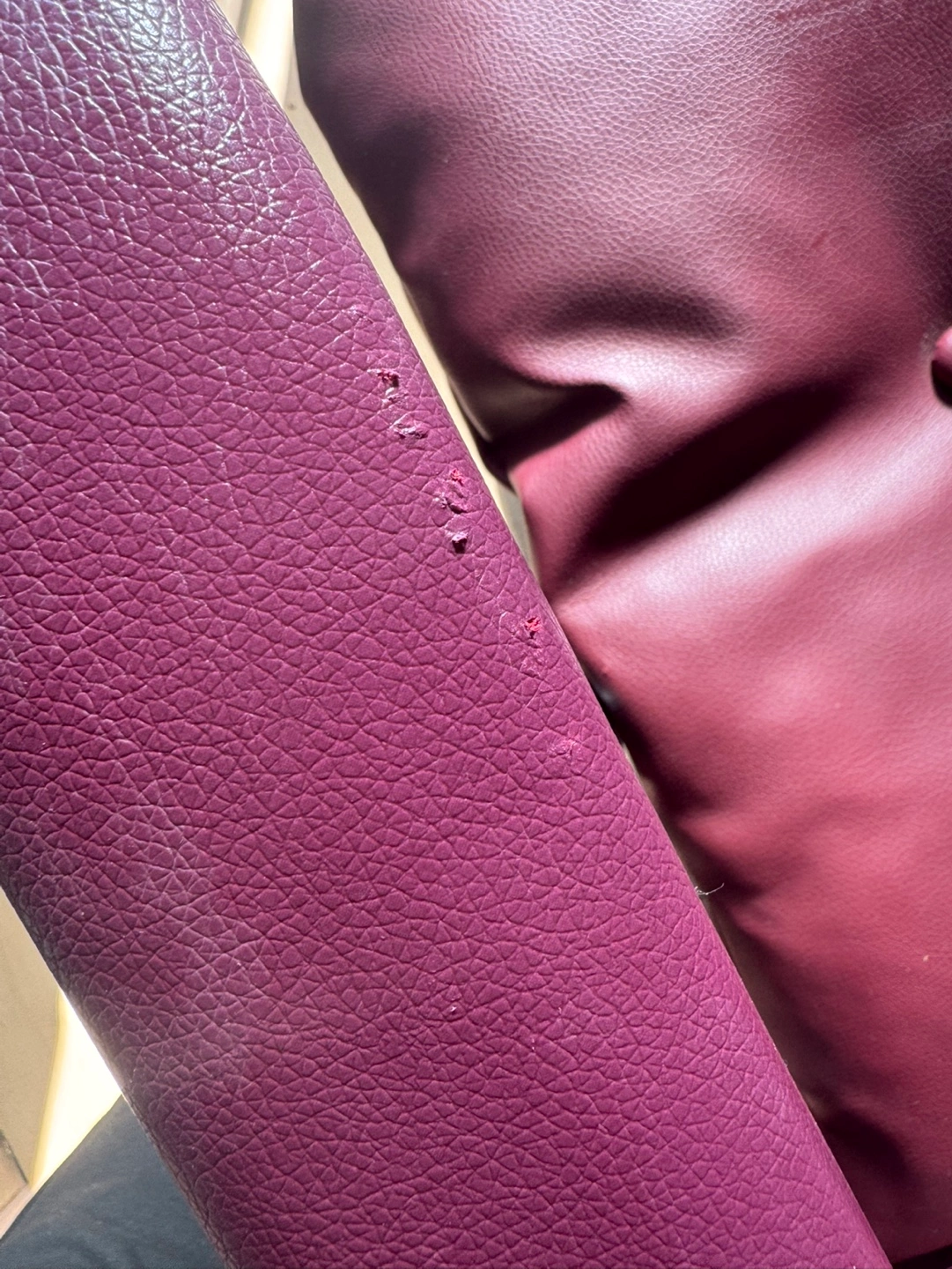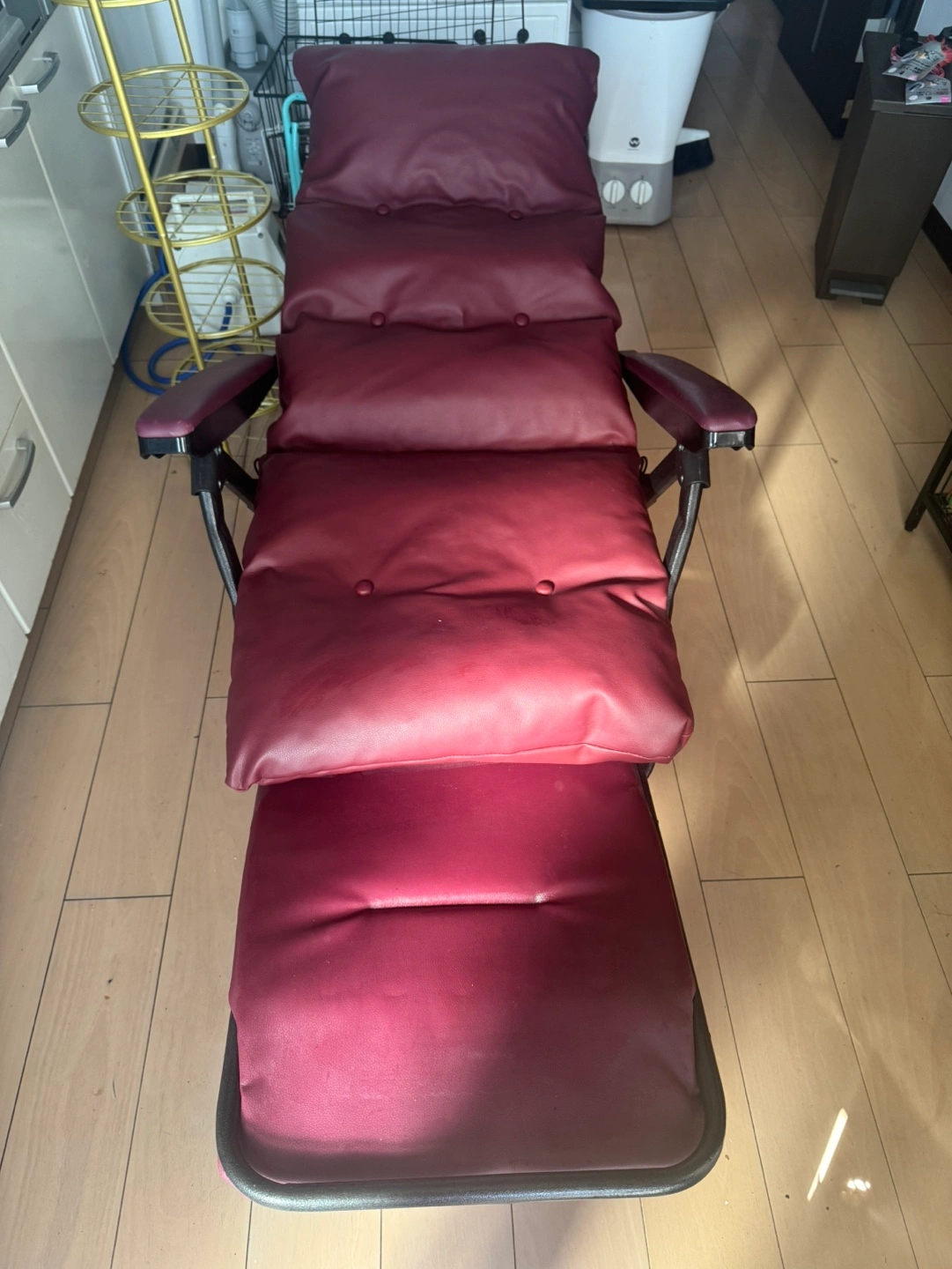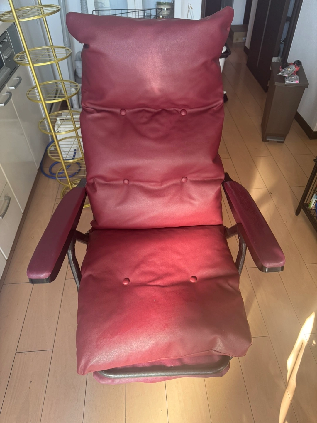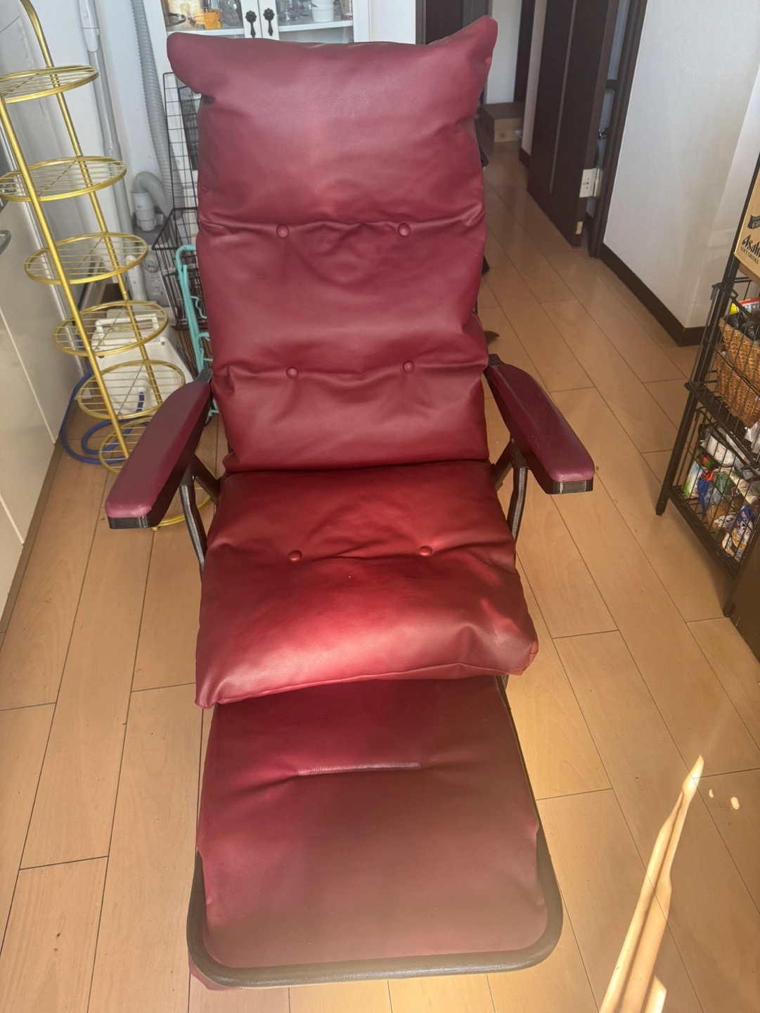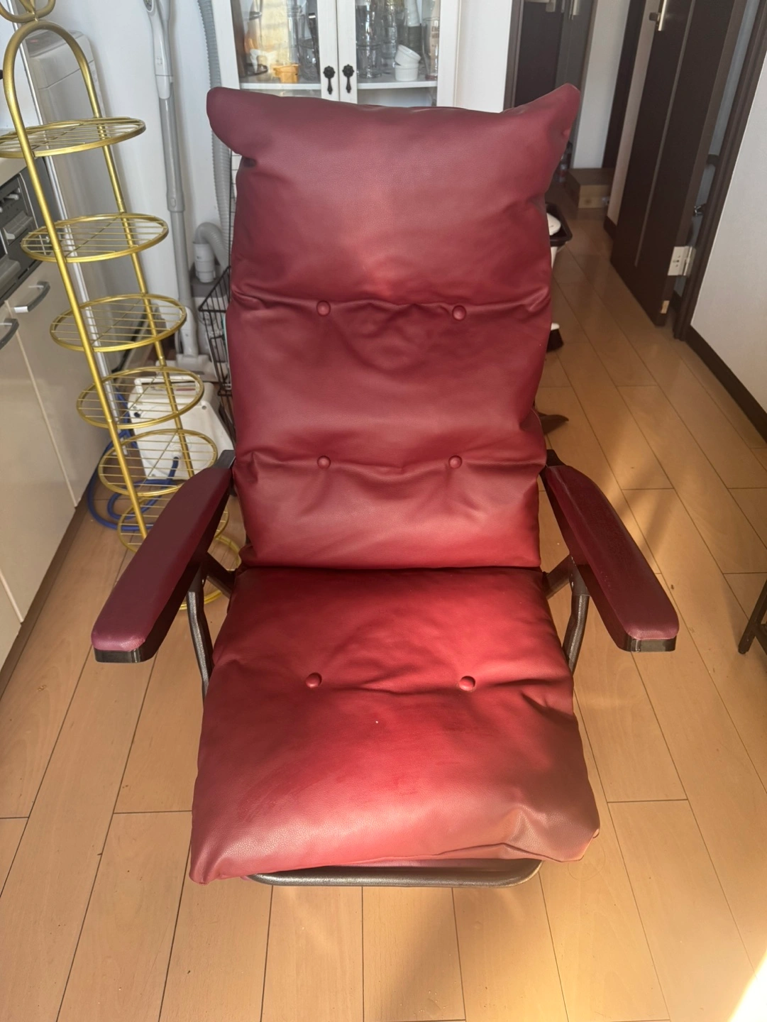 Vを観たりお昼寝したり、用途によっていろいろ角度を変えて楽しめる背6段階リクライニング・パーソナルチェア。ふっくら座面で疲れにくい座面下にスライド収納式オットマンを装備。届いたらすぐに使える完成品でお届け。安心の日本製です。 ●色/ワインレッド ●サイズ/使用時:約幅60×奥行78〜120(フットレストオープン時164)×高さ61〜102cm、収納時:約幅60×奥行50×高さ90cm、座面高:約42cm ●重さ/約12kg ●素材/本体:スチールパイプ(エポキシ樹脂粉体塗装) 、張り地:[表地]マーガレット柄ベージュ:ポリエステル100%、その他:合成皮革(PVCレザー)・[裏地]ポリエステル100%、クッション材:ウレタンチップ・鋼製バネ ●仕様/背もたれ6段階リクライニング 目立たないと思いますが、錆や傷がございます。理解できる方お願いいたします。