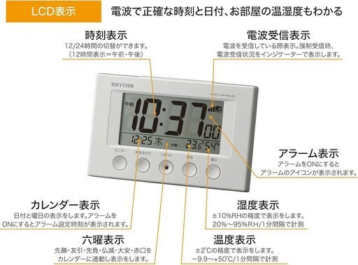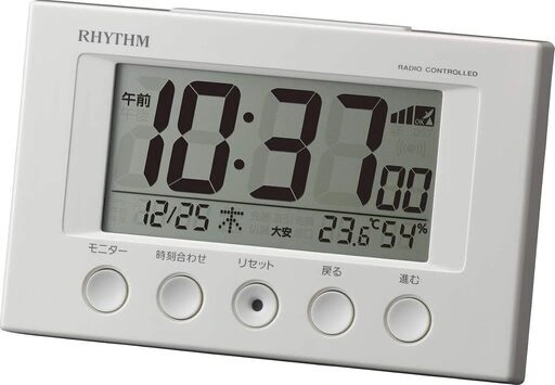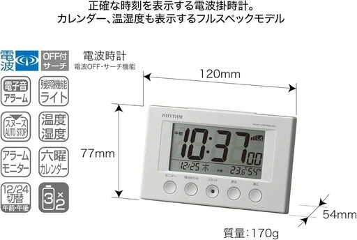 ブランドはリズム(RHYTHM)です。 色はホワイト。 サイズ:7.7×12×5.4cm、本体重量:約0.17kg 電波サーチ機能/スヌーズ機能&アラームオートストップ機能付き。 温度表示:有(-9.9~50℃)/湿度表示:有(20~95%) 文字板照明ライト(残照機能:5秒)付き。 使用電源:単3形マンガン乾電池×2本(別売り) 電子音アラーム /六曜カレンダー コンパクトサイズの置き型電波時計です。 未使用に近いです。 ご希望の方はお気軽にご連絡ください。