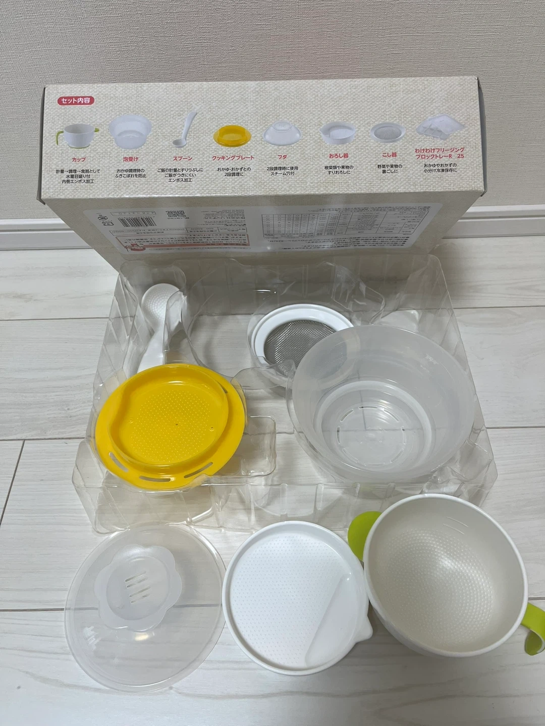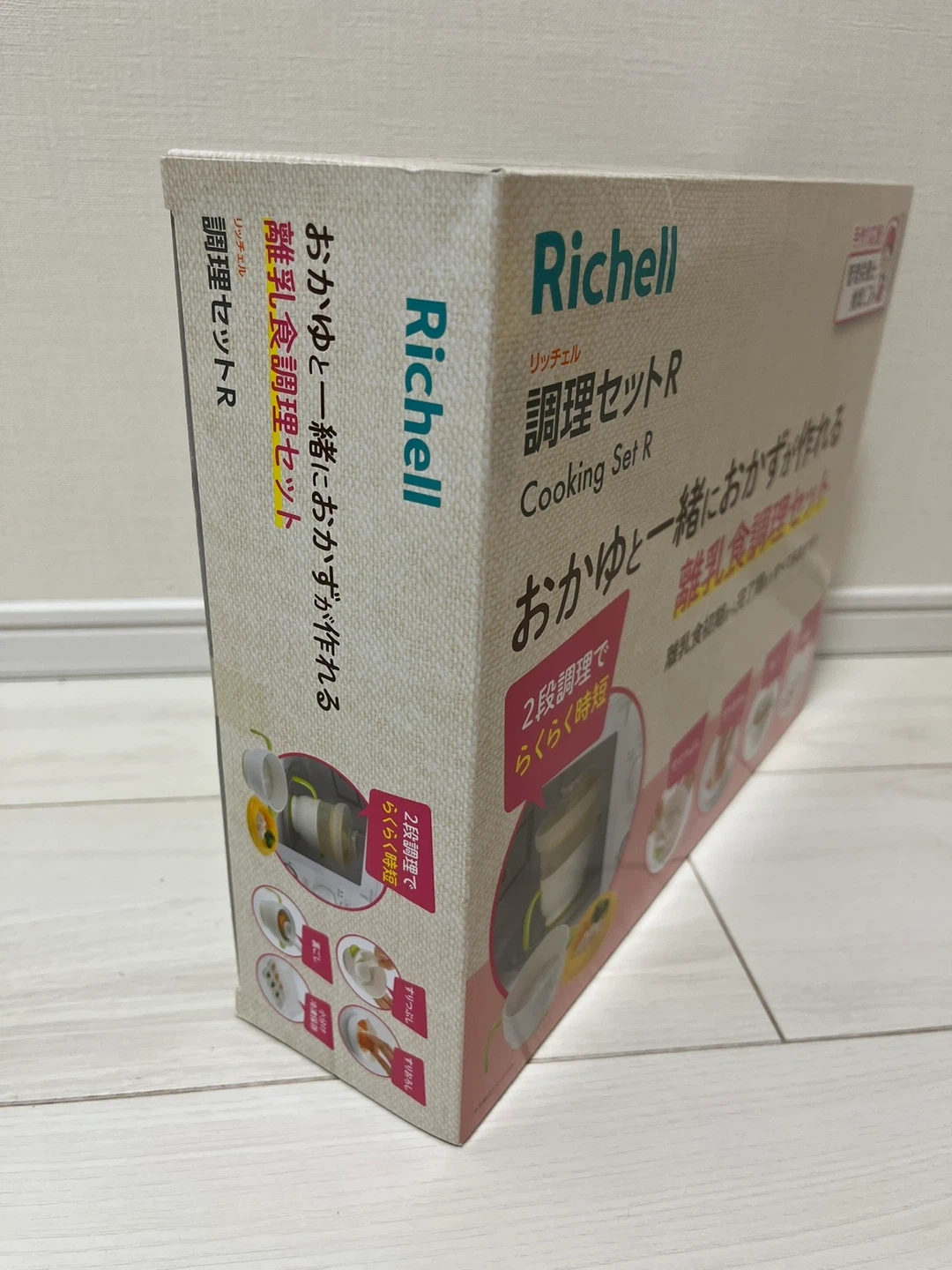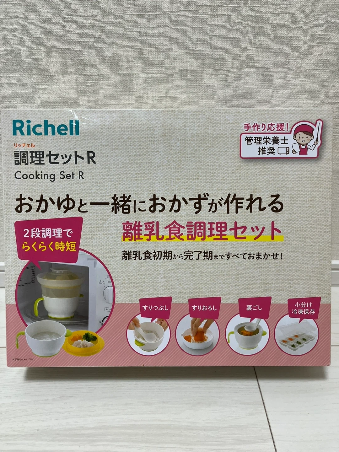 2024年10月Amazonにて新品購入しました。 電子レンジ用おかゆクッカー・おろし器・こし器・クッキングプレート・ふたがセットになった離乳食調理器具セットです。 わけわけフリージングブロックトレーR25は、使用頻度が高かったため、付いておりませんので、その点ご了承くださいませ。 箱と取扱説明書あります。 - ブランド: Richell - 商品名: Cooking Set R - セット内容: ボウル、おろし器、スプーン、ふた、クッキングプレート、説明書 - 特徴: 持ち手付きボウル、2段階調理可能 レンジで簡単に離乳食が作れ、離乳食初期の少量調理のときなどに大活躍です。 洗浄していますが、ご使用前に必ずご自身でも洗浄・除菌をお願いいたします。 使用済みのため多少の使用感があります。 中古品にご理解いただける方にご購入いただければと思います。