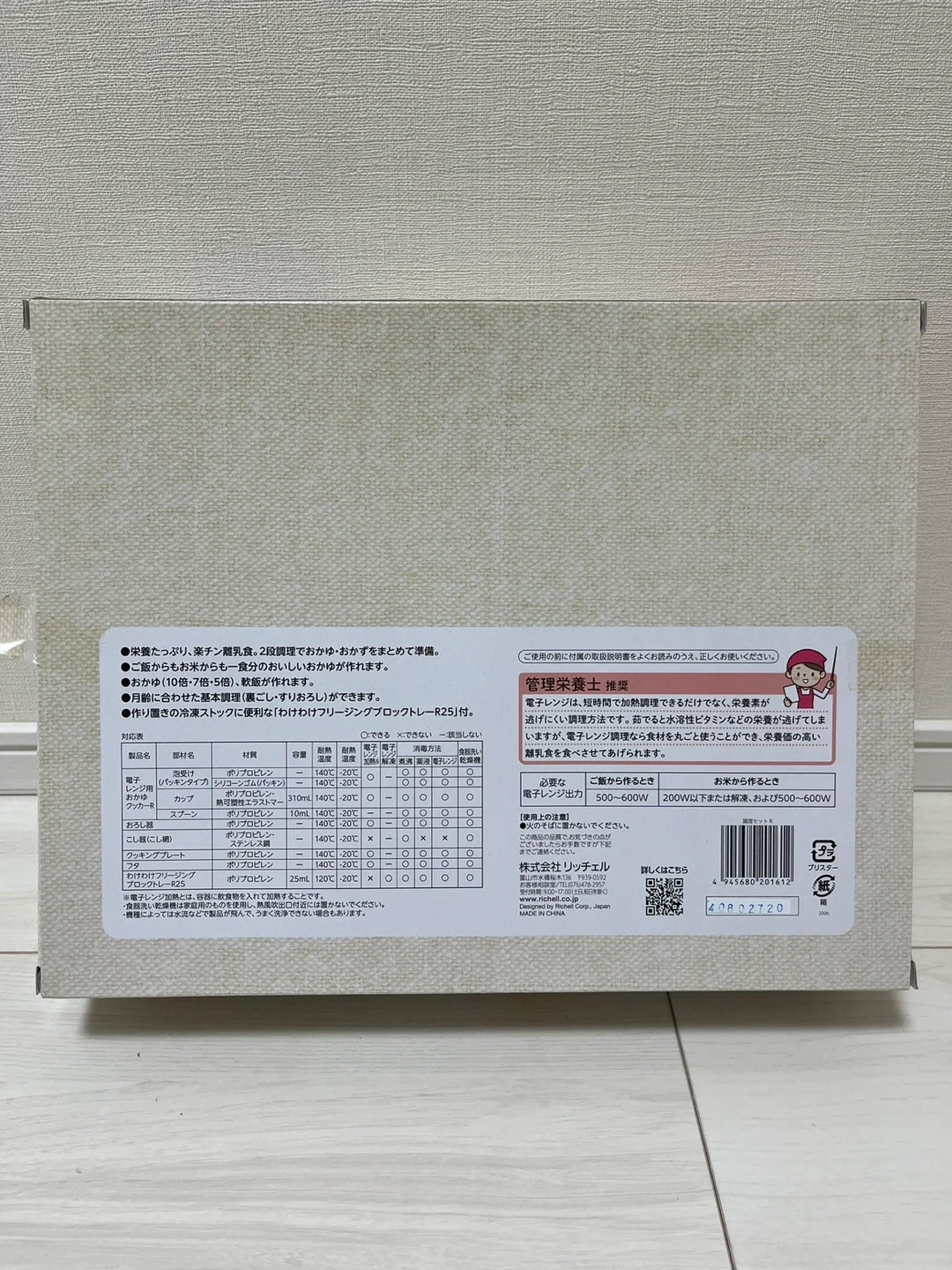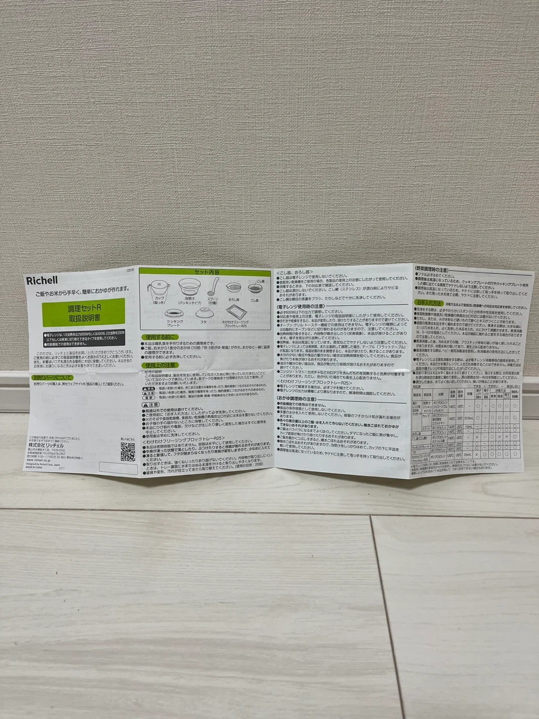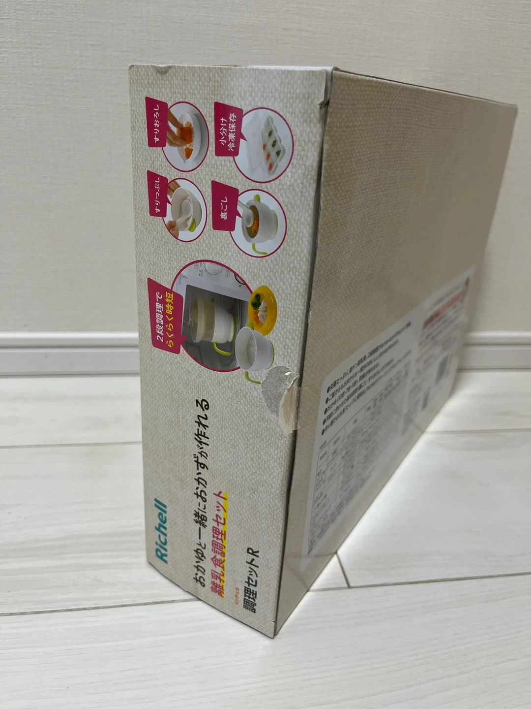 2024年10月Amazonにて新品購入しました。 電子レンジ用おかゆクッカー・おろし器・こし器・クッキングプレート・ふたがセットになった離乳食調理器具セットです。 わけわけフリージングブロックトレーR25は、使用頻度が高かったため、付いておりませんので、その点ご了承くださいませ。 箱と取扱説明書あります。 - ブランド: Richell - 商品名: Cooking Set R - セット内容: ボウル、おろし器、スプーン、ふた、クッキングプレート、説明書 - 特徴: 持ち手付きボウル、2段階調理可能 レンジで簡単に離乳食が作れ、離乳食初期の少量調理のときなどに大活躍です。 洗浄していますが、ご使用前に必ずご自身でも洗浄・除菌をお願いいたします。 使用済みのため多少の使用感があります。 中古品にご理解いただける方にご購入いただければと思います。