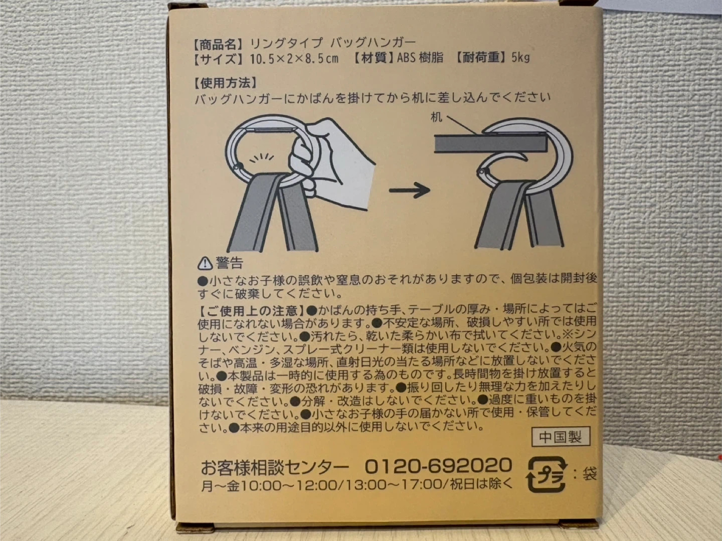 コンパクトで持ち運びやすいリングタイプのバッグハンガー、耐荷重5kgで安心して使用可能。 - 商品名: リングタイプバッグハンガー - サイズ: 10.5×2×8.5 cm - 耐荷重: 5 kg - 素材: ABS樹脂