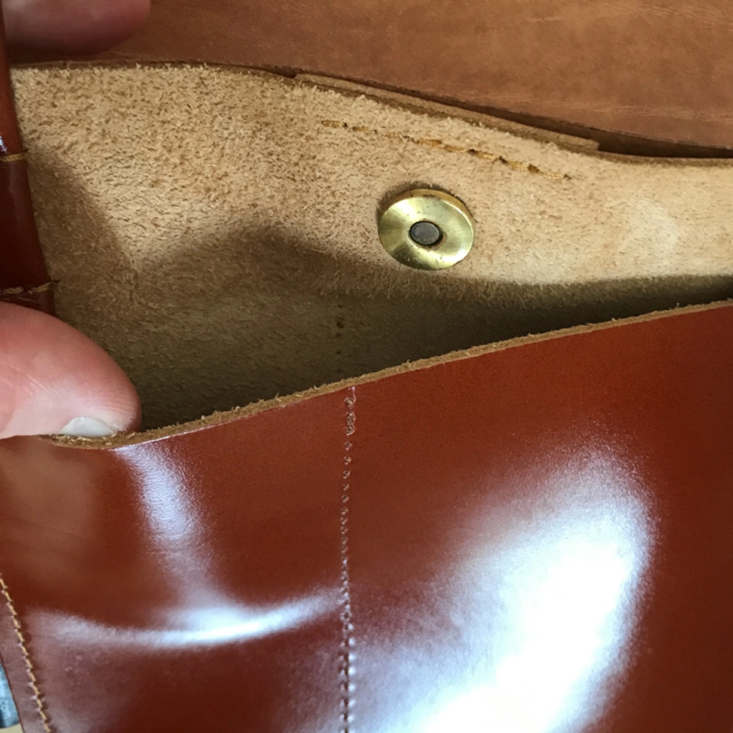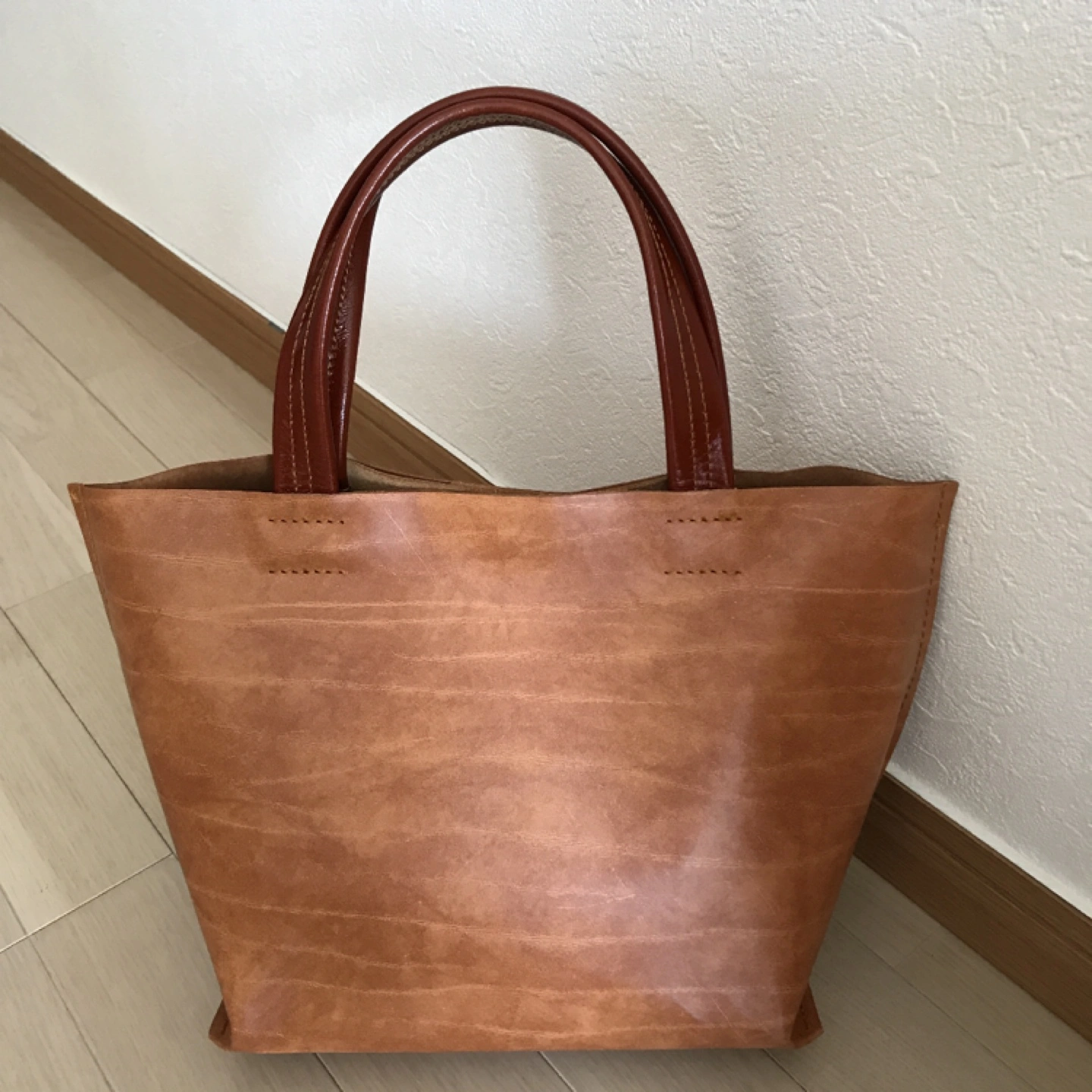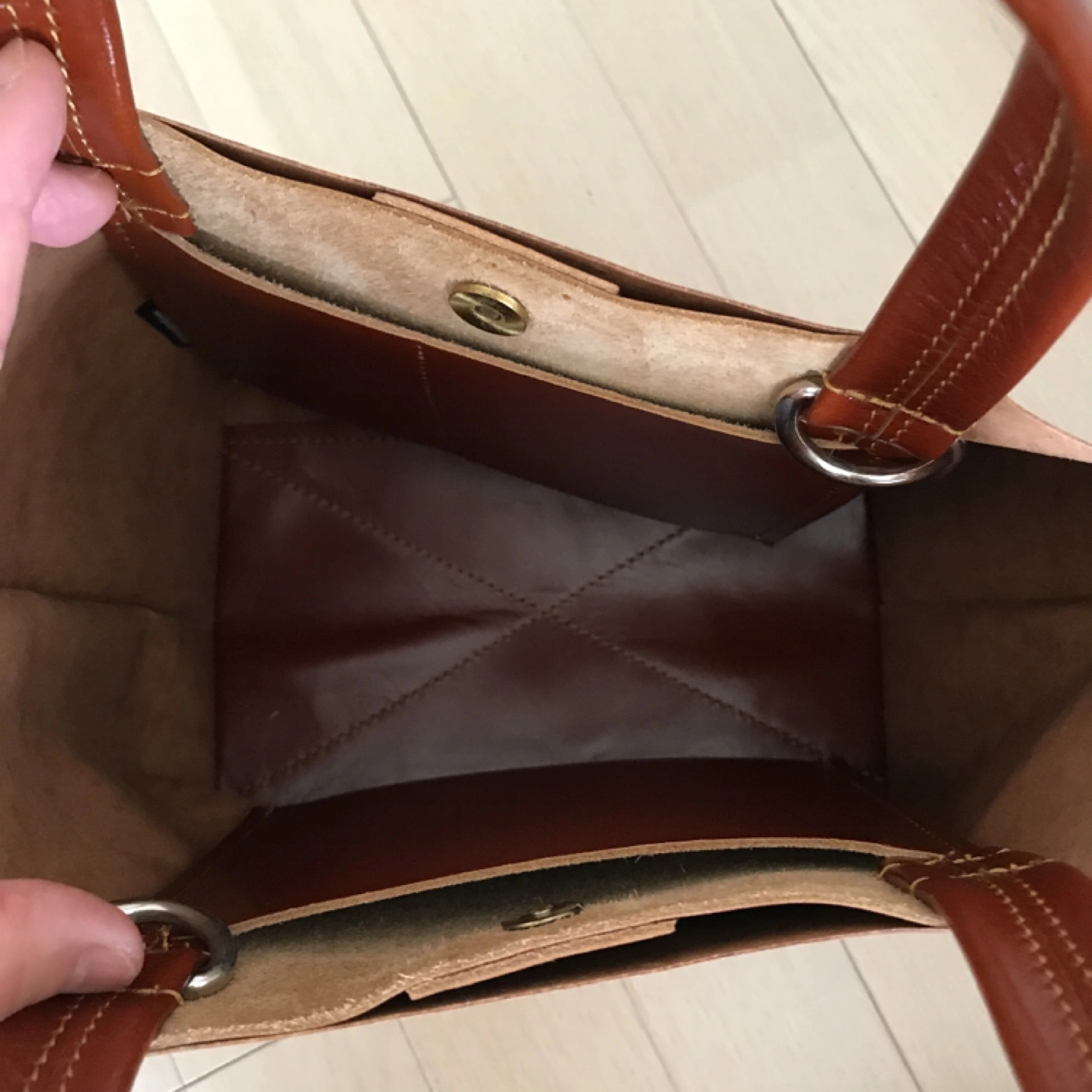 数年前に日本橋三越に期間限定で設置されたセレクトショップで2万円で購入したものです。 本革・一枚革のトートバッグで持ち手と内側のポケット&底にやや赤みがかった革を使用しているところがかわいいです。 ショルダーバッグとしても使用出来るよう内側に紐を付ける金具がありますが、購入時からショルダー用の紐は付いていませんでした。 内側ポケットは両サイドに付いており、そのうち一つは真ん中を縫ってありましたが、縫ってあることで使い辛かったため縫い目を解いてしまいました(写真3枚目)。 ポケットの縫い目を解いた以外は使用回数が少ないためキズや汚れもなく状態は良いです。 大きさ:高さ23㎝(持ち手は含まない) 持ち手高11㎝ 横幅34㎝(上部) 23㎝(下部) マチ14㎝ 重さ360g程 普通郵便で発送する予定ですが、発送中に破損や紛失が生じる可能性は否定出来ません。 発送トラブルが心配なた方にはプラス料金を頂き、ゆうパックに変更しますので購入前にお知らせ下さい。 #鞄#トートバッグ#手持ちバッグ#ミニトートバッグ#本革#革#レザー