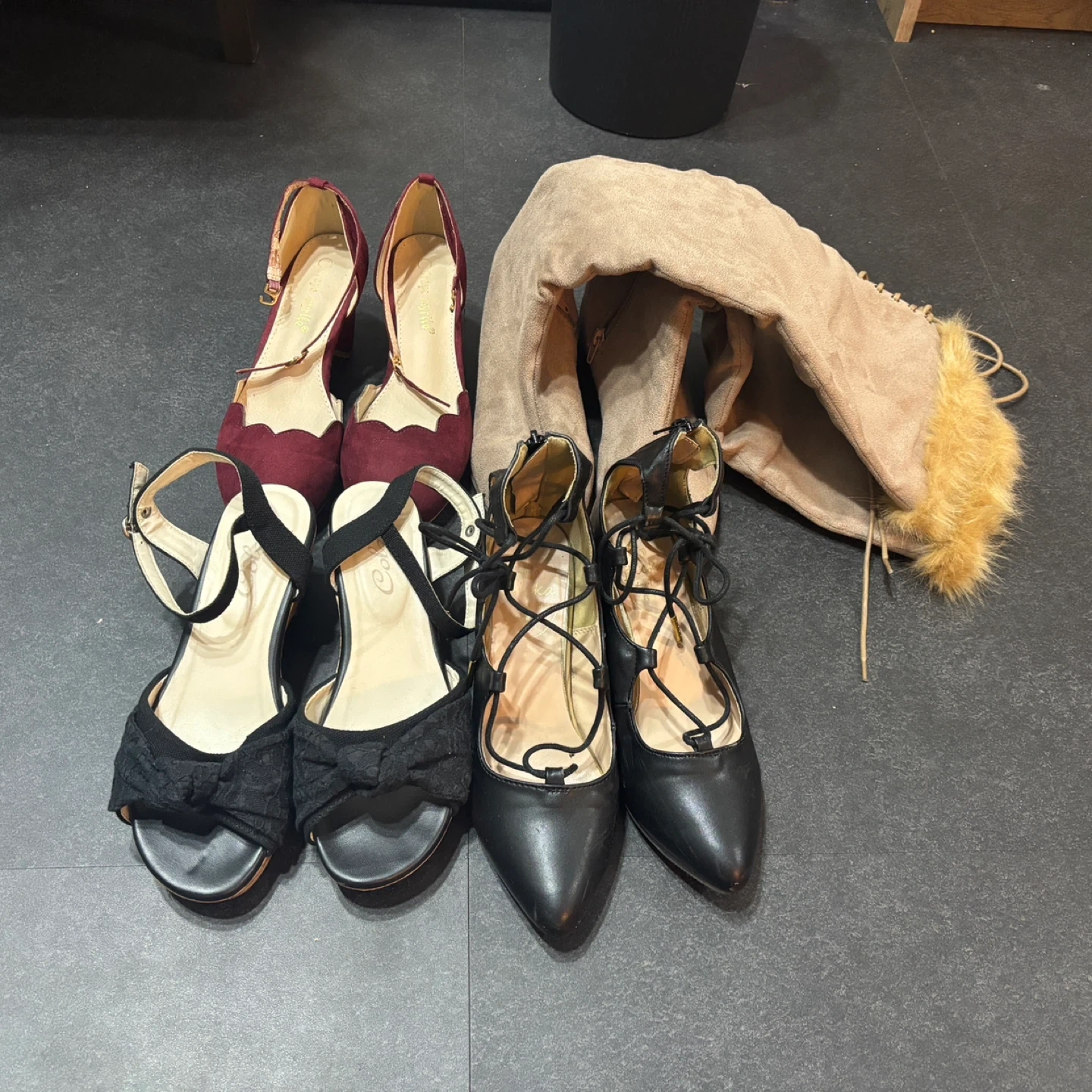 1点500円相当!!お買い得商品 ①左下 Honeys colzaブラック リボンフラットヒールサンダルLLサイズ こちらは多少の削れはありますが、表面はほとんど汚れなく非常に美品です。 ②右下 flicka レースアップパンプスLサイズ 多少削れはありますが、まだまだ綺麗に履けます。 これからの季節の服装に合います。 ③左上 crape myrtleワインレッドスウェード調パンプス サイズ39 ベルトに使用感がありますが、裏面なので目立ちません。こちらも秋、これからの季節におすすめです。フォーマルでもカジュアルでも欠かせない 一品です。 ④右上 Byebyeリボン ロングブーツベージュブラウンLサイズ こちら非常に美品です。目視できる傷がありません。 お譲り頂いたのですがサイズが合わないため、出品させていただいております。 #春服 #夏服 #秋服 #冬服 #レディース #靴 #24cm #サンダル #パンプス #ブーツ #まとめ売り #4点セット #美品 #おしゃれ #お得 #お買い得