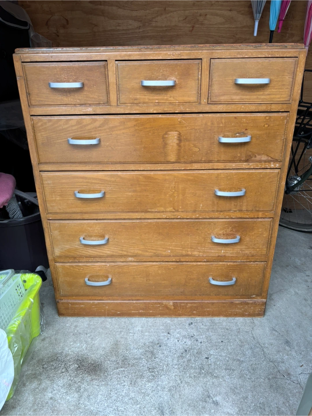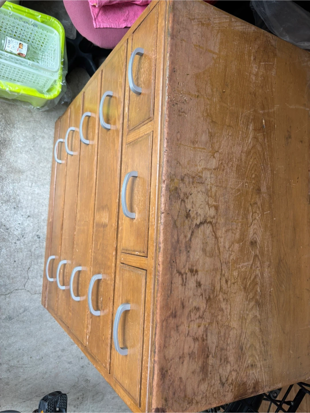 木製のチェストです。 かなり昔に友人のお父さんが作ったそうで、最近まで手芸道具を入れて使っていました。 持ち手は当初のものから変えて使っていました。 私としては使いやすかったのですが、引越しの為手放します。 合板ではないので、DIYなどされる方リメイクしていかがでしょうか? 持って行かれる日時わかれば、世田谷区赤堤の自宅前に置いておきます。 ・木製 ・引き出し7段 ・使用感、キズあり 中古品であることご了承ください