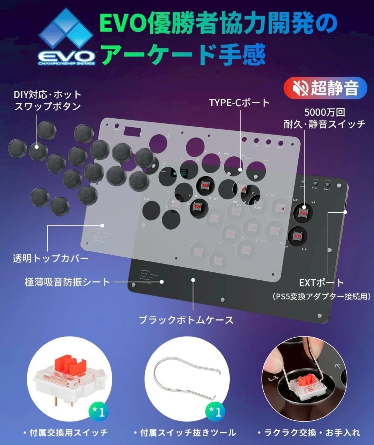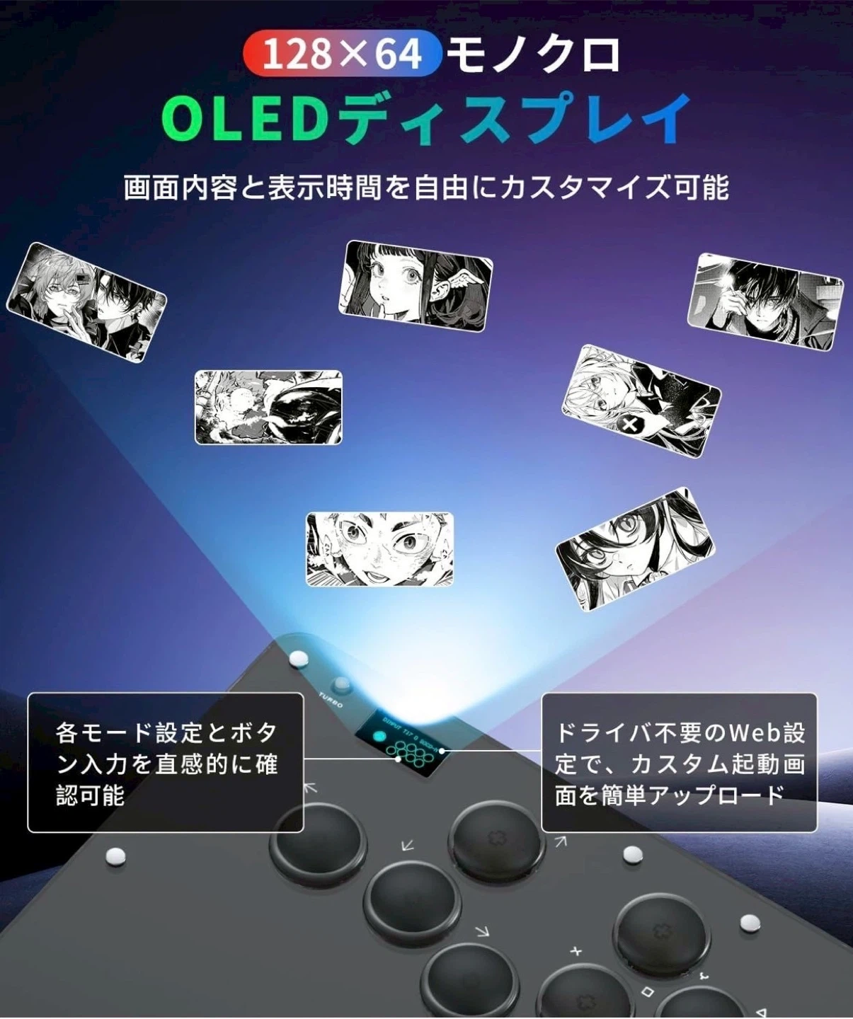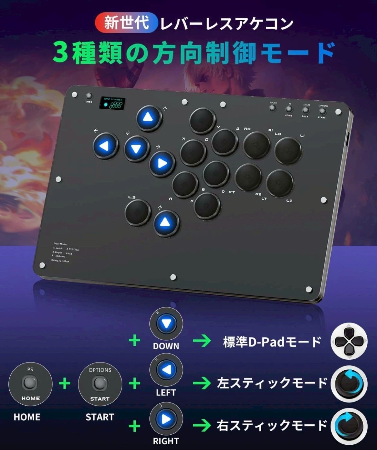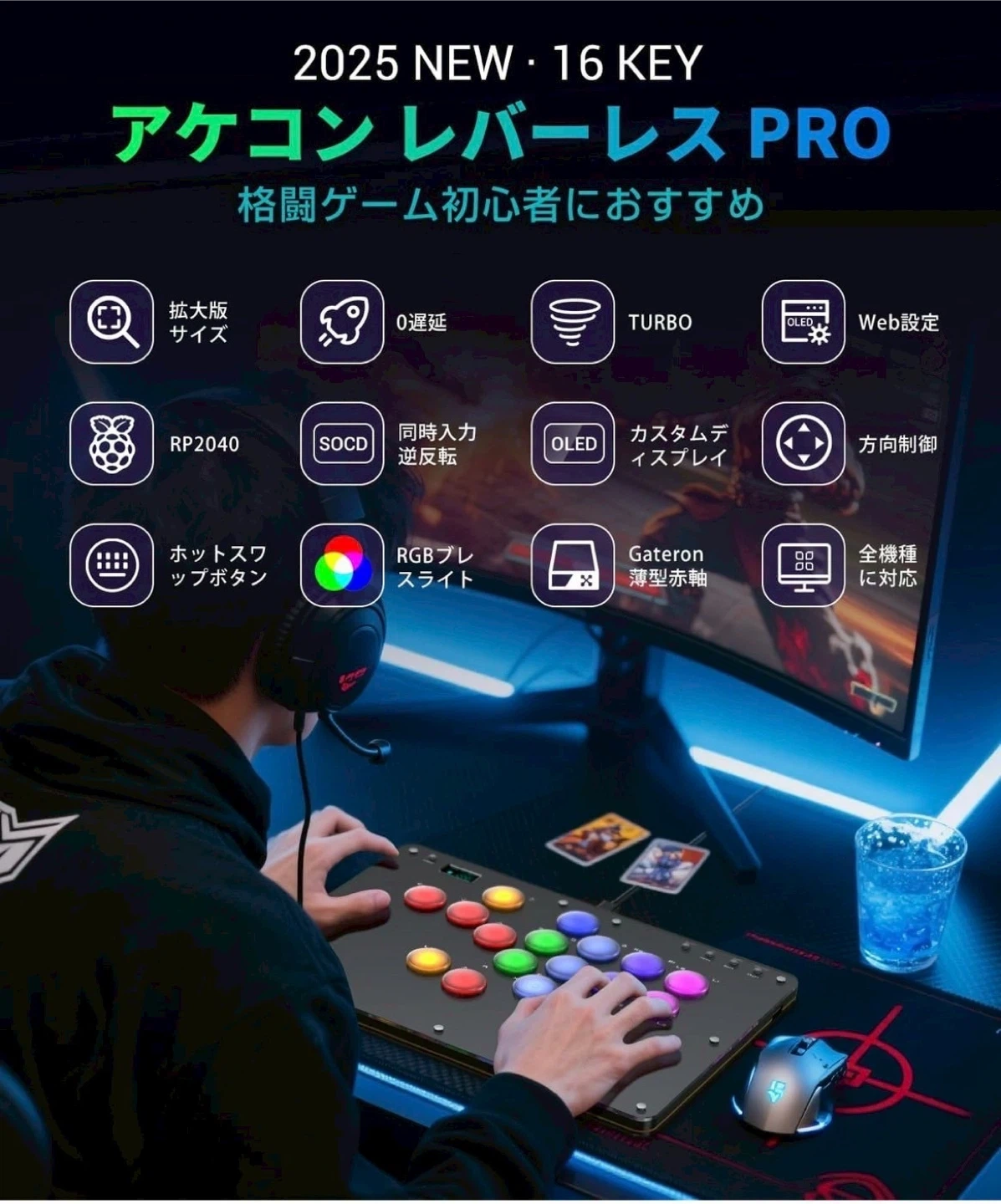 数ある中からご覧頂きありがとうございます(^○^) ◎値下げ交渉◎ ◎コメントなし、即購入大歓迎 ◎送料無料!安心の匿名配送 *。*。 \1品限り!!早い者勝ち!!/ ★商品説明★ 【2025年新開発 プロ仕様16ボタンレバーレス アケコン】 格ゲープロ選手監修による独自設計のall black一体型ボディに汚れ防止透明パネルを採用、指紋が付きにくいブラックマット仕様のボタンは押下時にダイナミックLED発光。SOCDクリーニング対応、0-30段階調整可能な連射機能、3種類の方向入力モード、ドライバ不要のWeb設定を搭載。高精度4方向ボタンと高速メカニカルスイッチにより入力ミスを大幅低減。従来の格ゲー コントローラーよりも入力速度が向上し、必殺技の発動がより素早く行え、戦闘性能が飛躍的に向上! 【超低入力遅延・デュアルコア高性能チップ・超薄型静音スイッチ】 コアハードにRaspberry Pi RP2040デュアルコアARM-M0プロセッサを採用し、遅延<1msでフレーム抜け率98%以上を確保。5000万回耐久のホットスワップ対応ショートストロークスイッチは超薄静音設計で、Cherryローライズスイッチと互換性あり。このアケコン レバーレスはトッププレート着脱式でスイッチ交換が容易、フルカラーバックプレートやDIY用白プレートも簡単に交換可能。 Windows 10以降/Steam Deck/PS3/PS4/Switch/Raspberry Pi/MiSTer/Android/Linux/iPadOS/macOSに対応。EXT拡張ポートを装備 PS5接続時は別売変換器が必要。 【OLED可視化スクリーン・カスタマイズ可能なRGBバックライト】 このアーケードコントローラーは128×64mm OLEDスクリーンと7色RGBバックライトを搭載。ウェブ設定で起動画面をカスタマイズ可能。各モード設定やボタン入力を視覚的に確認できます。 【快適なボタン配置・大型滑り止め設計】 このレバーレス アケコンは10×20cmから20×30cmに大型化したレバーレスアケコン。膝上でも安定し、どこでも快適にプレイ可能。入念に調整したボタン配置で、手の大小問わず操作しやすい。付属滑り止めパッド8個で激戦中も安定。