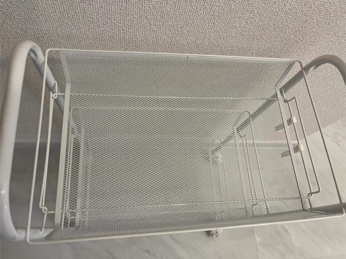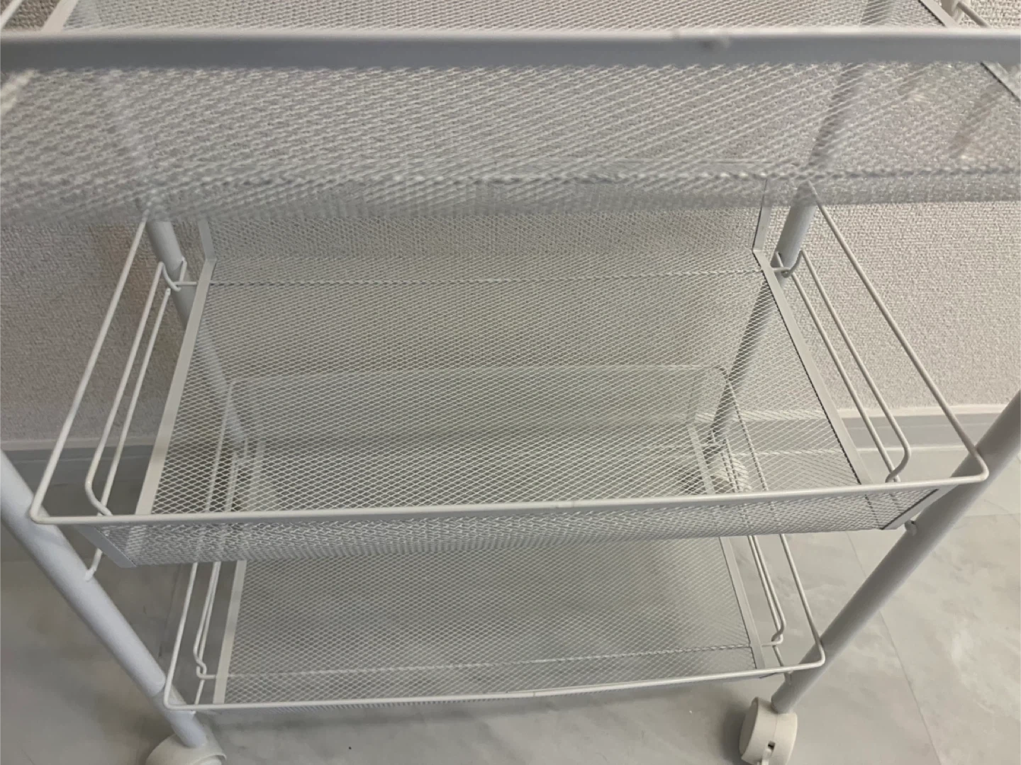 ご覧いただきありがとうございます。 白いワイヤーラック3段の出品です。 半年ほど使いました。 3点同じものを出品しています! ぜひご検討ください♪ 【状態】 目立つ傷や汚れなし 【重量】 約2kg 【サイズ】 約幅44.5×奥行27.5×高さ63.5cm ★押入れの下段にぴったりおさまるアイテムです! 【定価】 3,980円 ※中古品であることご了承ください※ 工具不要で組立簡単なメッシュスチール製ワゴン ミニサイズでとて も軽いので女性でも簡単に組立・移動ができます。 各段はメッシュ仕様になっており、通気性がよく汚れもたまりにくいワゴンです。