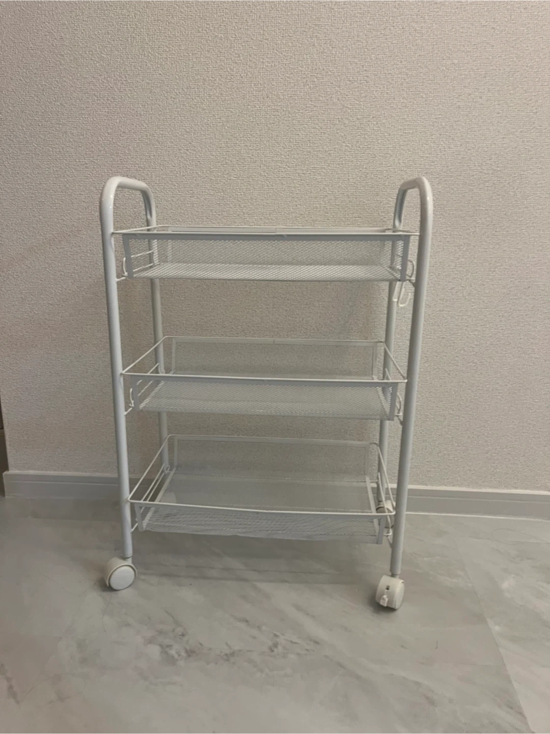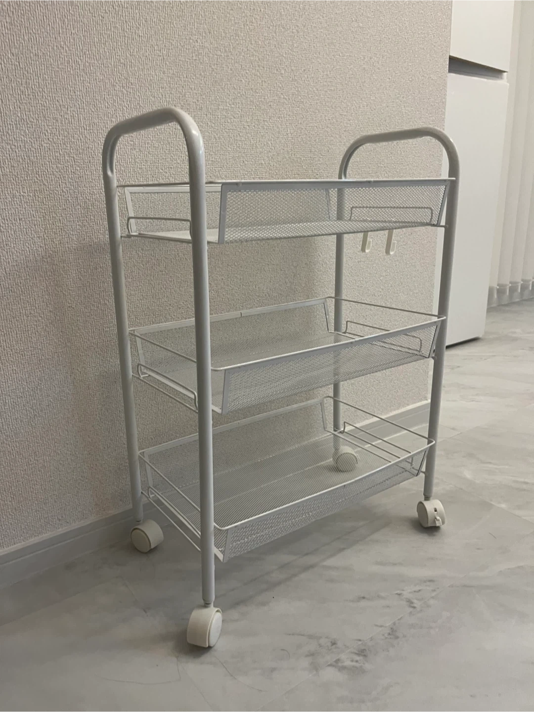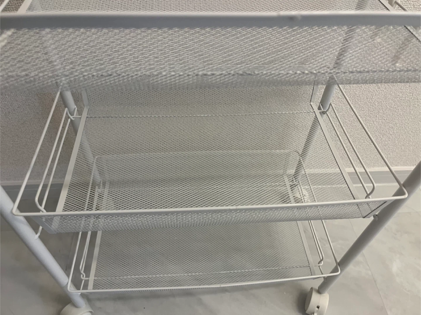 ご覧いただきありがとうございます。 白いワイヤーラック3段の出品です。 半年ほど使いました。 3点同じものを出品しています! ぜひご検討ください♪ (それぞれのラックのお写真希望の場合はコメントください。どれも状態は同じです!) 【状態】 目立つ傷や汚れなし 【重量】 約2kg 【サイズ】 約幅44.5×奥行27.5×高さ63.5cm ★押入れの下段にぴったりおさまるアイテムです! 【定価】 3,980円 ※中古品であることご了承ください※ 工具不要で組立簡単なメッシュスチール製ワゴン ミニサイズでとても軽いので女性でも簡単に組立・移動ができます。 各段はメッシュ仕様になっており、通気性がよく汚れもたまりにくいワゴンです。