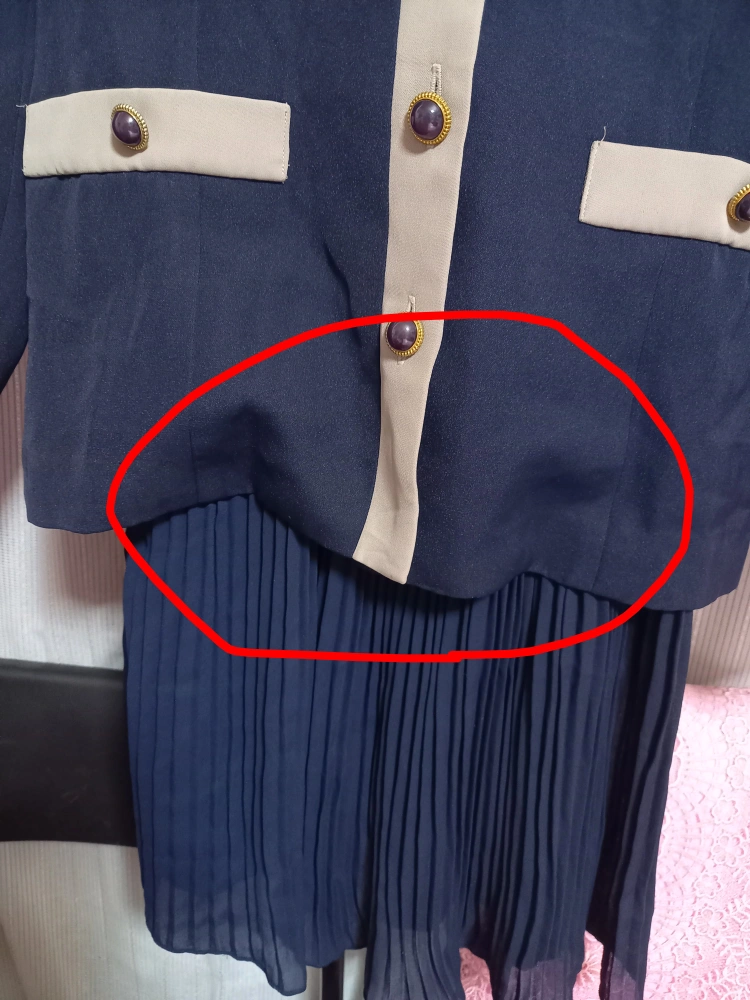 ワンピースMサイズ、ポリエステル   使用済みですが目立った汚れは見つかりませんが、赤丸の所が、引っ張られています 肩幅42センチ、バスト93センチ、袖丈56.5センチ、ウエスト60~83(ごむ) ヒップ104センチ、着丈92センチ