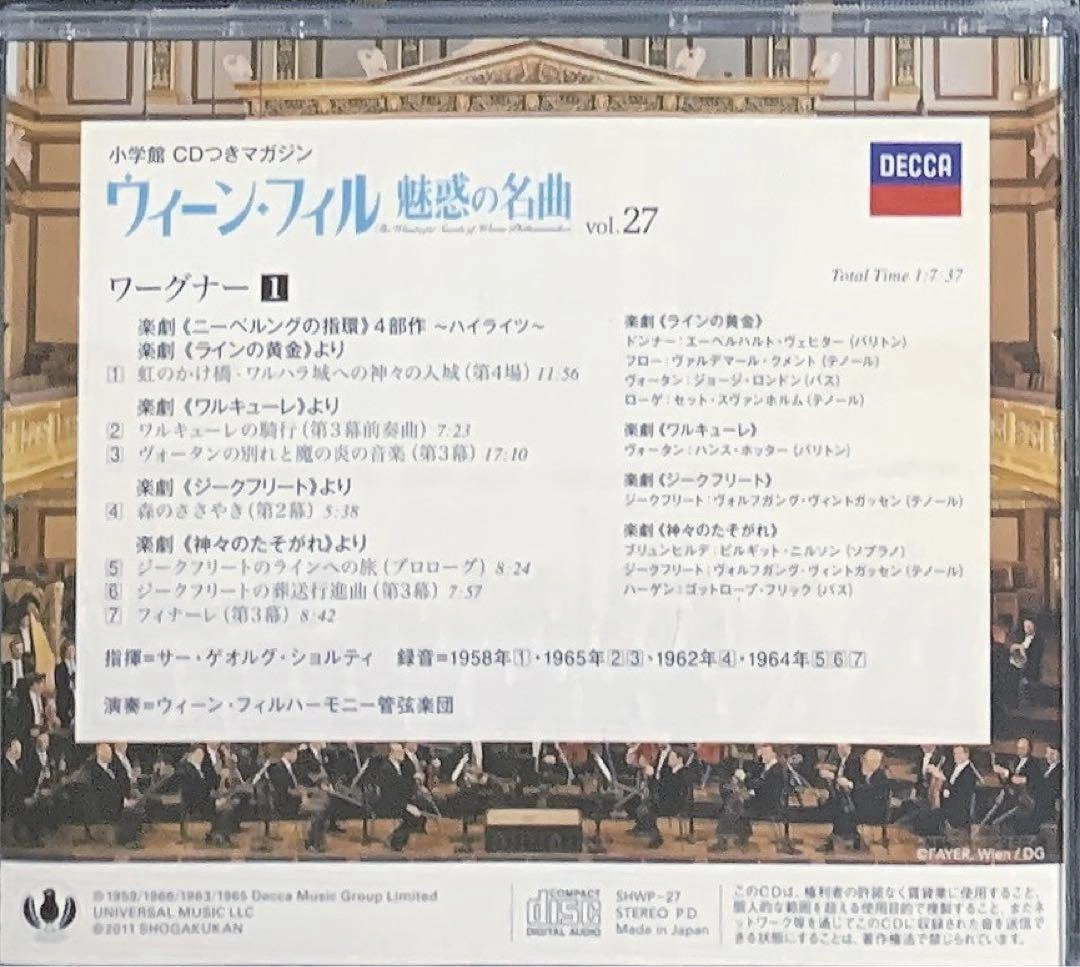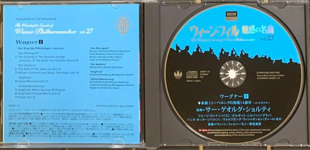 ウィーン・フィル、魅惑の名曲 vol. 27 DECCA ワーグナー1 楽劇<ニーベルングの指環)4部作~ハイライツ~ 楽劇(ラインの黄金)より [1]虹のかけ橋-ワルハラ城への神々の入城(第4場)11:56 楽劇(ワルキューレ)より [2]ワルキューレの行(第3幕前奏曲)7:23 ヴォータンの別れと魔の炎の音楽(第3幕)17:10 楽劇(ジークフリート)より [3]森のささやき(第2幕) 5:38 楽劇(神々のたそがれ)より [5]ジークフリートのラインへの旅(プロローグ)8:24 [6]ジークフリートの葬送行進曲(第3幕)7:57 [7]フィナーレ(第3落)8:42 Total Time 1:7:37 [1]楽劇(ラインの黄金) ドンナー:エーベルハルト・ヴェヒター(バリトン) フロー:ヴァルデマール・クメント(テノール) ヴォータン:ジョージ・ロンドン(バス) ローゲ:セット・スヴァンホルム(テノール) [2]楽劇(ワルキューレ) ヴォータン:ハンス・ホッター(バリトン) [3]楽劇(ジークフリート) ジークフリート:ヴォルフガング・ヴィントガッセン(テノール) [4]楽劇(神々のたそがれ) ブリュンヒルデ:ビルギット・ニルソン(ソプラノ) ジークフリート:ヴォルフガング・ヴィントガッセン(テノール) ハーゲン:ゴットローブ・フリック(バス) 指揮=サー・ゲオルグ・ショルティ 録音=1958年1・1965年23・1962年・1964年56[7 演奏=ウィーン・フィルハーモニー管弦楽団 1959/1966/1963/1965 Decca Music Group Limited NIVERSAL MUSIC LLC ご希望の方はお気軽にご連絡ください。