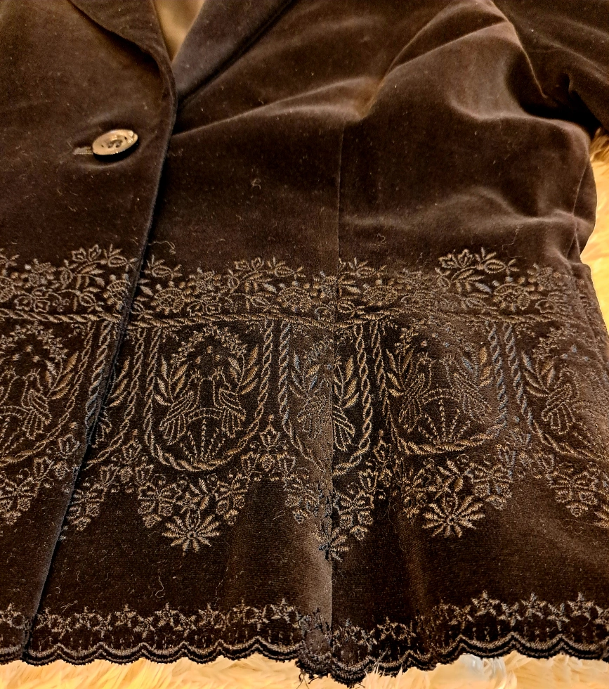 黒のベルベット素材に刺繍が施されたテーラードジャケット。 結婚式の二次会に一度のみ着用。 - 色: 黒 - 素材: ベルベット - デザイン: 刺繍入り - スタイル: テーラードジャケット - ボタン: 1つのボタン