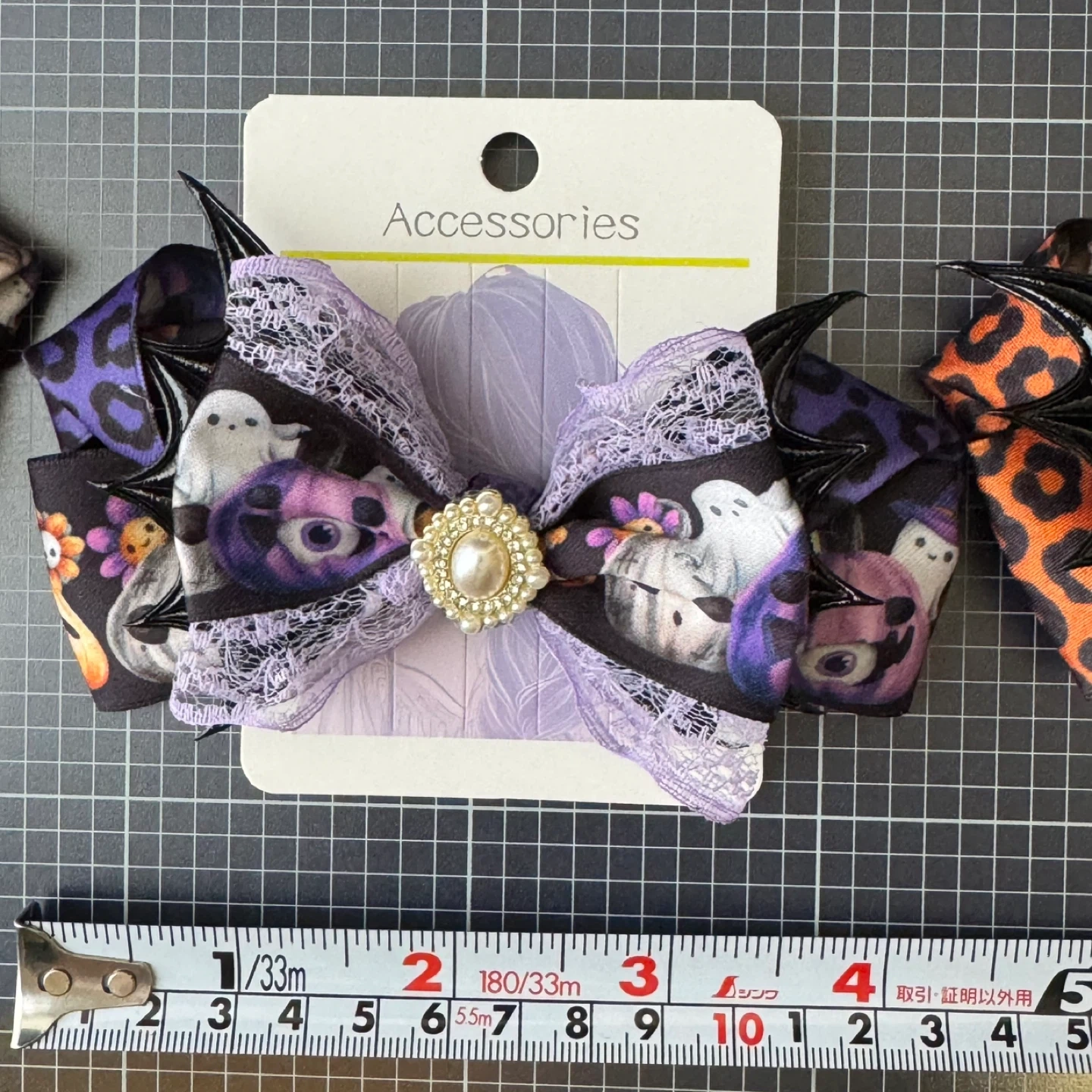 ハロウィンの季節にぴったりな、存在感たっぷりのハンドメイドヘアゴムです。 約13cmの大きめサイズで、まとめ髪やポニーテールを華やかに彩ります。 🕸️ 特徴 • 一点一点手作りのため一点物 • 約13cmの存在感でコーディネートのアクセントに • ハロウィンパーティーやイベント、普段使いにもおすすめ 🎃 お子様から大人の方まで楽しめるデザインで、仮装アイテムとしても大活躍します。
