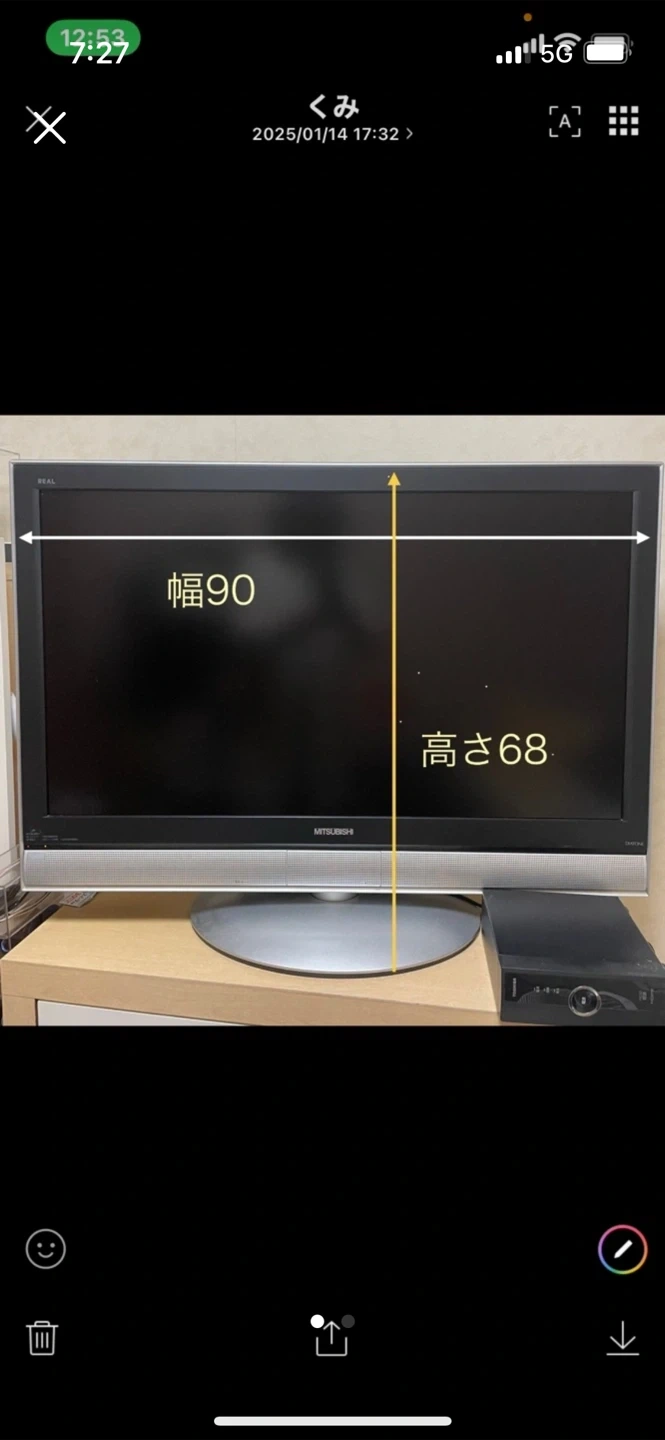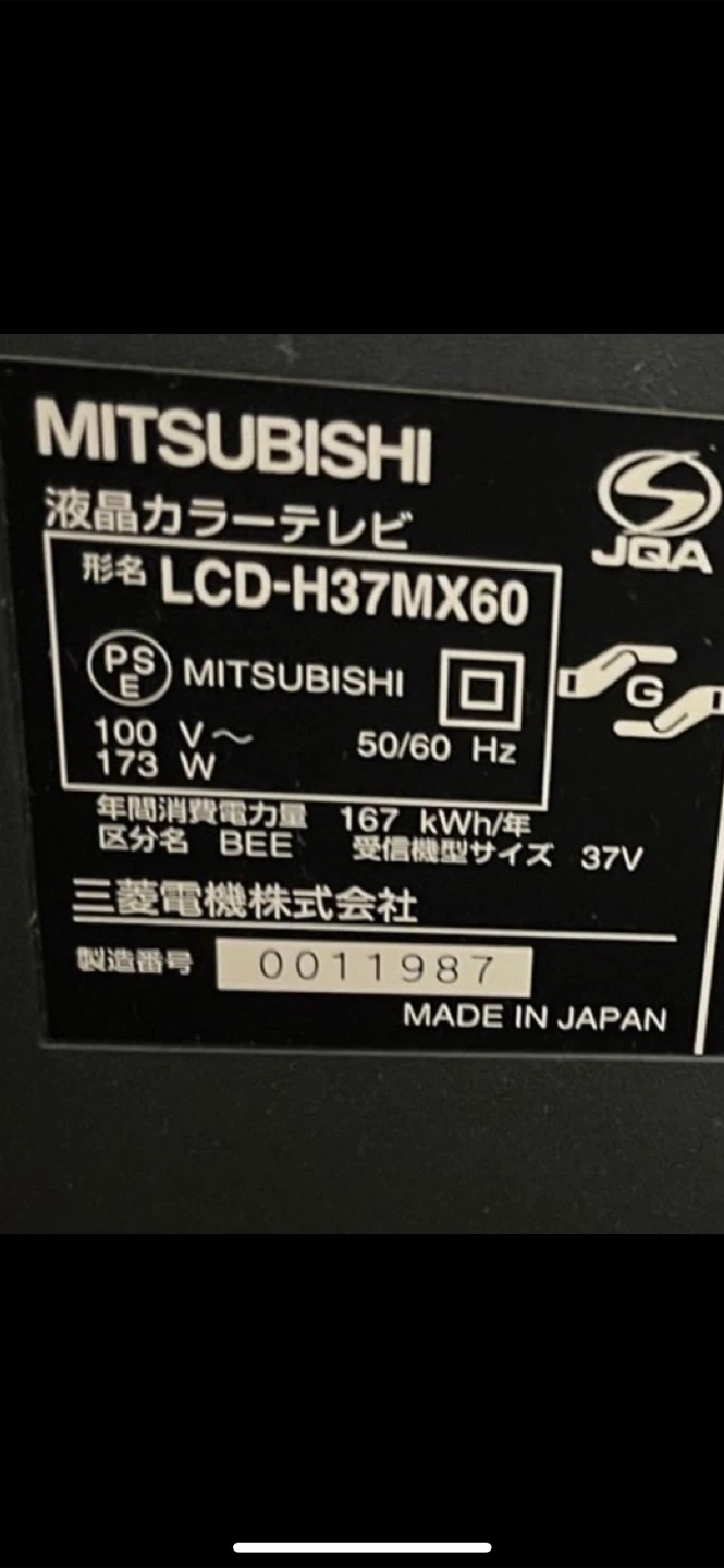 三菱の液晶カラーテレビです 【情報】 ブランド:三菱 (MITSUBISHI) 型番:LCD-H37MX60 サイズ:幅90cm、高さ68cm、37V型 【状態】 多少の傷はありますが きれいです。 こちらで半年前にキレイな状態で 譲っていただきました。 引越しにともない、お別れします。 クリーニングとメンテナンス済。 半年使用しました。 中古品であることご了承ください リモコンで左右ターンしますので 色々な角度にリモコン一つで変えれます。 一つの画面で 2つ画面に分けて同時に2番組 見ることができます。 BSもセットです。 説明書もあります。 コンセントとテレビアンテナに差し込むだけで動く設定、コードつけたままの お渡しも可能です。 受け取り場所 月島駅周辺