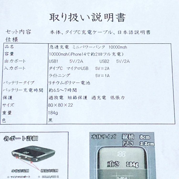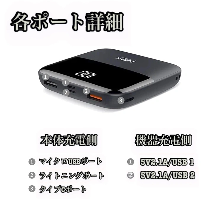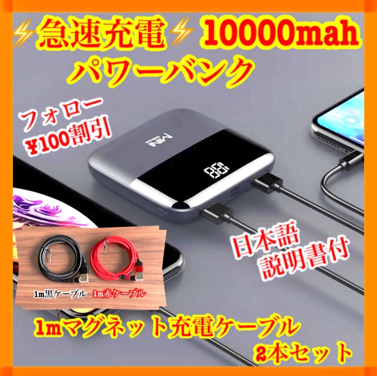 充電したいのに充電する場所がない、、、 コンセントが見当たらない、、、 このご時世、スマホの充電がなくなったら中々厳しくないですか? 今回はオシャレなモバイルバッテリーと1mのマグネット充電ケーブル2本をセットで販売いたします。 セット販売に至っては、モバイルバッテリー自体にケーブルが付いているとマグネット充電派には使い難いですよね? そこで、マグネット充電派にも嬉しい1mのマグネット充電ケ ーブルを2本付けてのセット販売に至りました。 サイズ 8cm×8cm×2.2cm 重量 184g 色 黒 容量 10000mah バッテリー本体への充電 ライトニング、マイクロUSB、タイプCの 3タイプで充電出来ます。 ※便利なマグネット端子使用可能 機器への充電 5V2.1A/USBが2ポート ※セットのマグネットケーブル使えます。 バッテリー本体への充電時間 約6〜7時間 機器への充電回数 iPhoneフル充電約2回分 機器への充電時間 スマホの電池容量とモバイルバッテリーの電力量により異なるが、22.5w急速充電で約3時間 複数のセキュリティ(画像3枚目) 【安心の返品返金保証】 CE、RoHS認証工場にて製作しております。 スマホの充電切れの不安を解消しましょう! 便利グッズはこちら #Earthの部屋