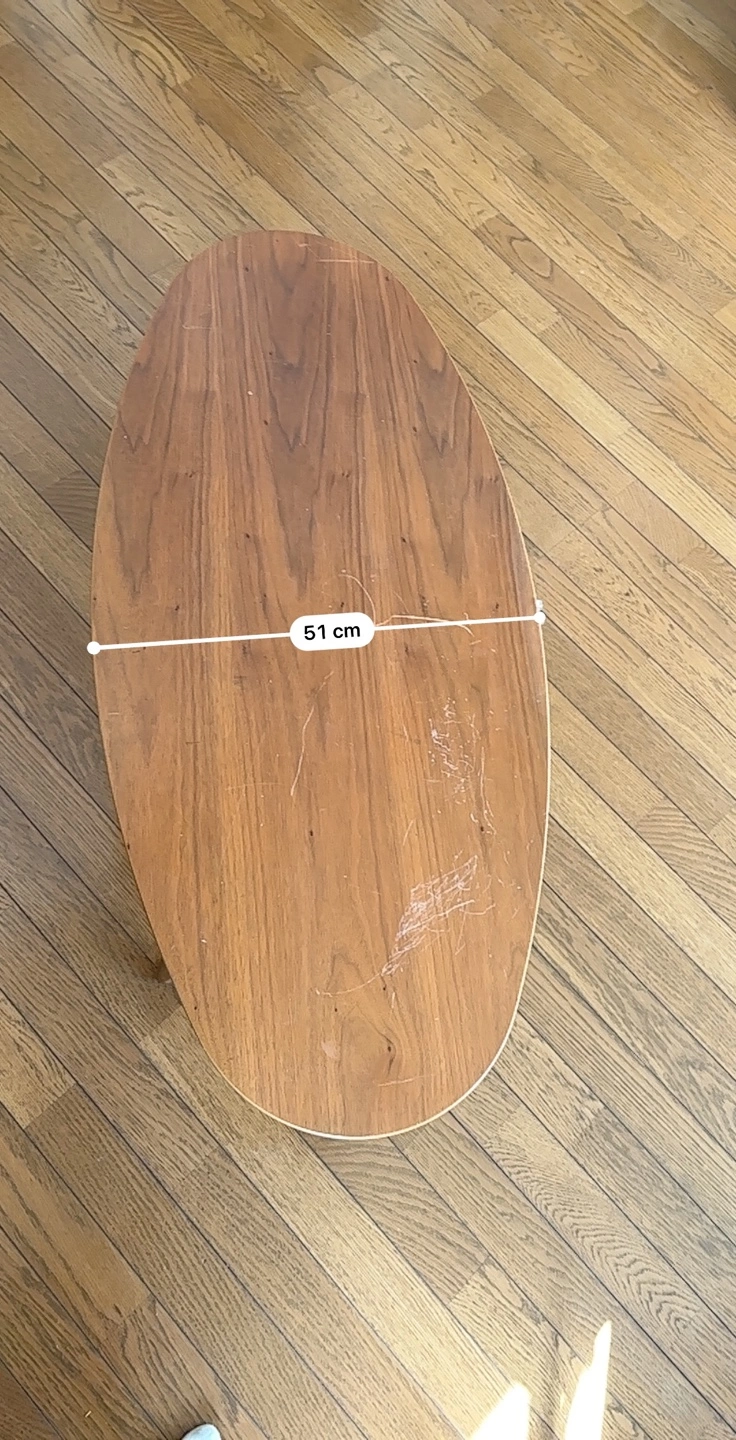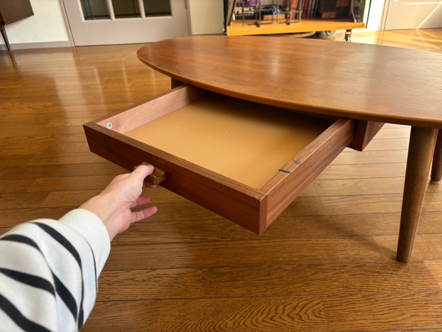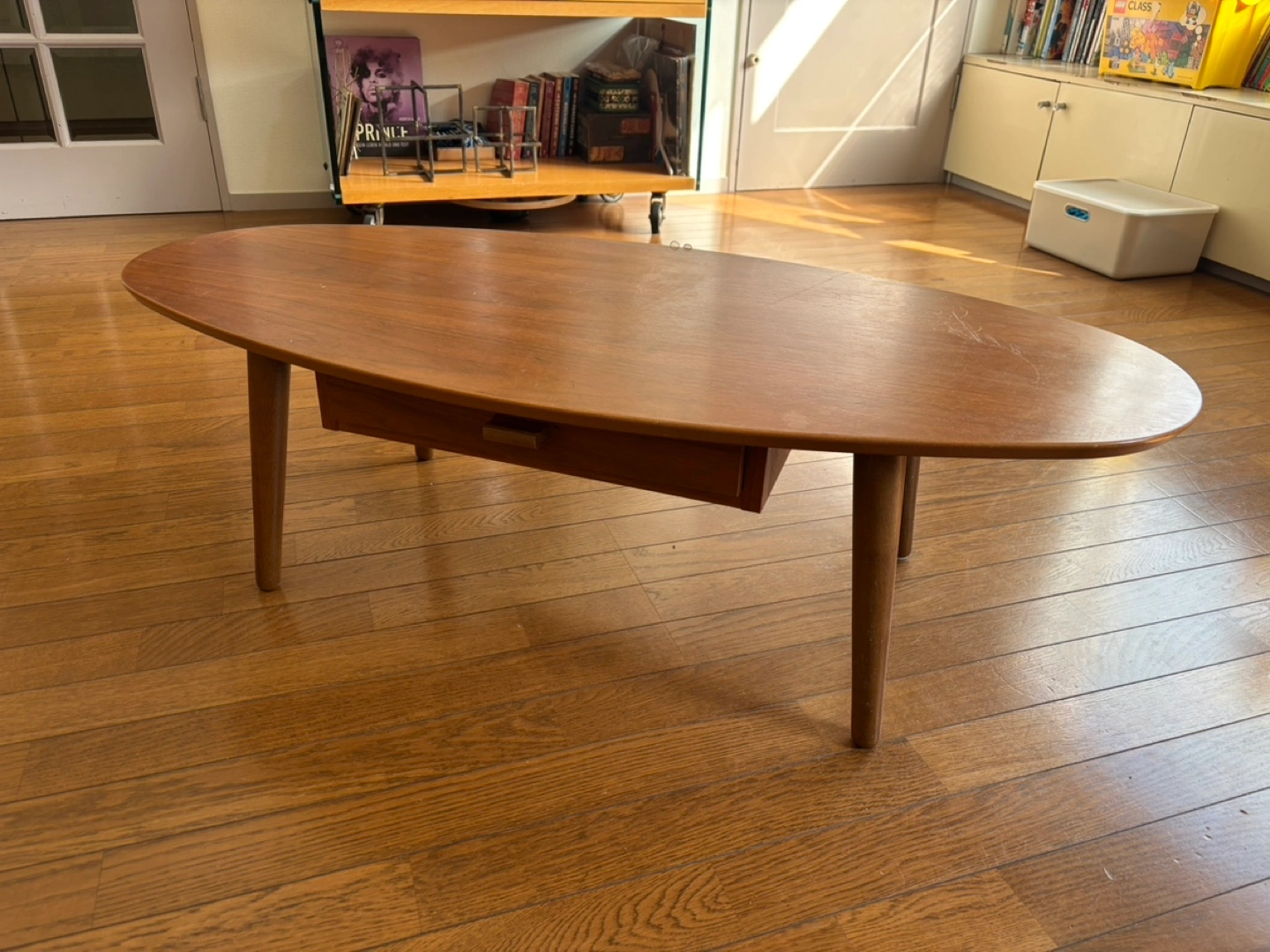 あたたかさミッドモダンセンチュリースタイル 中古楕円形コーヒーテーブル(引き出し付き) 表面に傷があり、リメイクに最適です。