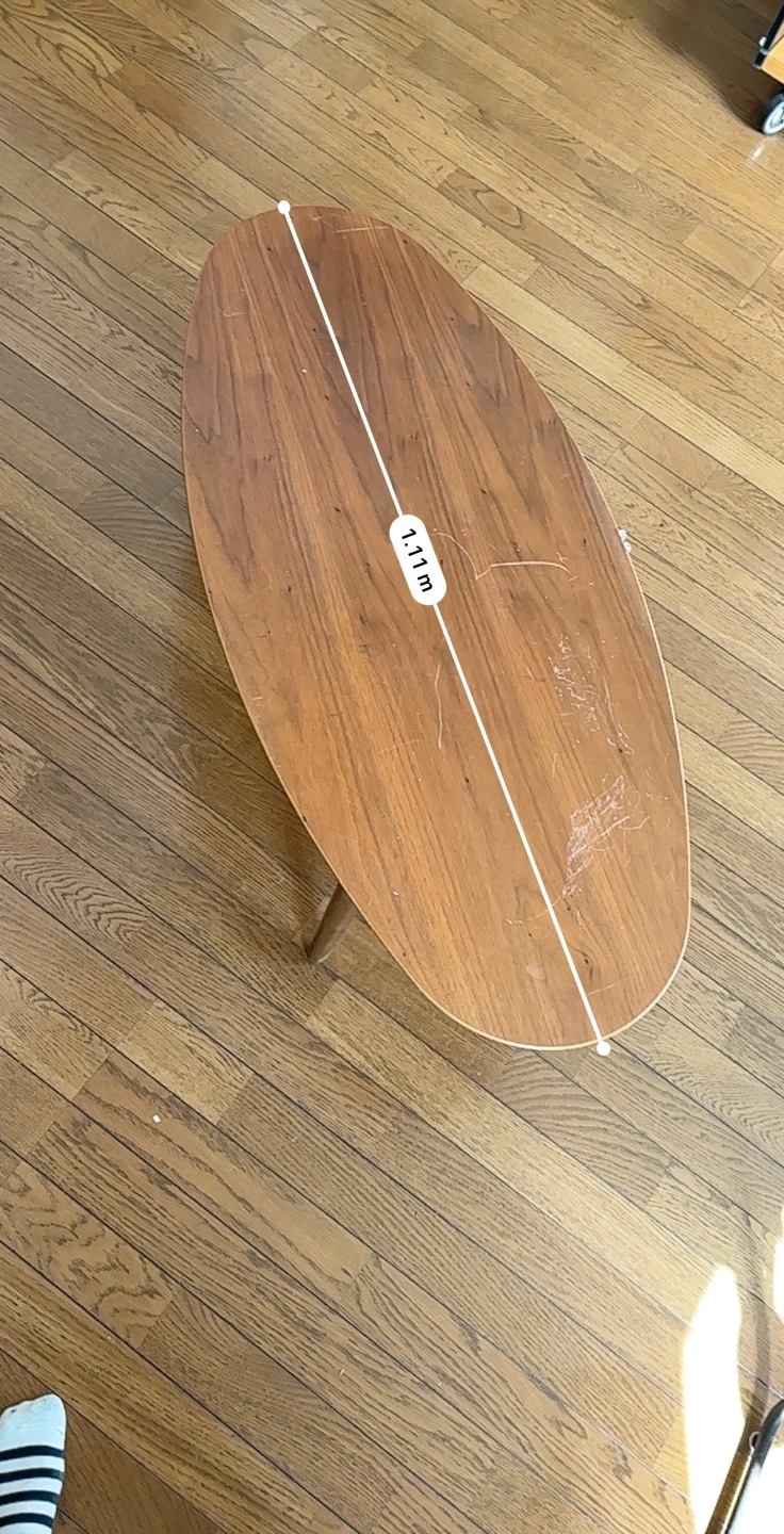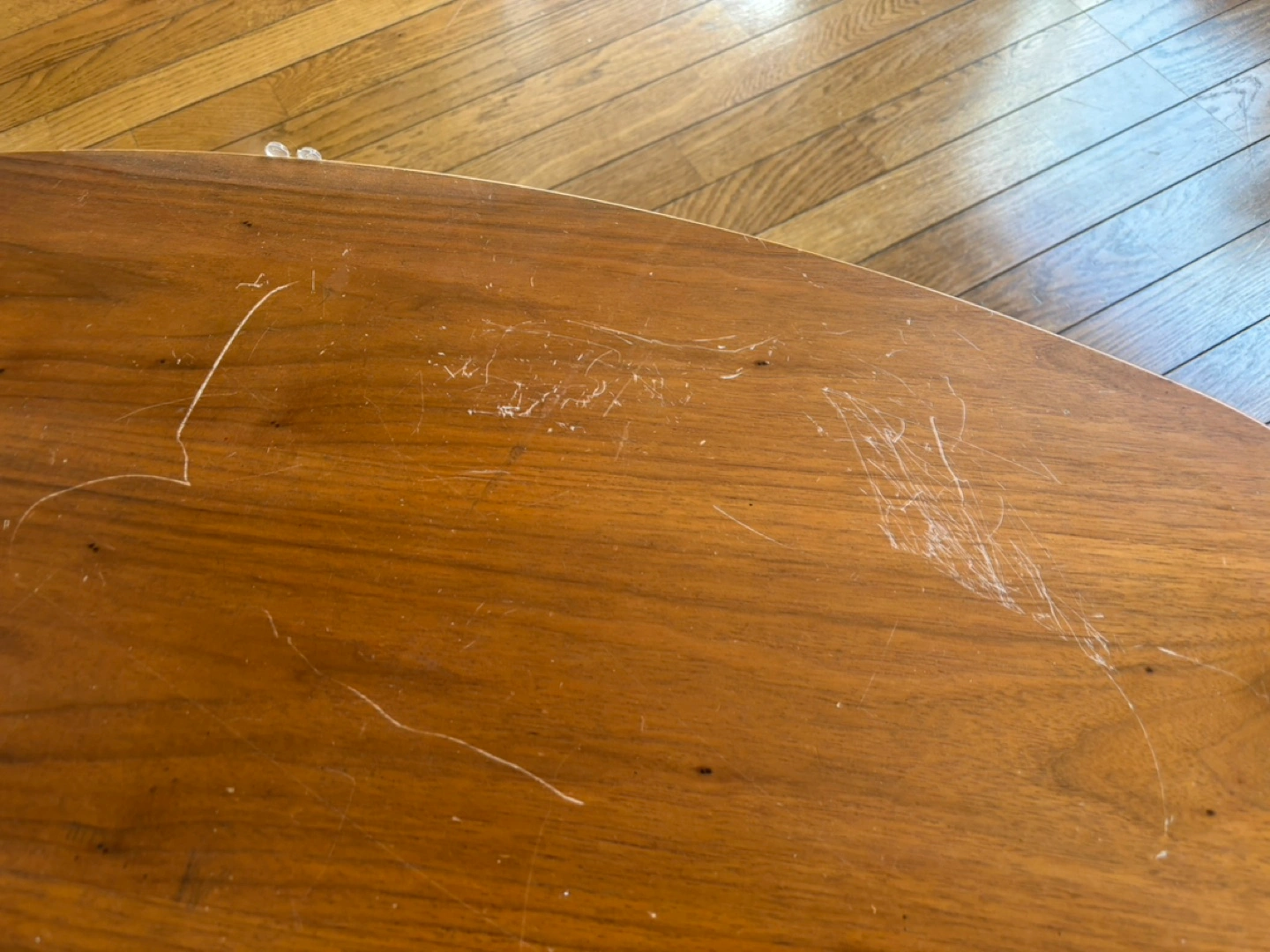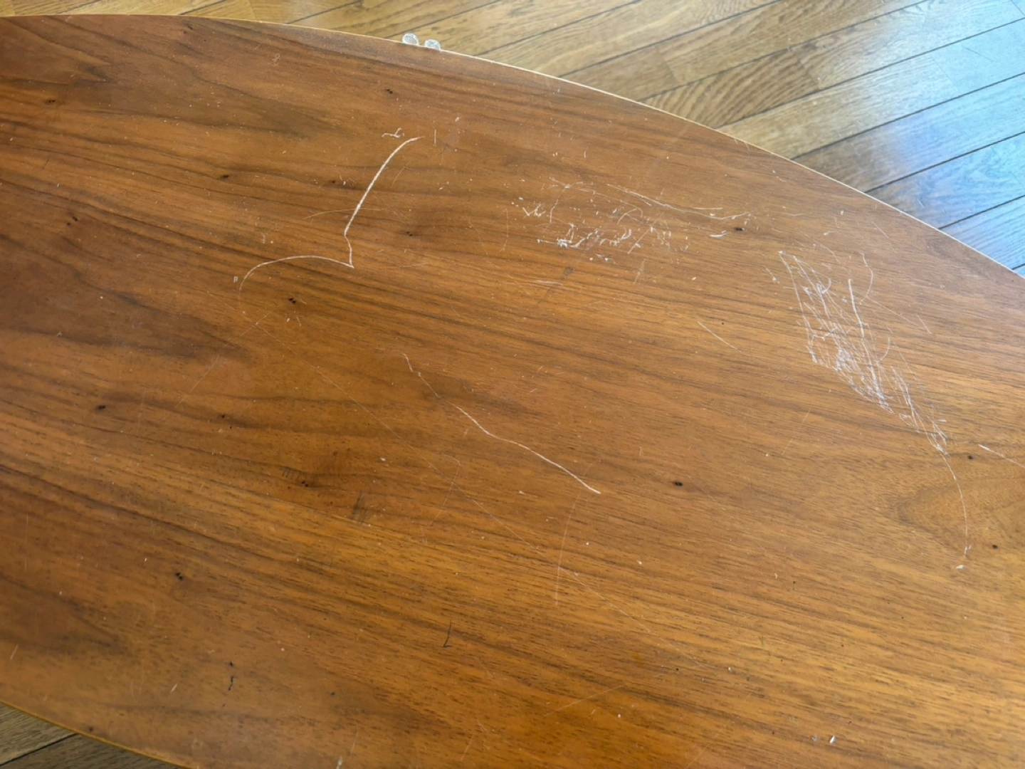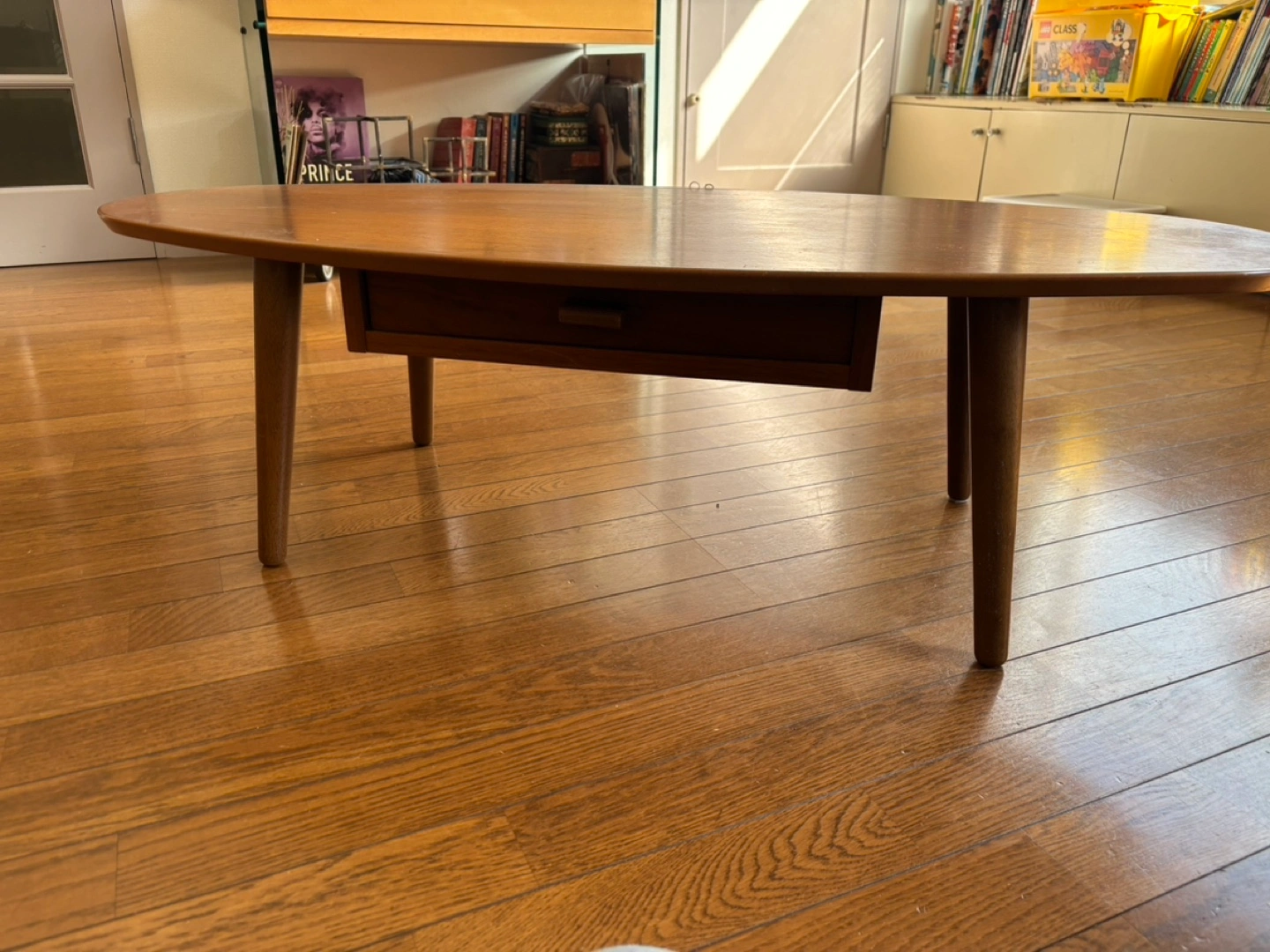 あたたかさミッドモダンセンチュリースタイル 中古楕円形コーヒーテーブル(引き出し付き) 表面に傷があり、リメイクに最適です。