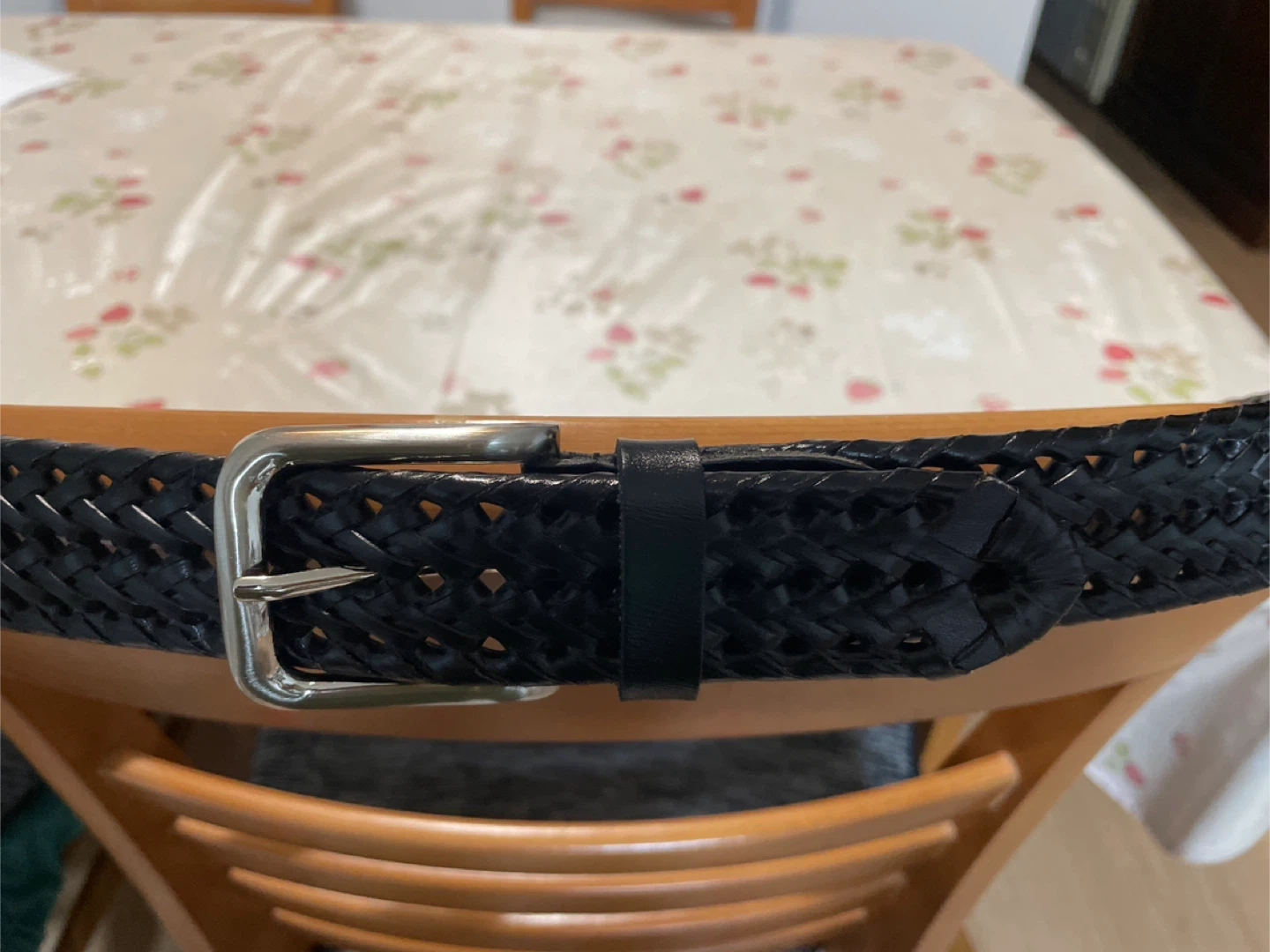 中古の編み込みのベルトです。メーカー不明。素材は天然皮革か合成か不明です。見た感じ、痛み等は感じられません。サイズ調整できないもので、全長115センチです。7枚目の写真の状態での長さ(腹囲相当)は、101〜102センチほどです。