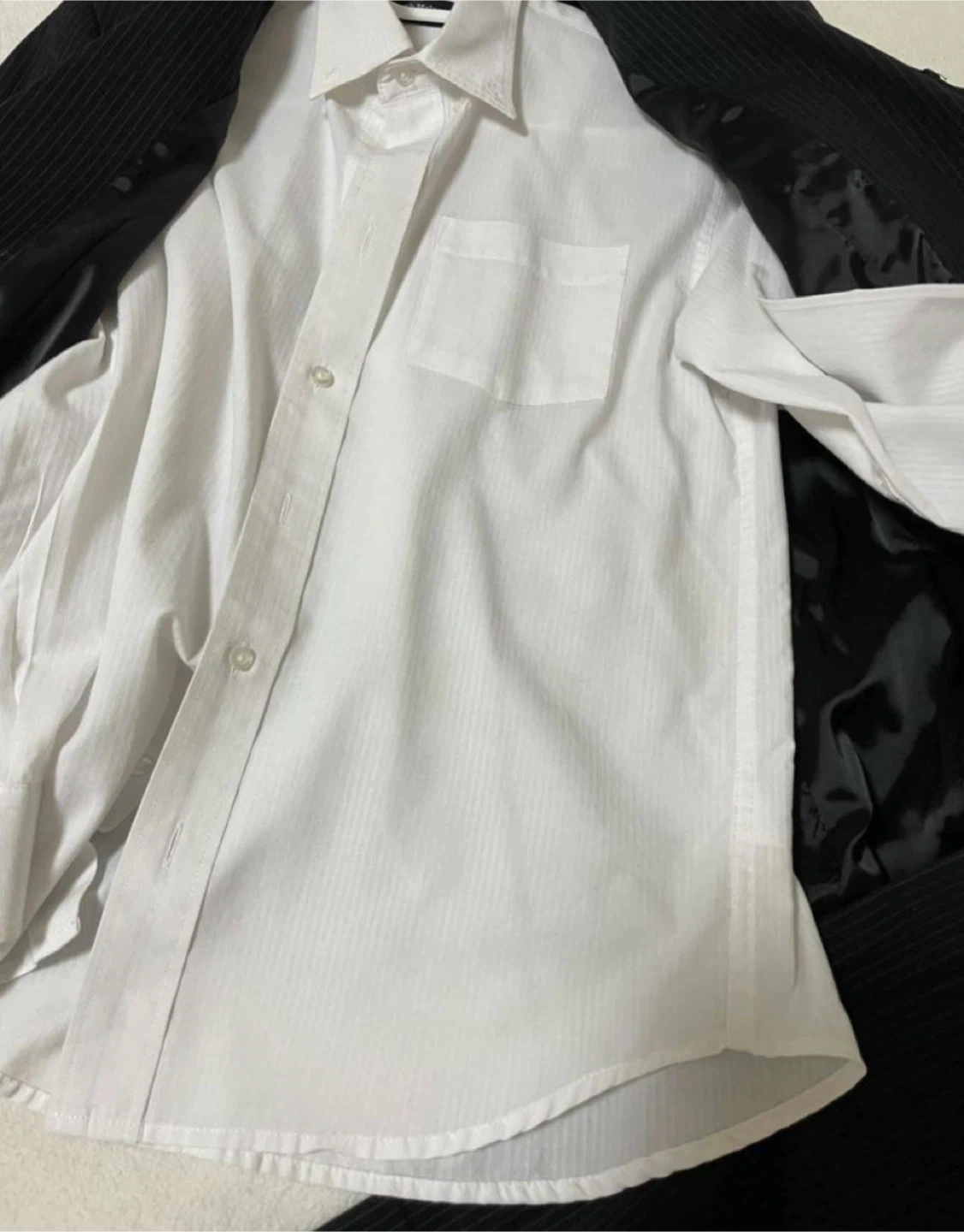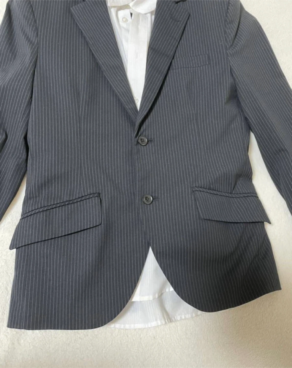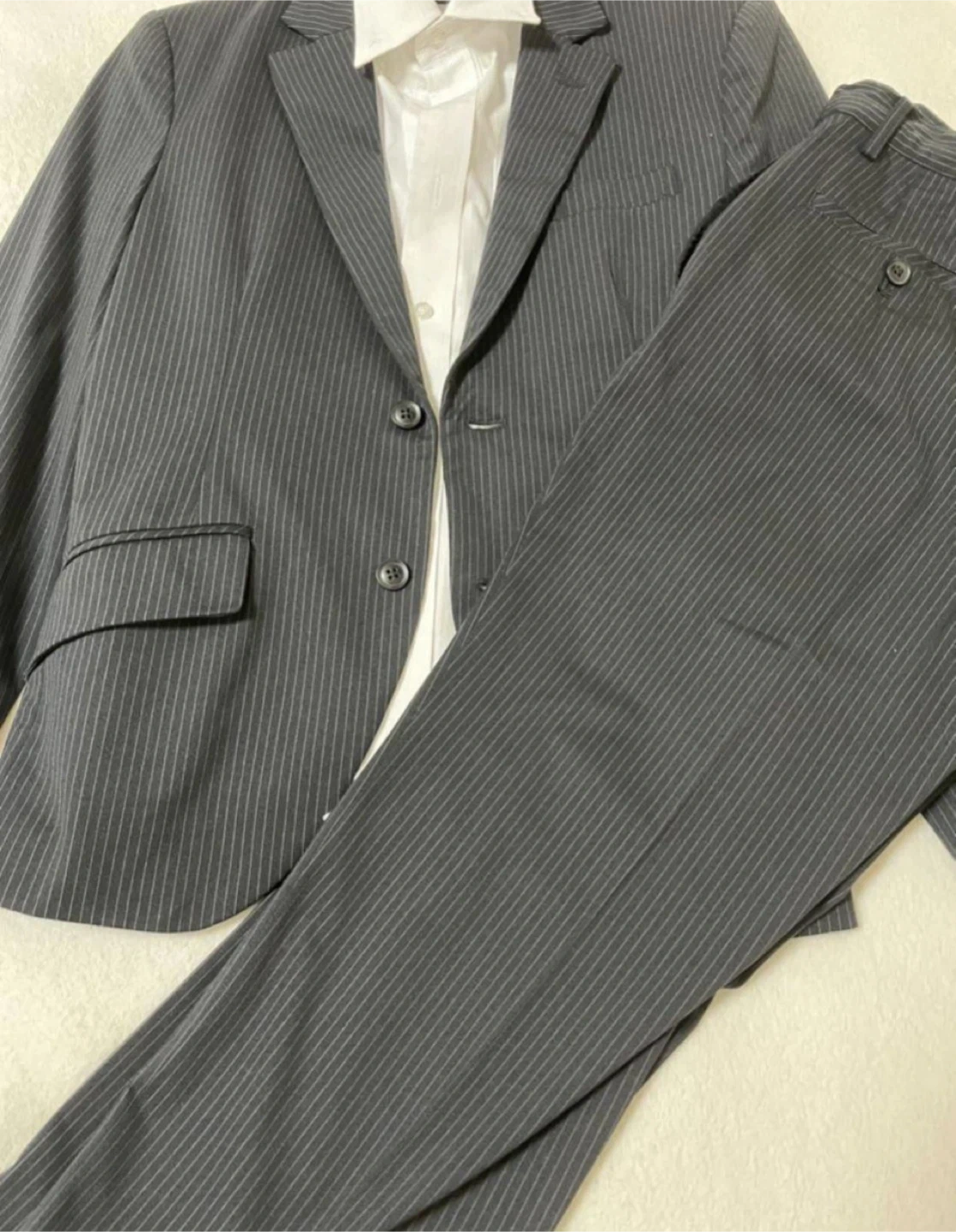 男児スーツ 3点セット 2時間程度使ったスーツです。 もともとシャツはついていませんでしたがお付けいたします。 シャツは(ジャケッ トを脱がなければ)見えない場所に薄い汚れがあります。その為おまけといたします。 お手持ちのものがあればそちらで合わせてもらうのも、いいと思います。 サイズ スーツ(上下)、おまけでシャツ 150㎝ クリーニング後保管しておりました。 ブラックのストライプかと思います。 手洗い可能みたいですので、気になる方はホームクリーニング等してください。