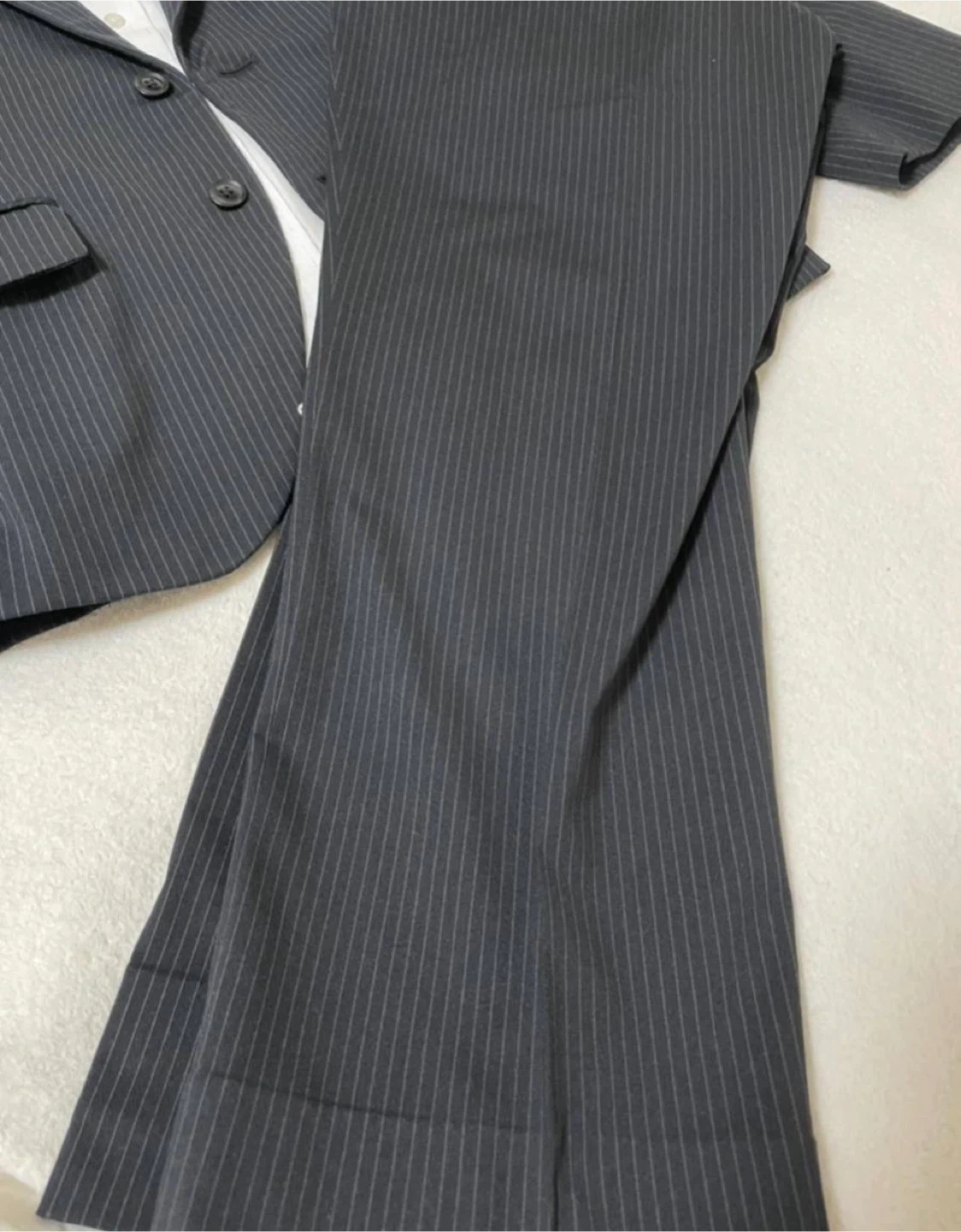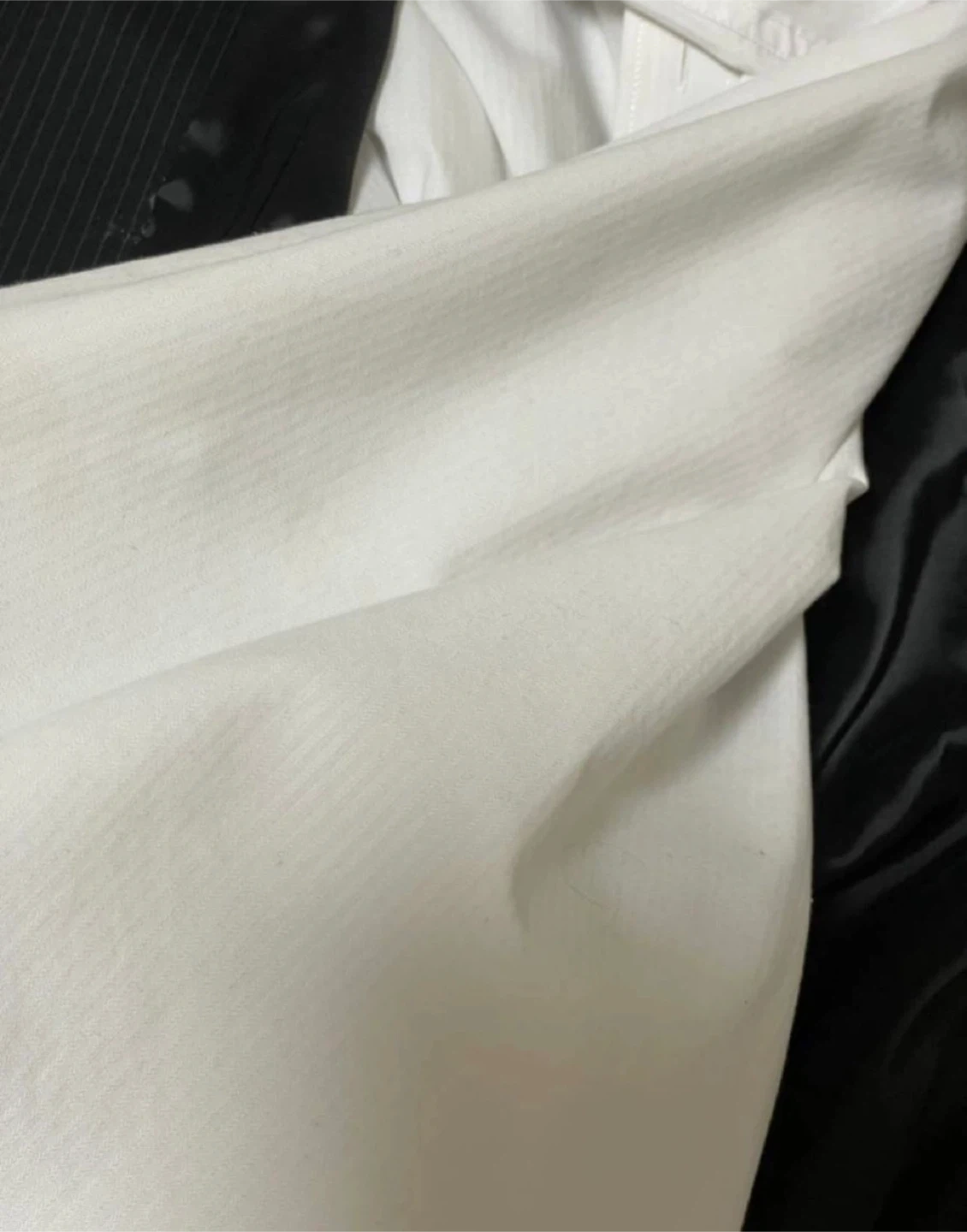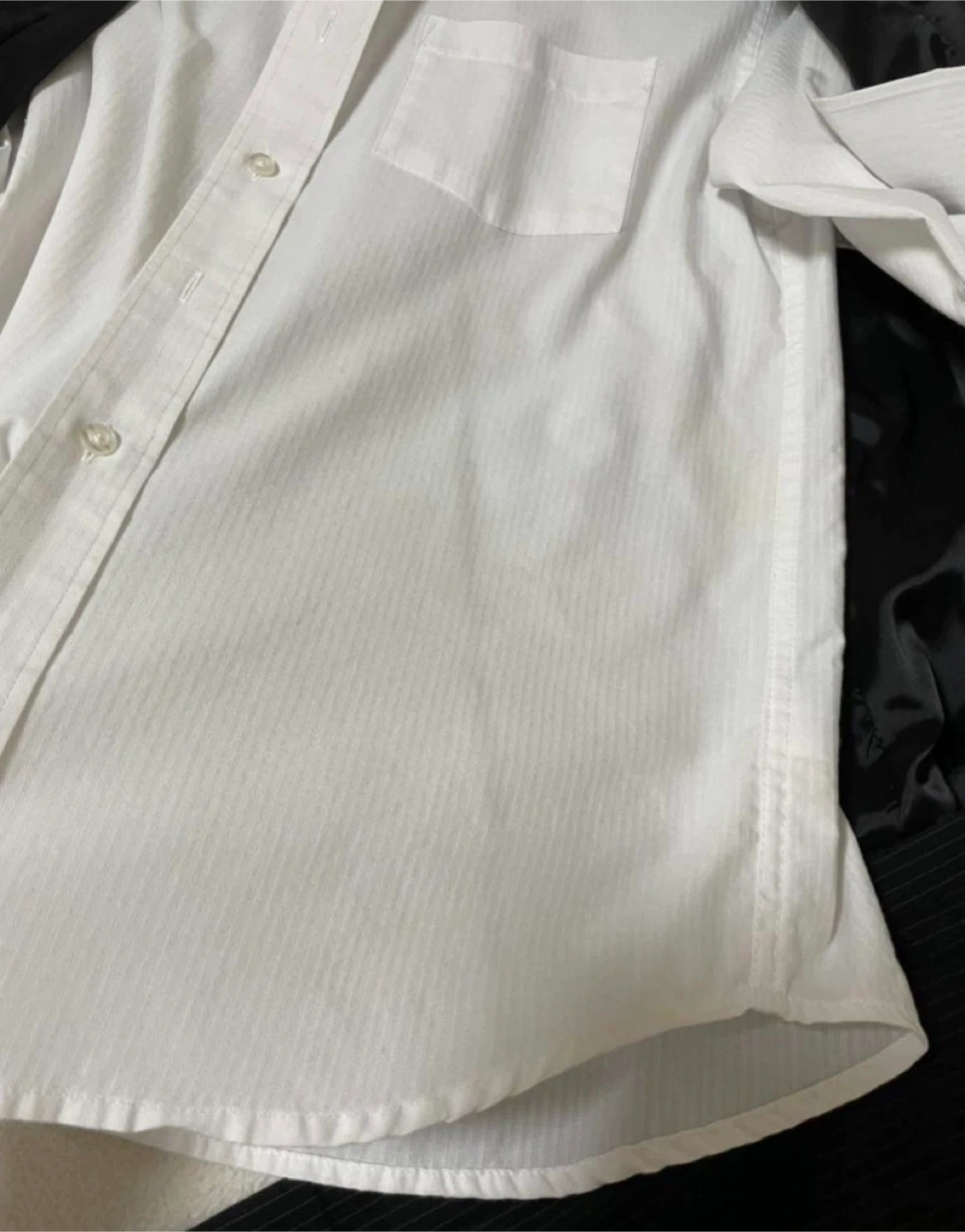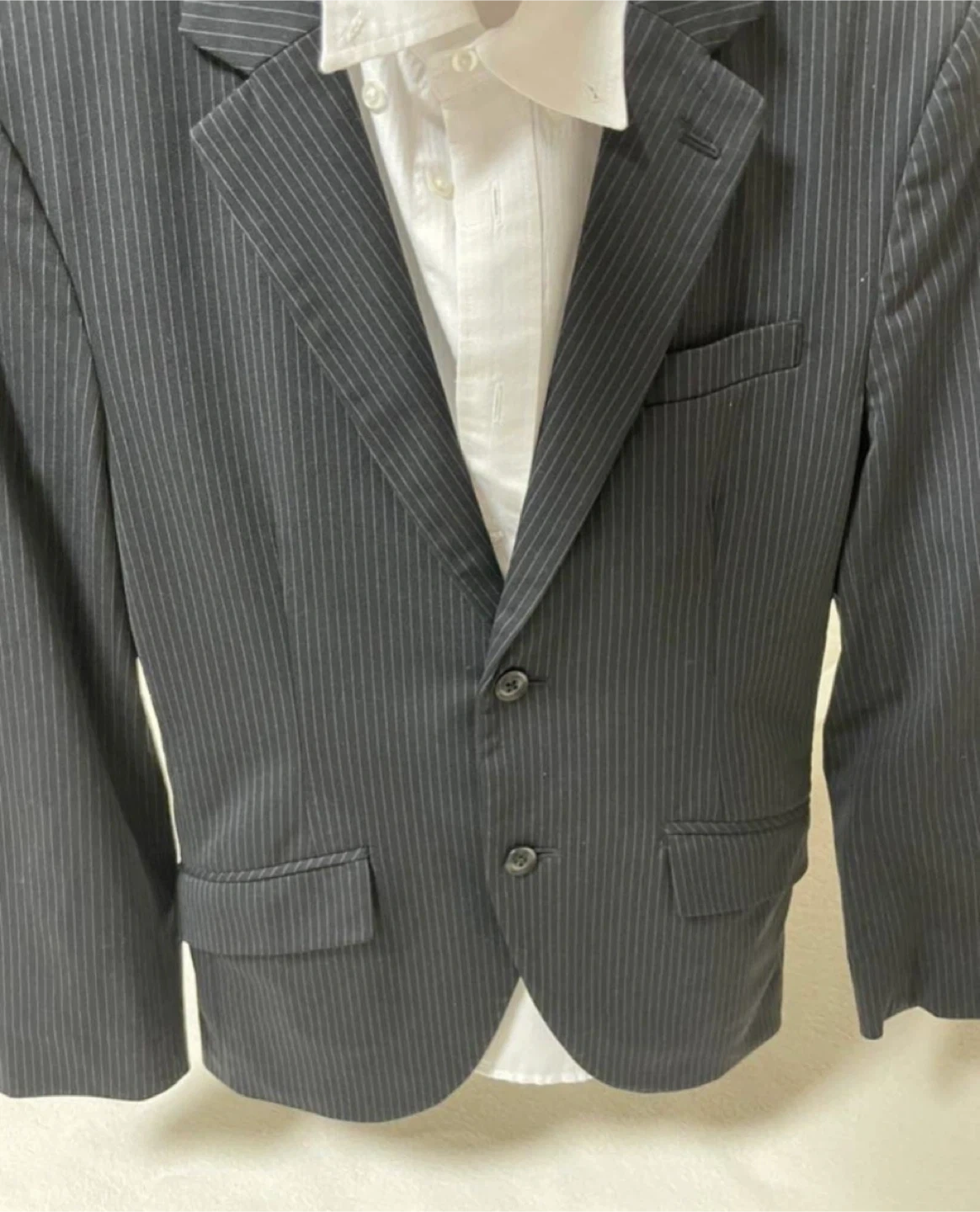 男児スーツ 3点セット 2時間程度使ったスーツです。 もともとシャツはついていませんでしたがお付けいたします。 シャツは(ジャケッ トを脱がなければ)見えない場所に薄い汚れがあります。その為おまけといたします。 お手持ちのものがあればそちらで合わせてもらうのも、いいと思います。 サイズ スーツ(上下)、おまけでシャツ 150㎝ クリーニング後保管しておりました。 ブラックのストライプかと思います。 手洗い可能みたいですので、気になる方はホームクリーニング等してください。