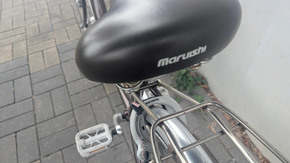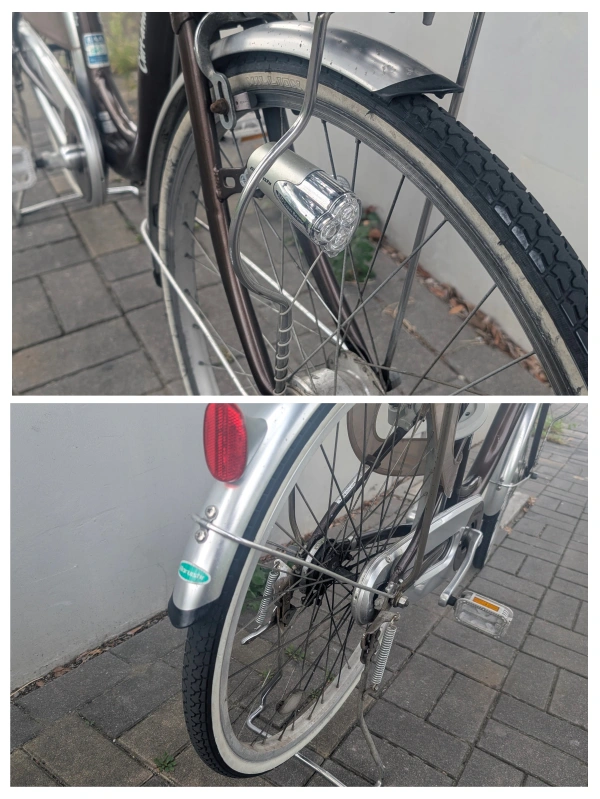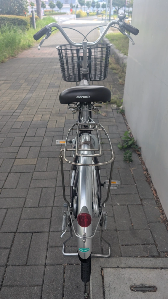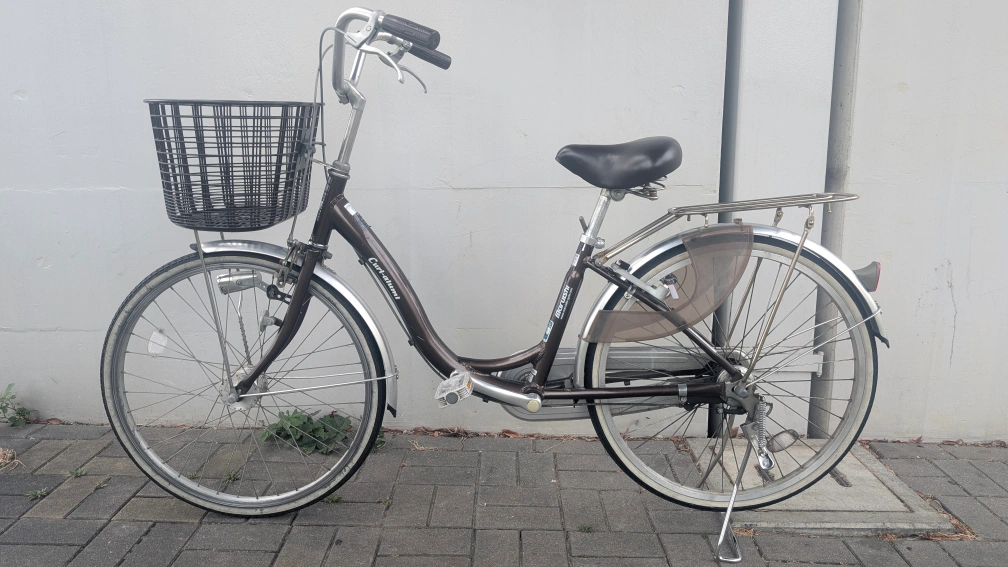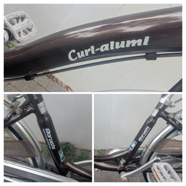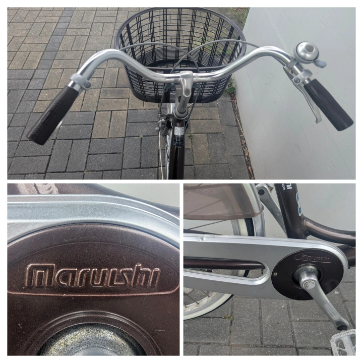 丸石サイクルの自転車 カール アルミ前後24インチの中古車です。 正式な色名は分かりませんが、メタリック系ブラウン(こげ茶)カラーです。 24インチ、変速なし、オートライト こちら現行モデルではありませんが、老舗自転車メーカー丸石サイクルですから、新車価格は5万円以上する自転車です。 丸石サイクル カールアルミ(現行車) https://www.maruishi-cycle.com/2024/12/02/%e3%82%ab%e3%83%bc%e3%83%ab-2/ フレームを始め、パーツの多くがアルミで作られていますので、とても軽快で取り回しの良い自転車です。 前後タイヤのエア漏れなく、溝もありますので、当面タイヤ交換の必要はなさそうです。 機関も良好です。 鍵は1つです。 乗用に関しての難点は特にありませんが、サドル裏面のプラスティックパーツが割れてしまったので、接着剤で固定しています。 乗っている分には全く問題ありませんが、サドルに手を掛けて車体を持ち上げたりすると、固定が外れるかも知れません。 何度かやらかしてしまい、その都度接着剤で固定し直しています。 その他、特記せずとも使用に伴う傷、汚れ、錆など多少の傷みはあるものとご理解願います。 実際に見て、試乗していただいて、ご希望に合わなければ断ってくださって構いません。 少しでも気になった方は是非ご覧になってください。 設定した引き渡し場所でなくても、2km圏内を目処に試乗に適した場所での待ち合わせにも対応いたします。 早く引き渡しの出来る方が優先となります。 お引き渡しの際に譲渡証明書もお渡しいたします。 ※ニックネームも変えずに問い合わせされる方や、非常識な価格提示をされる方に対してはブロックさせていただくこともあります。 それと日本語が通じない方とはお取引が出来ませんこと、予めご了承願います。