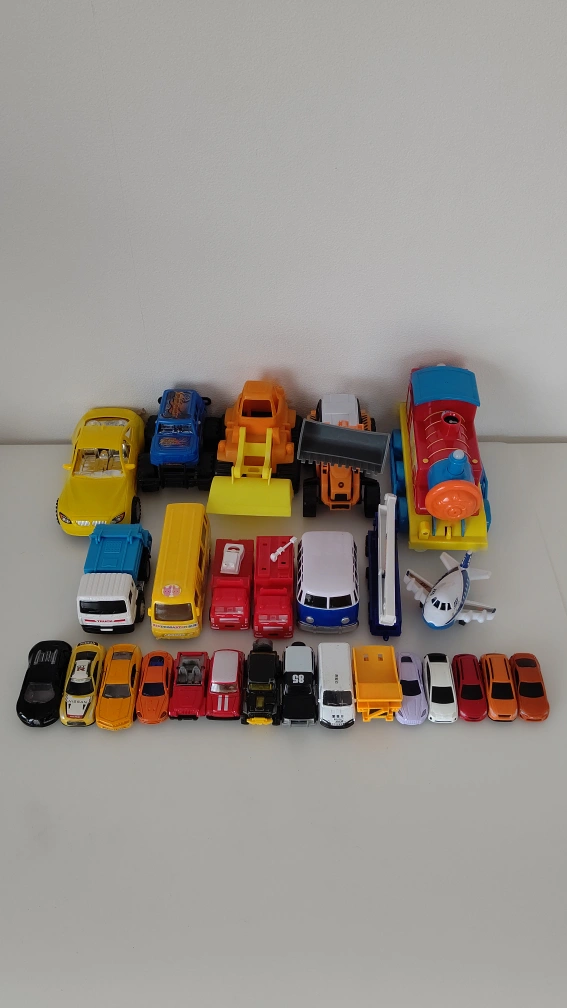 セットでの販売です。 右上の汽車は、電池を入れ、音楽が鳴る品でしたが現在は作動するか不明です。 手動で動かす分には問題ありません。 2枚目写真の車の一部に破損あります。 3枚目写真のショベルカーの先端部分が若干曲がっています。 4枚目写真の車のタイヤ全てにタイヤゴムがありません。その為スムーズに動かせません。 5枚目写真のクレーン車の先端がありません。 その他の品にもシール剥がれや傷等もみられます。 子供が使用した中古品である事をご理解頂ける方、宜しくお願い致します。