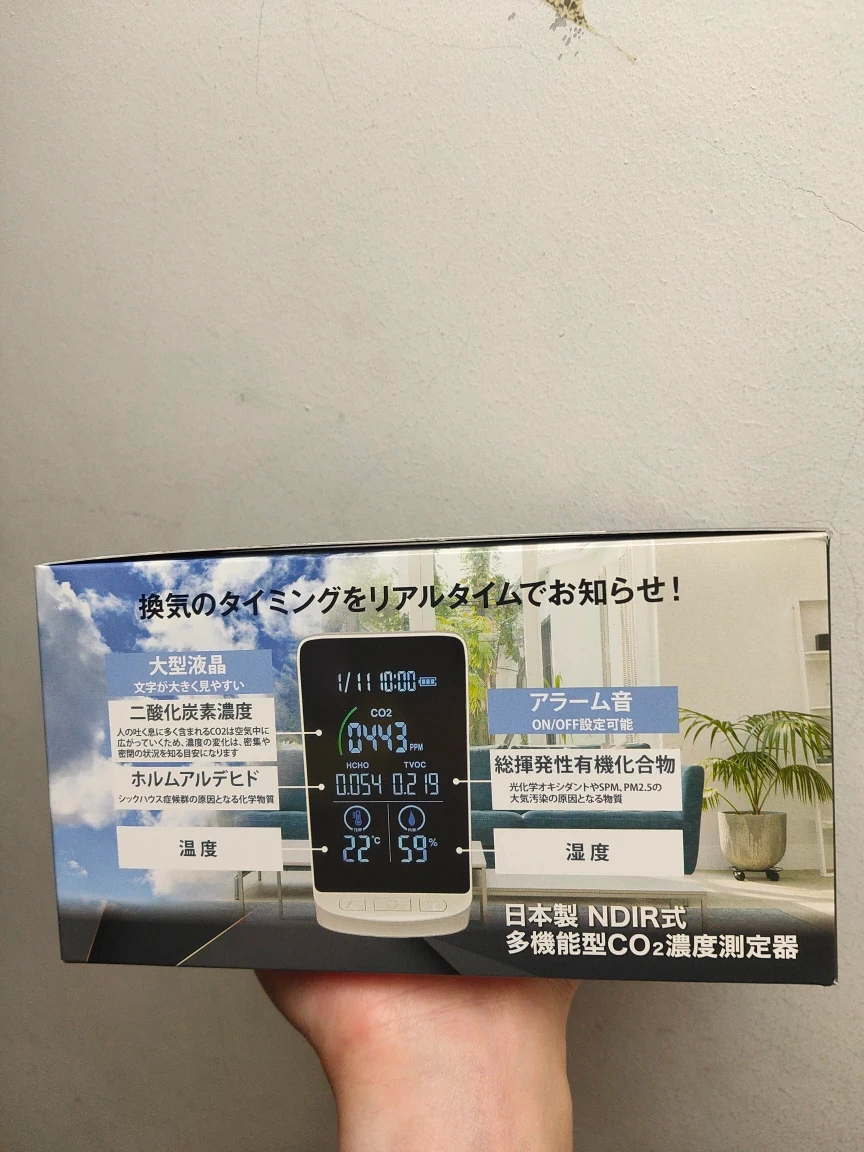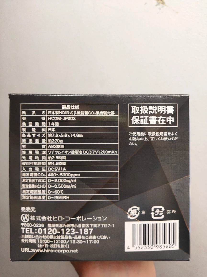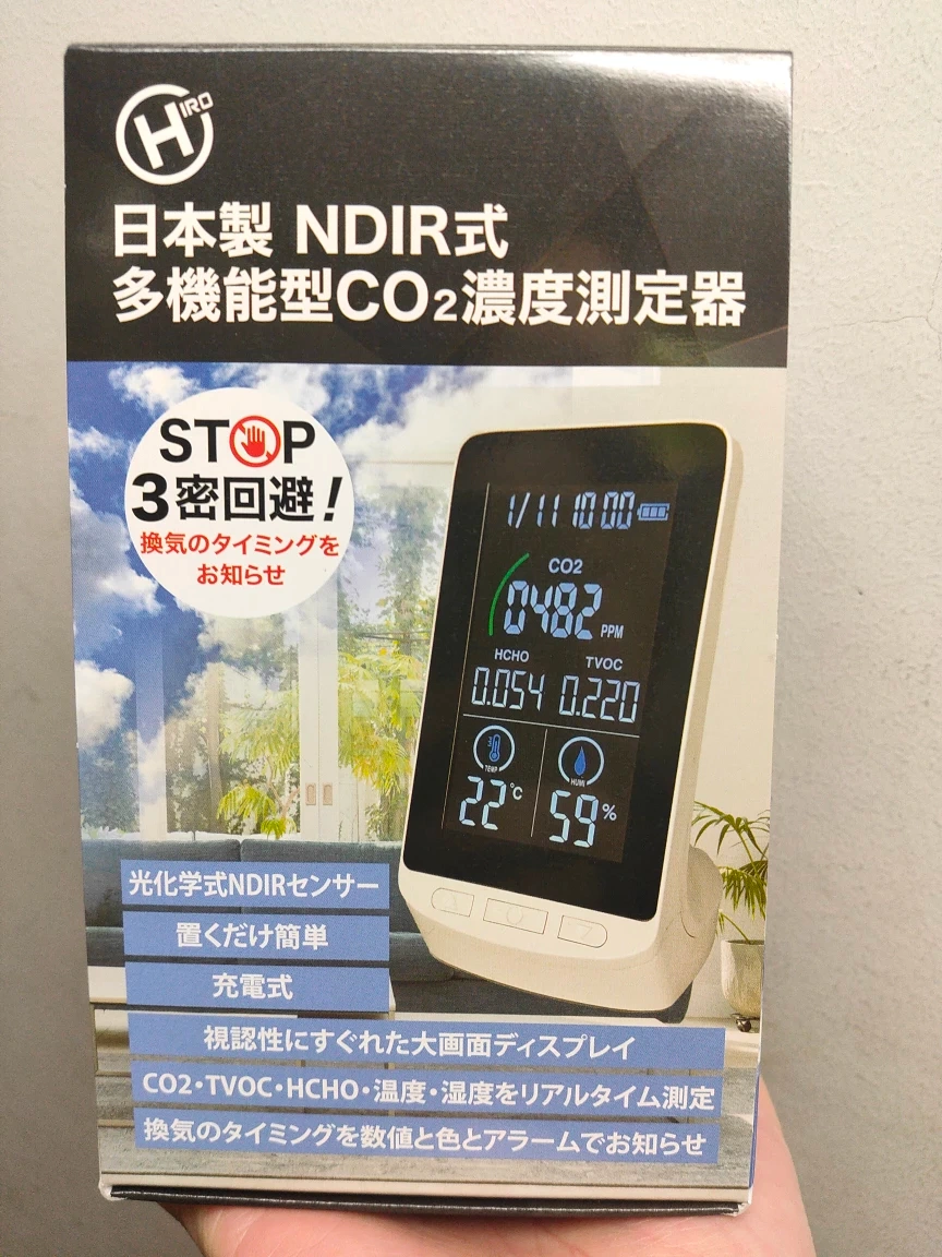 頂き物になります 定価9800円 【HIRO】【充電式】 日本製 NDIR式多機能型CO2濃度測定器 HCOM-JP003 二酸化炭素濃度を大きく見やすい文字でリアルタイム表示! CO2だけでなく、TVOC(総揮発性有機化合物)・HCHO(ホルムアルデビド)・温度・湿度もリアルタイム表示! シックハウス対策にはTVOCH、HCHO!のチェックが有効! アラーム音はON/OFF可能で、 充電式タイプなので、コードレスでも使用可能! https://www.amazon.co.jp/%E4%BA%8C%E9%85%B8%E5%8C%96%E7%82%AD%E7%B4%A0%E6%BF%83%E5%BA%A6%E8%A8%88-%E4%BA%8C%E9%85%B8%E5%8C%96%E7%82%AD%E7%B4%A0%E6%BF%83%E5%BA%A6%E6%B8%AC%E5%AE%9A%E5%99%A8-%E3%83%9B%E3%83%AB%E3%83%A0%E3%82%A2%E3%83%AB%E3%83%87%E3%83%92%E3%83%89%E6%A4%9C%E7%9F%A5%E5%99%A8-%E4%BA%8C%E9%85%B8%E5%8C%96%E7%82%AD%E7%B4%A0%E6%BF%83%E5%BA%A6%E8%A8%88%E6%B8%AC%E5%99%A8-%E4%BA%8C%E9%85%B8%E5%8C%96%E7%82%AD%E7%B4%A0%E6%B8%AC%E5%AE%9A%E5%99%A8/dp/B0CL6C4BDY/ref=mp_s_a_1_1_sspa?crid=31F7X5RLSGGBA&dib=eyJ2IjoiMSJ9.JH7r8eJPjoGqcHc-A-i29g.JnqsJFrDVrtjx19NqSXnYgEXCfkOUFjm9cZpkvSFsJc&dib_tag=se&keywords=hcom-jp003&qid=1732869885&sprefix=hcom%2Caps%2C208&sr=8-1-spons&sp_csd=d2lkZ2V0TmFtZT1zcF9waG9uZV9zZWFyY2hfYXRm&psc=