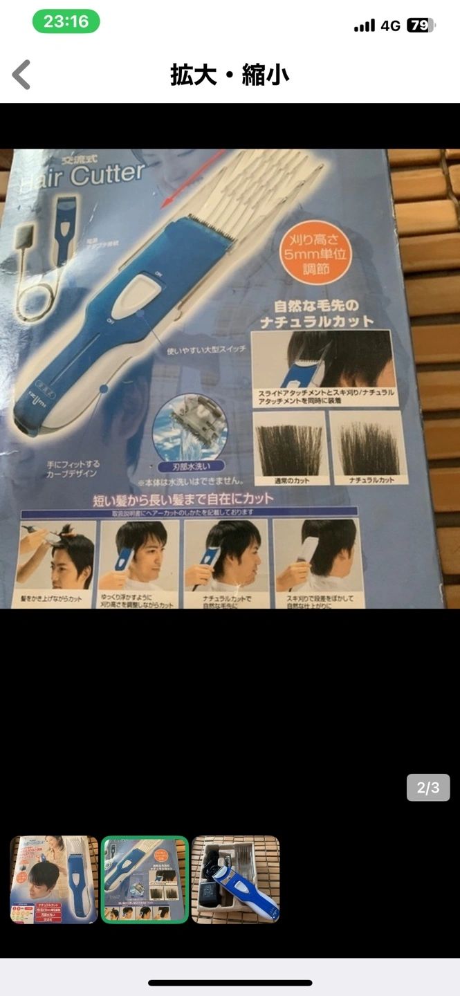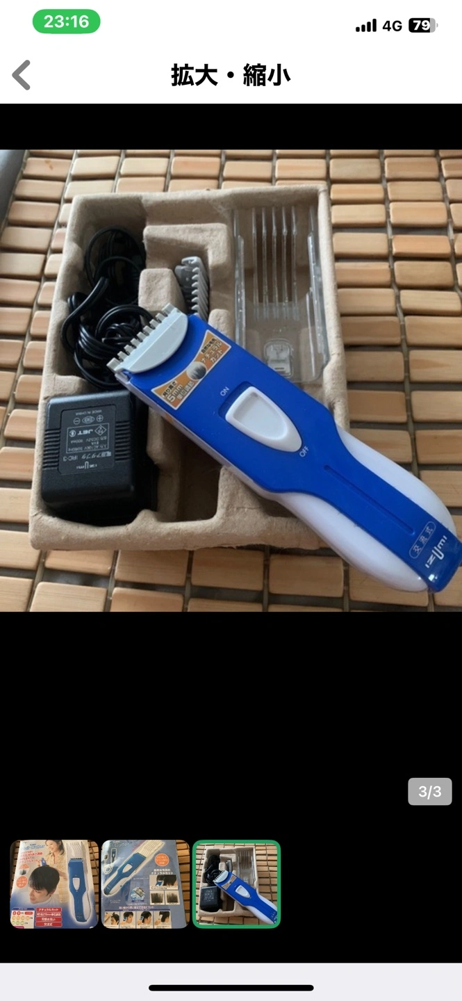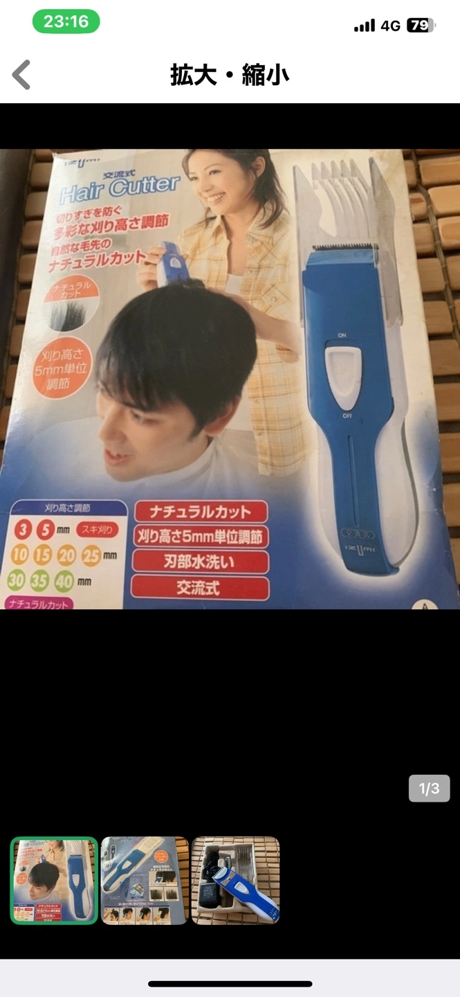 【種類】 ヘアカッター 【状態】 中古品、箱あり 【特徴】 ・刈り高さ調整可能(3〜40mm、5mm単位) ・水洗い可能 あまり使用しないまま押し入れの奥に眠っておりました。 家庭用 イズミヘアーカッターバリカン IHC-26 ◎家庭用 イズミヘアーカッター IHC-26です ◯本体はきれいです。 ◯箱は長期自宅保管のため破れがあります。 ◯部品は全て揃っています。 ◯動作確認済みです。 説明書は処分したようで見つかりませんでした💦