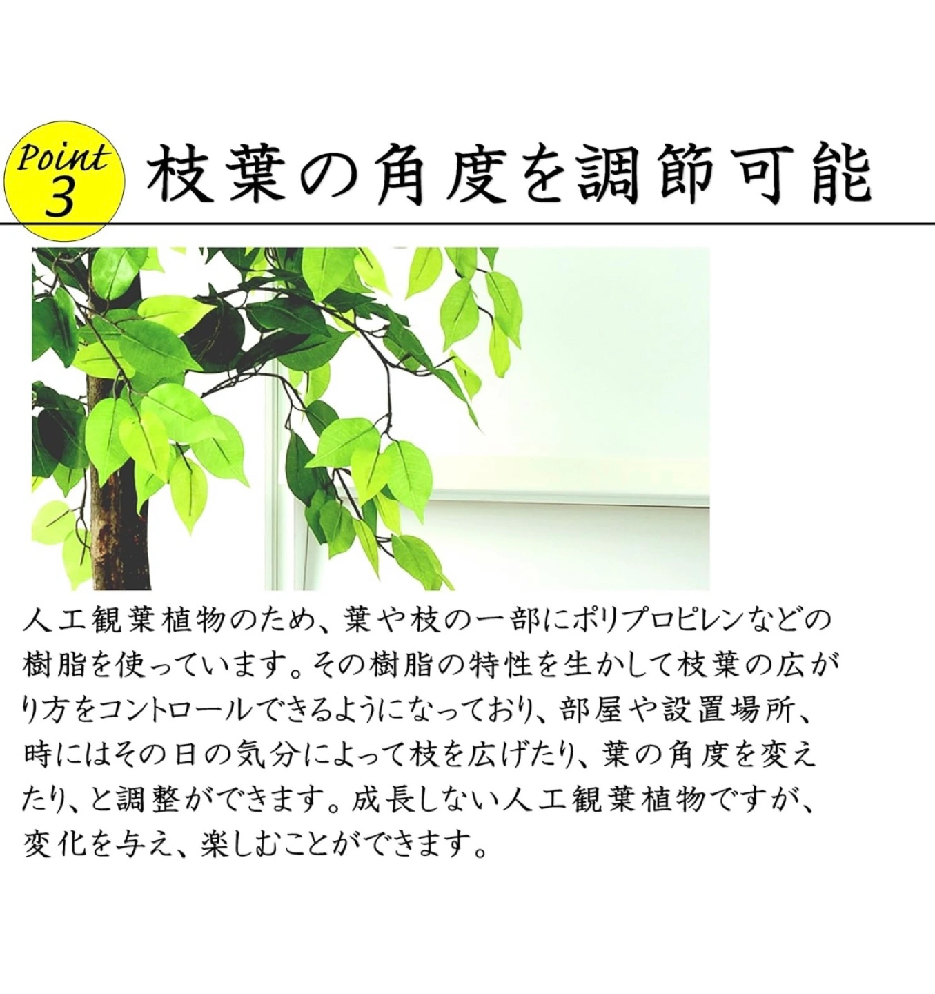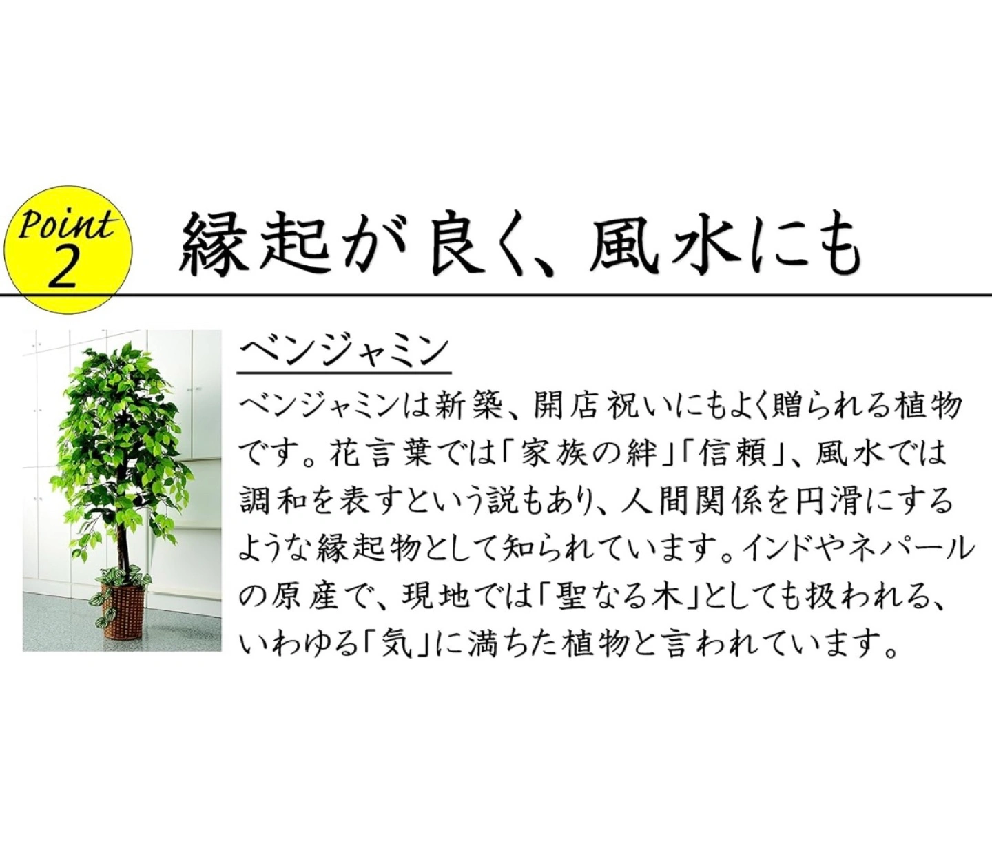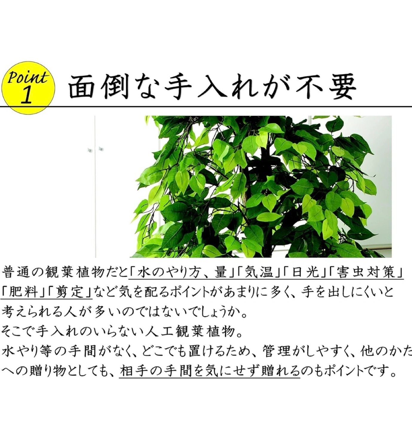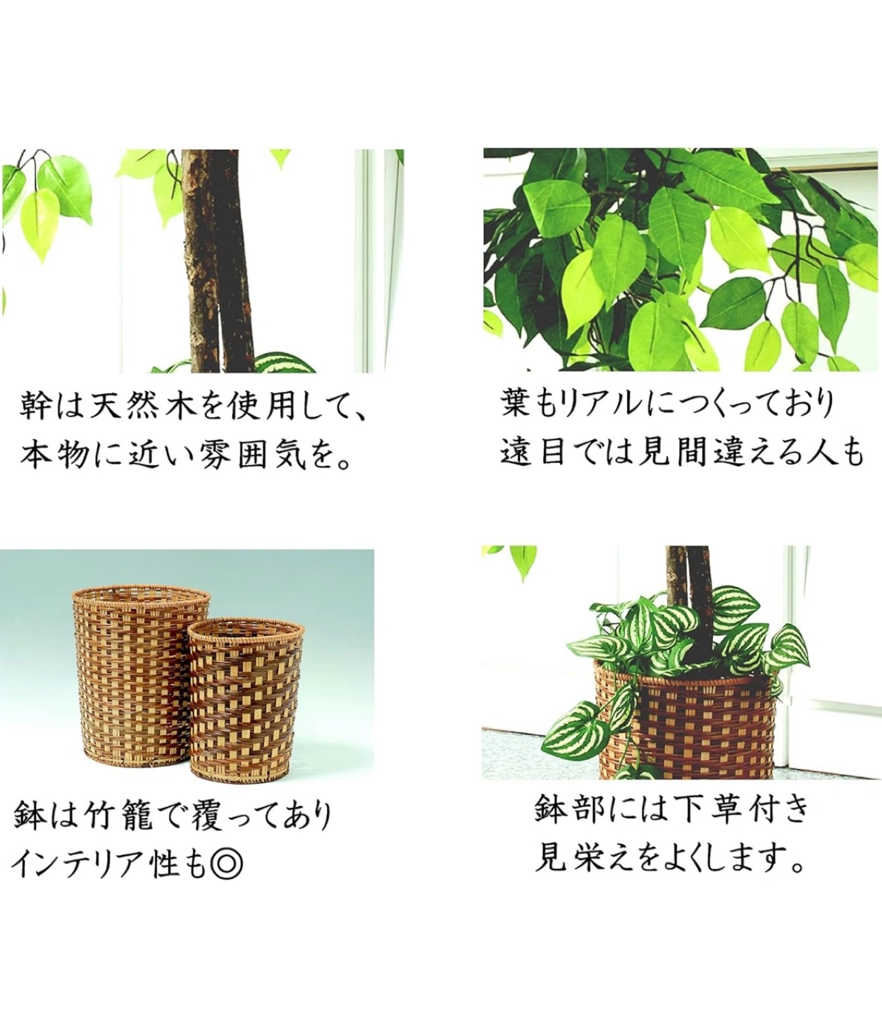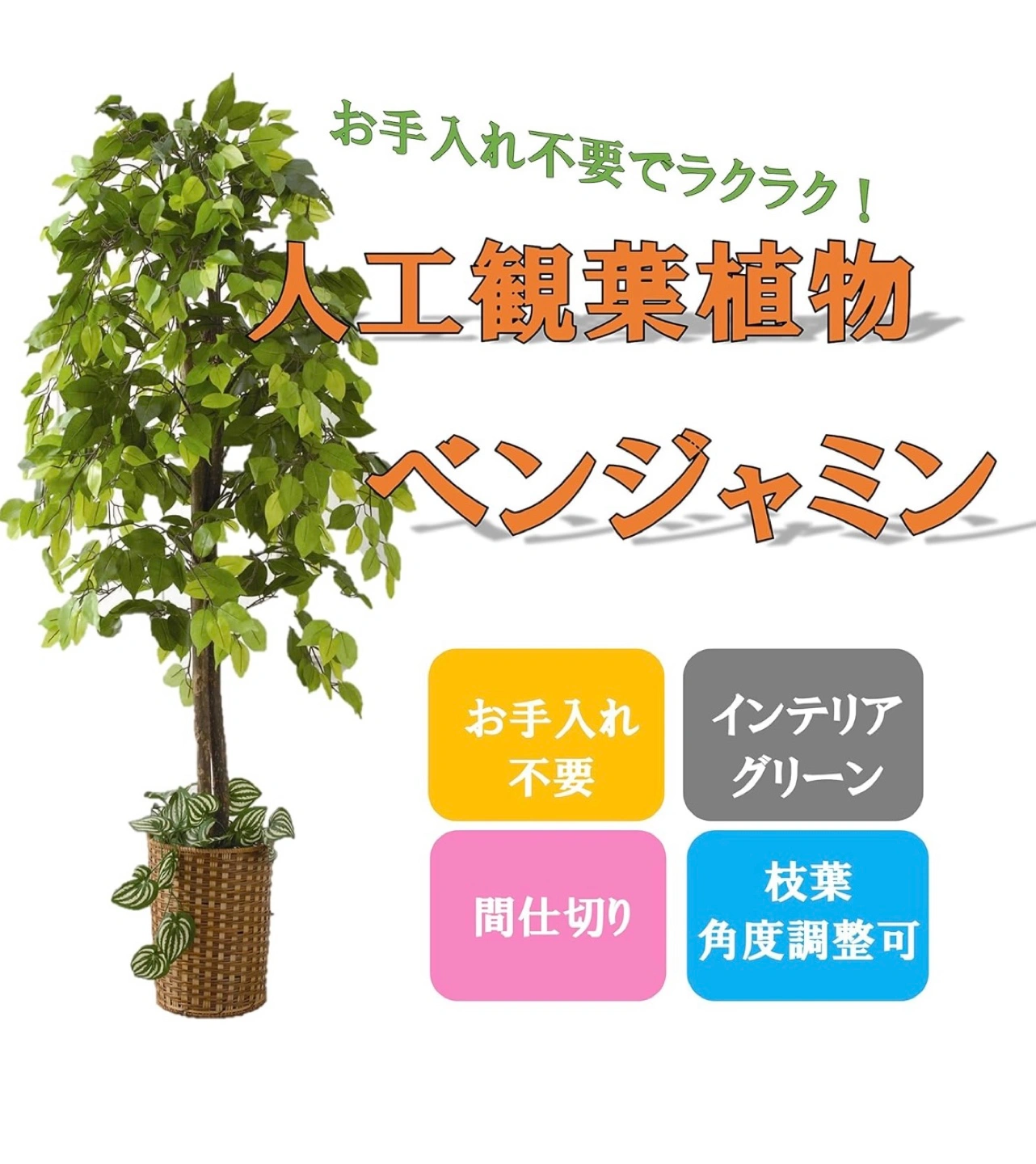 人工観葉植物 造花 ベンジャミン 鉢付き ☆お手入れ不要 ☆インテリアグリーン ☆間仕切り ☆枝葉、角度調整可能 ☆鉢部には下草付き お部屋やオフィス、事務所、お店の彩りに! お手入れ不要でラクラク! · · • • • ✤ • • • · ·· · • • • ✤ • • • · ·· · • • • ✤ • • • ♡水やり不要、剪定不要、日光に関係 なく置きたいところに置いて部屋をおしゃれに! 生花のお手入れが面倒なあなたに、水やり不要で枯れない癒しと潤いのインテリアグリーンをオススメします。 ♡枝や一部にポリプロピレン樹脂を使用 インテリアやその日の気分に合わせて枝葉を拡げ、形を変えて楽しむ事が出来ます。 成長し大きくなりませんが、毎日変化を付けてお楽しみいただけます。 ♡竹製のカゴつきなので緑はもちろんお部屋全体も自然な見た目に。 涼しげな印象でリラックス間違いなし ♡ベンジャミンは縁起が良く風水にも◎ 新築、開店祝いにもよく贈られる植物。 花言葉では「家族の絆」「信頼」、風水では調和を表すという説もあり、人間関係を円滑にするような縁起物 · · • • • ✤ • • • · ·· · • • • ✤ • • • · ·· · • • • ✤ • • • 他サイトでも出品中の為、いきなり削除する場合がありますので、ご了承ください!