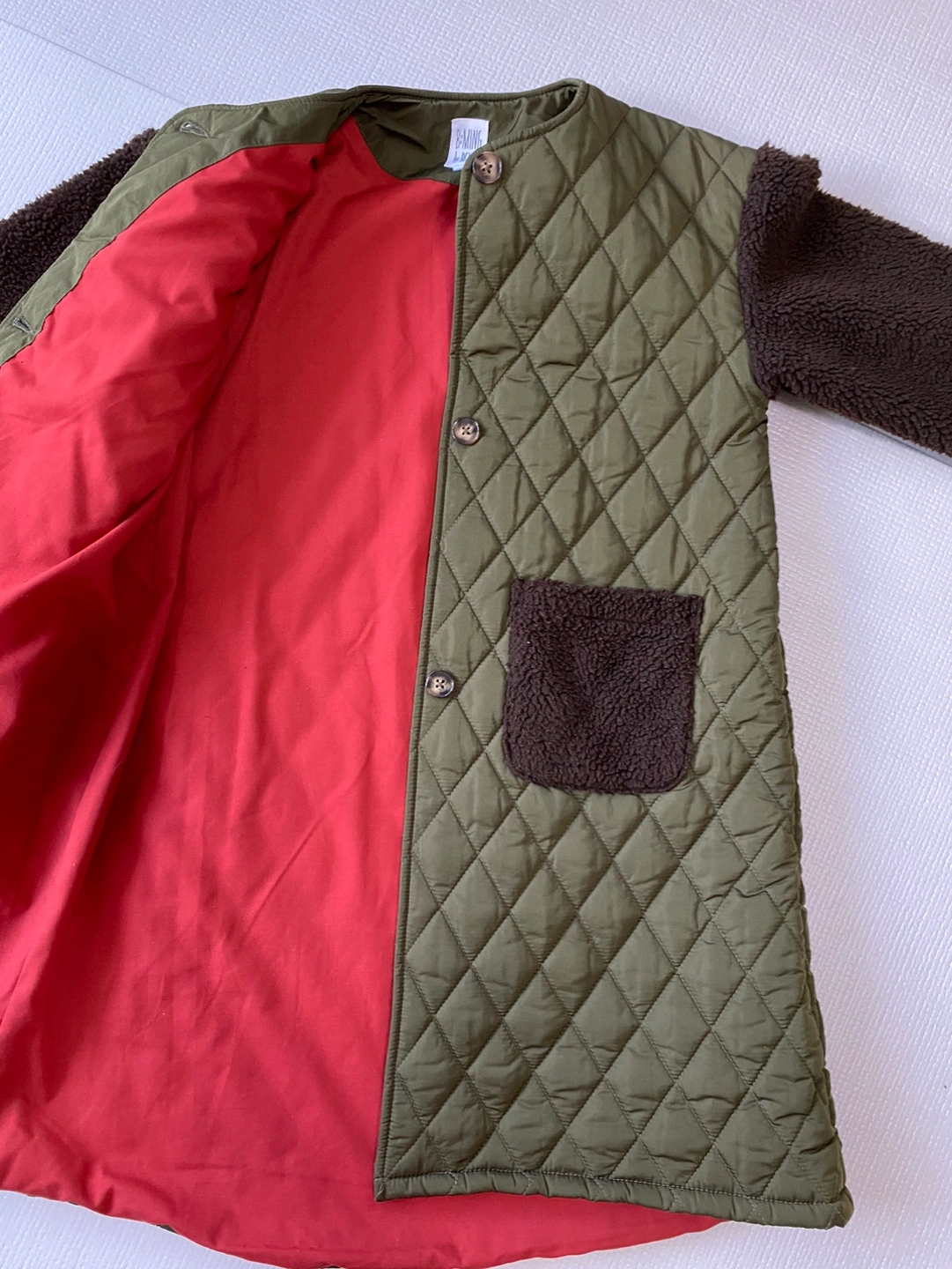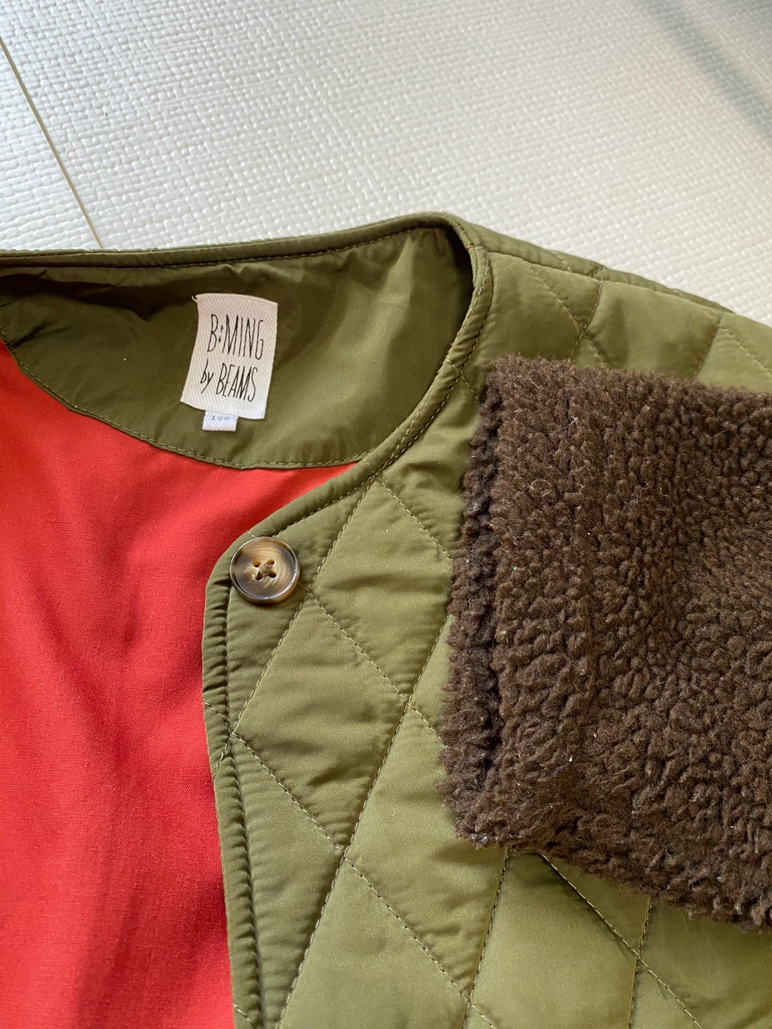 【BEAMS】 子供用 コート 【デザイン】 キルティングデザインが特徴で、オリーブグリーンの外観はおしゃれで、どんなコーディネートにも合わせやすいです。 【機能性】 2つのポケットが付いており、収納力も抜群。裏地は赤色で、見た目にもアクセントを加えています。 - 色: オリーブグリーン - 素材: 中綿・フリース - ポケット数: 2 - 裏地の色: 赤 - 袖の素材: フリース - デザイン: キルティング - サイズ: 150cm 数回でサイズダウンしてしまいました。 状態良いです。 ご覧いただきありがとうございます。