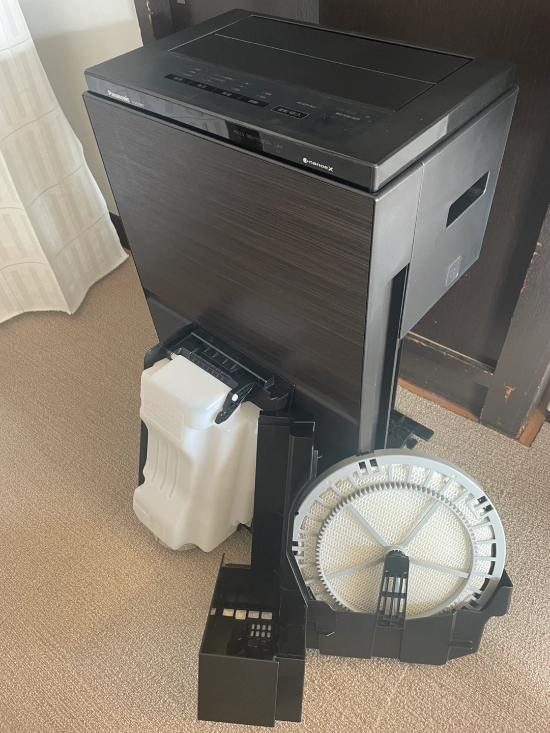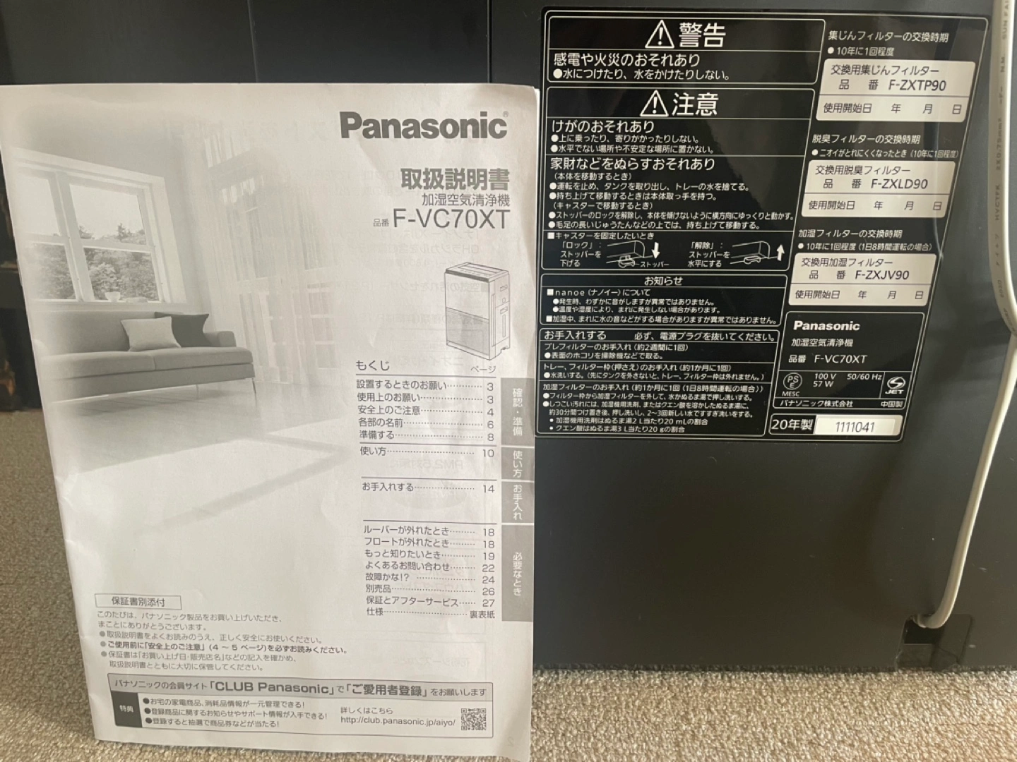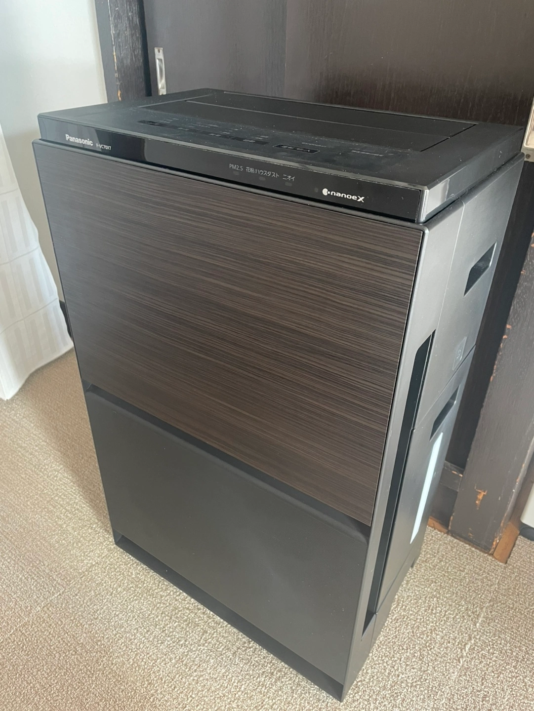2021年1月に購入した加湿機能付き空気 清浄機です。 引越しに伴い手放します。 加湿機能は3年間使用無し、加湿フィルターはクエン酸で洗浄済み。 その他はアルコールスプレーで拭き取り済み。 全体は黒ですが、前面上半分はこげ茶の木目調になっています。 経年による曇りが少しあります。 落ち着いた色味が気に入っていました。 サイドと前側に給排口があり、背面を壁に接して置けるので邪魔になりません。 コロコロが付いているので移動もスムーズ、水が入っていなければ本体も軽いです。 背面のコード収納は後付けしています。貼って剥せるテープです。不要でしたら剥がしてご使用下さい。 商品状態:多少傷あり、メンテナンス後動作確認済み ブランド:Panasonic 中古品であるということをご了承の上、ご購入ください。 ご不明点等ございましたらご連絡ください。 そのままのお渡しとなるので、車で来られる方、お近くで代車をお持ちの方にお勧め致します。