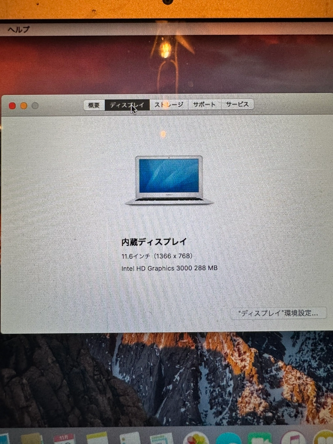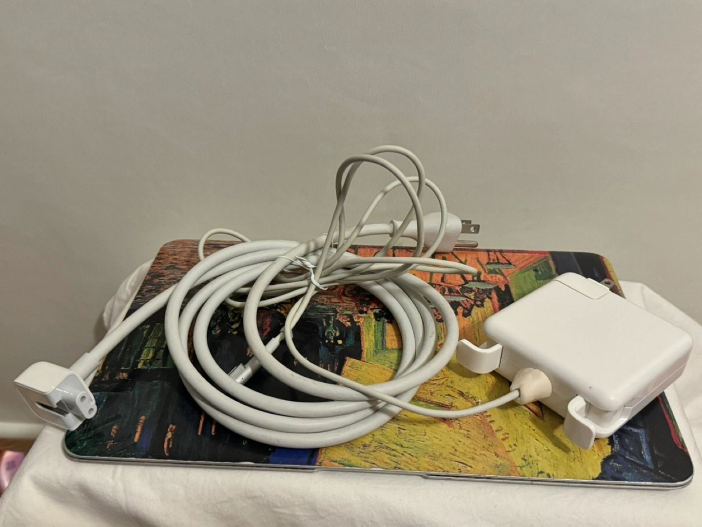 MacBook Air (11-inch, Mid 2011) プロセッサ1.6GHz Intel Corei5 メモリ 2GB 1333MHz DDR3 グラフィックス Intel HD Graphics 3000 288MB 内臓ディスプレイ 11.6 インチ (1366x 768) ちょっと記憶が曖昧なのですが、HDDを増設した記憶があります。 ディスクユーティリティを開くと480 GB ソリッドステート SATAドライブ と書いてあります。 ゴッホの柄の傷防止シートが貼ってあります。 こちら、スキンシールというもので、剥がすときに糊は残らないという商品でしたが、剥がすのに力がいるようなので剥がしていません。 こんな感じで剥がせます。 https://www.z0n0.com/archives/7808 元々のACアダプタが根本が断線して壊れてしまって書い直しました。根本がちぎれやすかったのがいやだったので、樹脂粘土で補強してあり、劣化しにくいです。もちろん問題なく使えます。外すこともできます。 写真にあとで追加しますが、もう一つACアダプタの部品をおつけします! 初期化してお渡しの予定です。