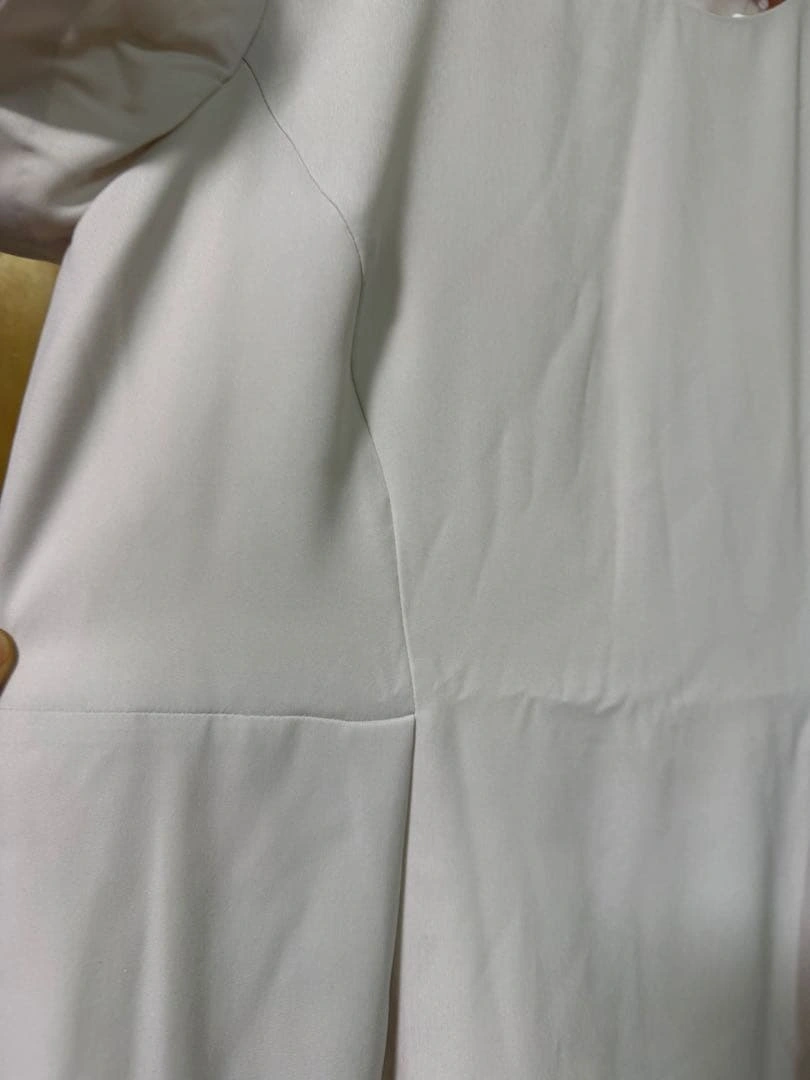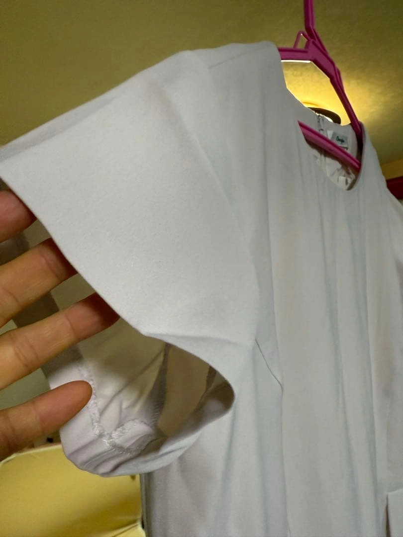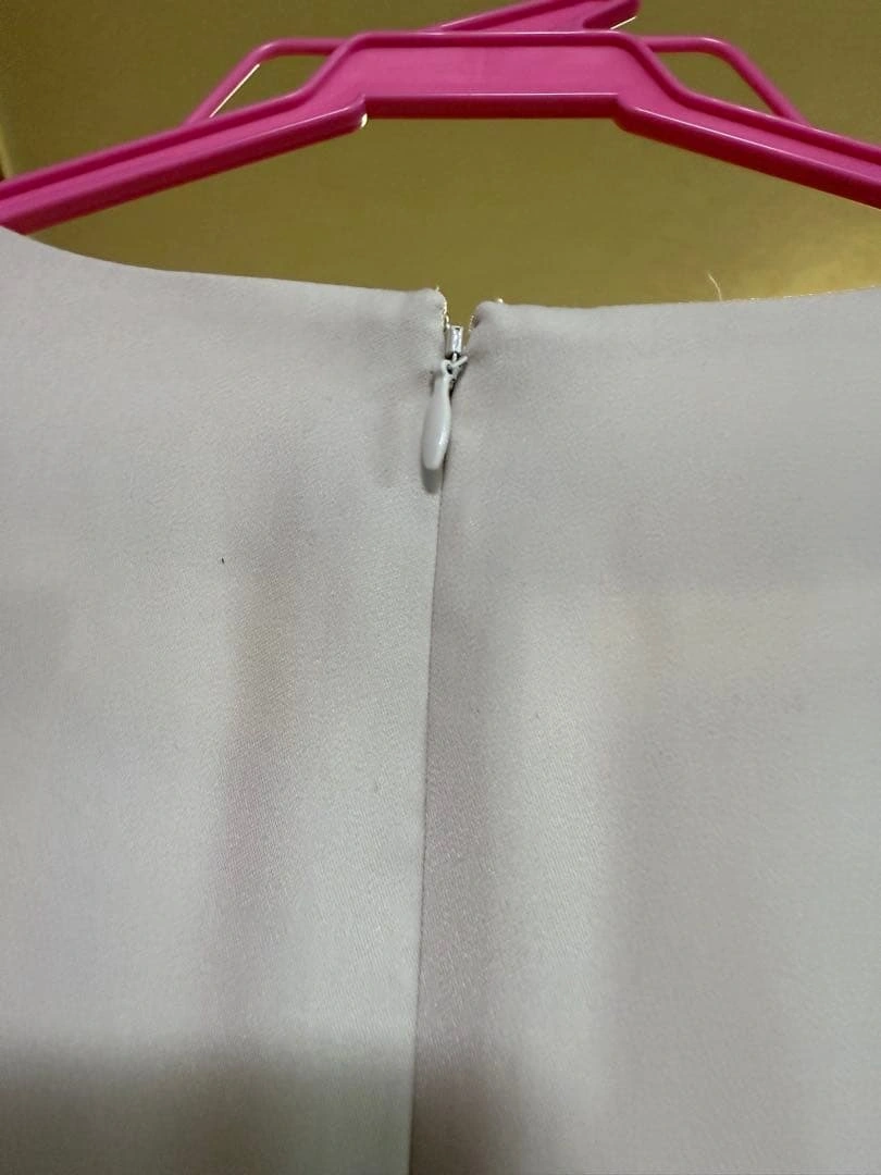 ライトグレーの半袖ひざ丈ワンピースです。背面ファスナー付き。 - 色: ライトグレー - ファスナー: 背面ファスナー - 袖: 半袖 - 素材:ポリエステル100% バスト 93-101cm 身長 154-162cm 実寸 肩幅 41㎝ 着丈 101㎝ 身幅 51㎝ 袖丈 14㎝ 裾幅 63㎝ 素人計測のため、多少の誤差はお許しください。 コンパクトに畳んで梱包されていたため、 折りジワなどがある場合がございます。ご了承ください。ご希望の方はお気軽にご連絡ください。