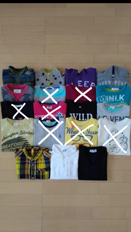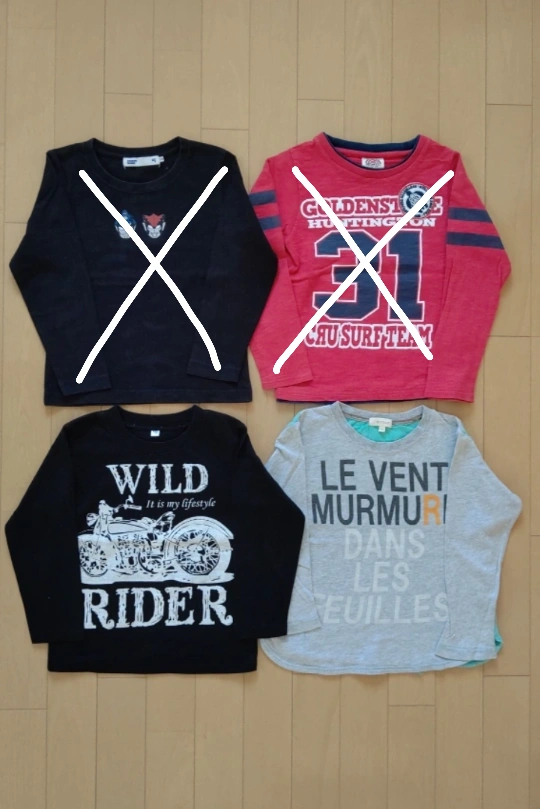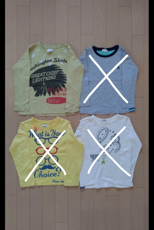 1着¥100計算です。 単品でのご相談承ります。 記名がある場合はマーカーで消してからのお渡しになります。 2段目一番右、緑トレーナーの背中の一部に破損があります。 生地が二重になっているので肌は見えません。5枚目の写真を参照下さい。 4段目一番左、黄緑ロンTの袖に汚れがあります。8枚目の写真を参照下さい。 中古品の為、他にも小さな汚れなどもあると思います。 ✕がついている洋服は既にお取引済みの為ございません。 全て価格交渉不可とさせて頂いております。