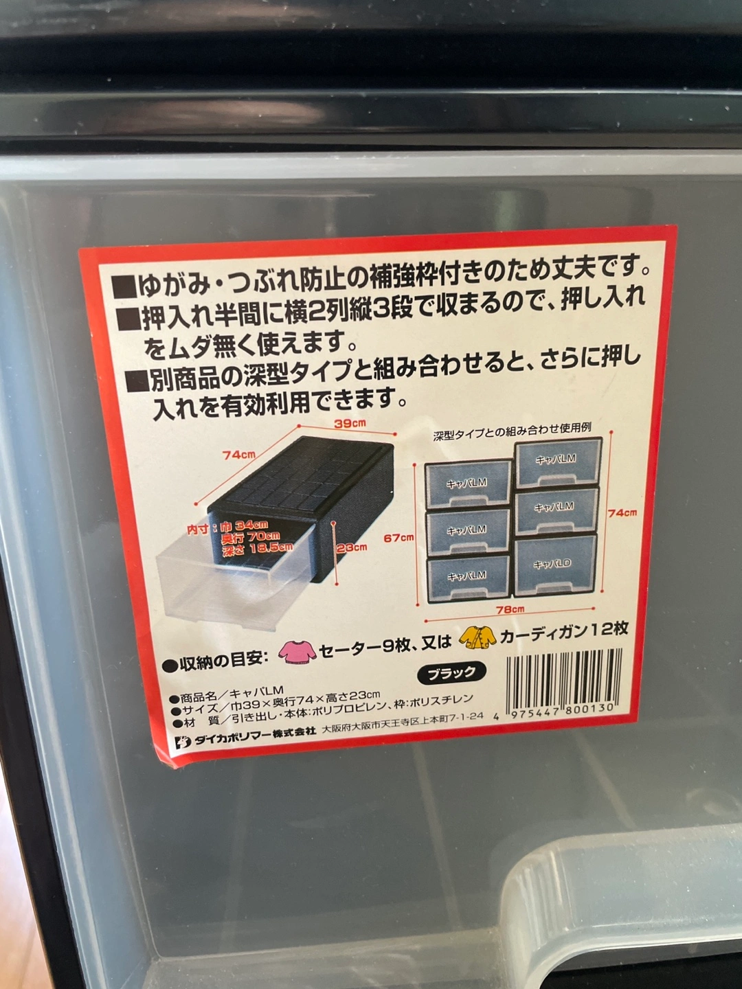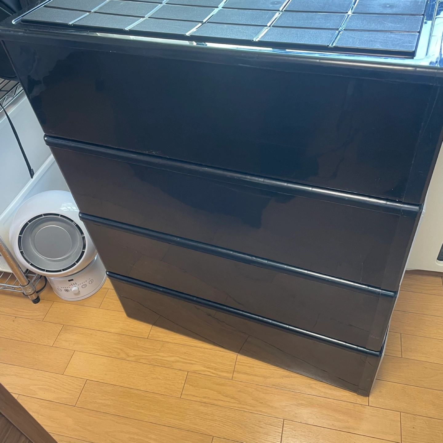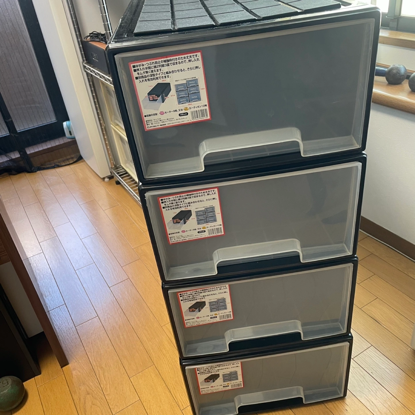 ・カラー:ブラック ・サイズ:巾39×奥行74×高さ23cm ・収納目安:セーター9枚、又はカーディガン12枚 ・材質:引き出し・本体 ポリプロピレン、枠 ポリスチレン 4個セットの値段です。 断捨離の為、処分する事になりました。ヒビ等はありませんが、使用感はあります。 待ち合わせ場所はマクドナルドの青梅街道店がいいのですが、家に台車があるので、武蔵関周辺でしたら、台車で運びます。