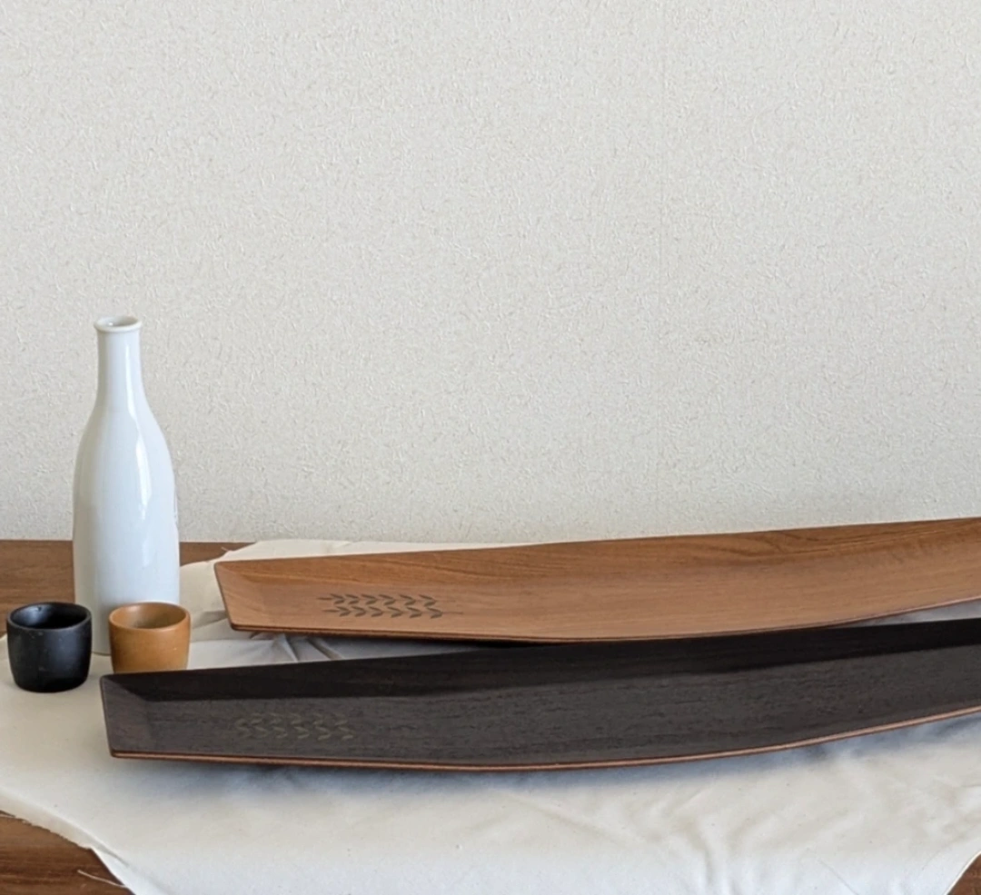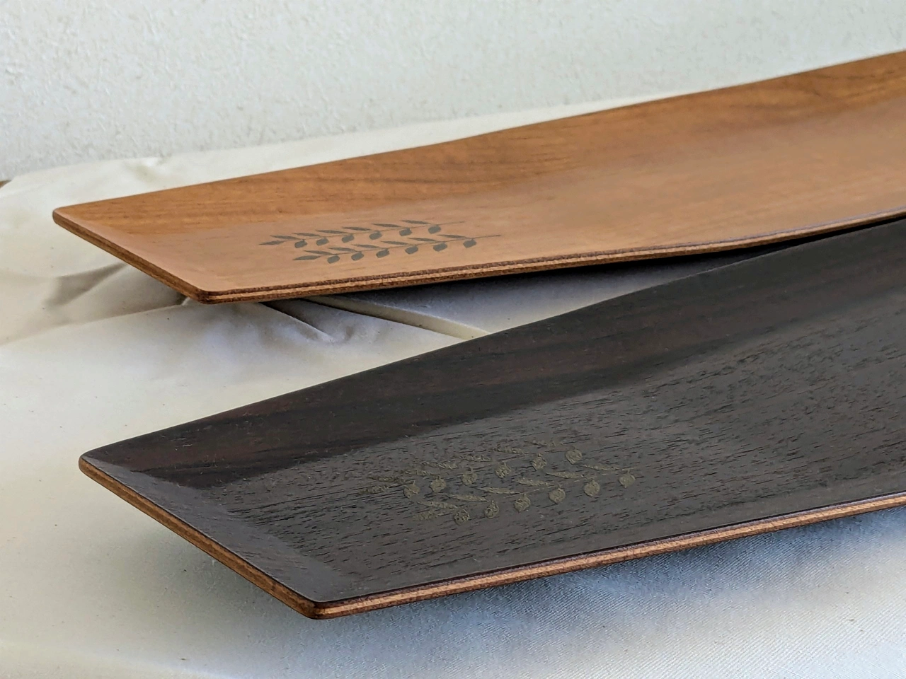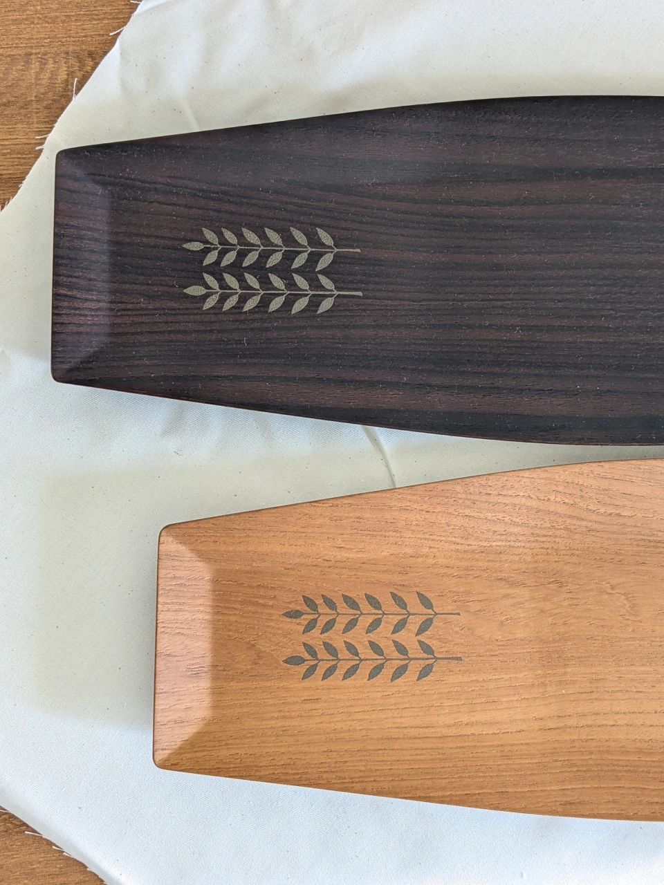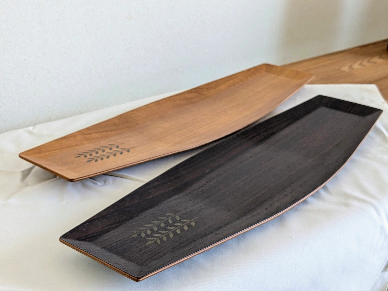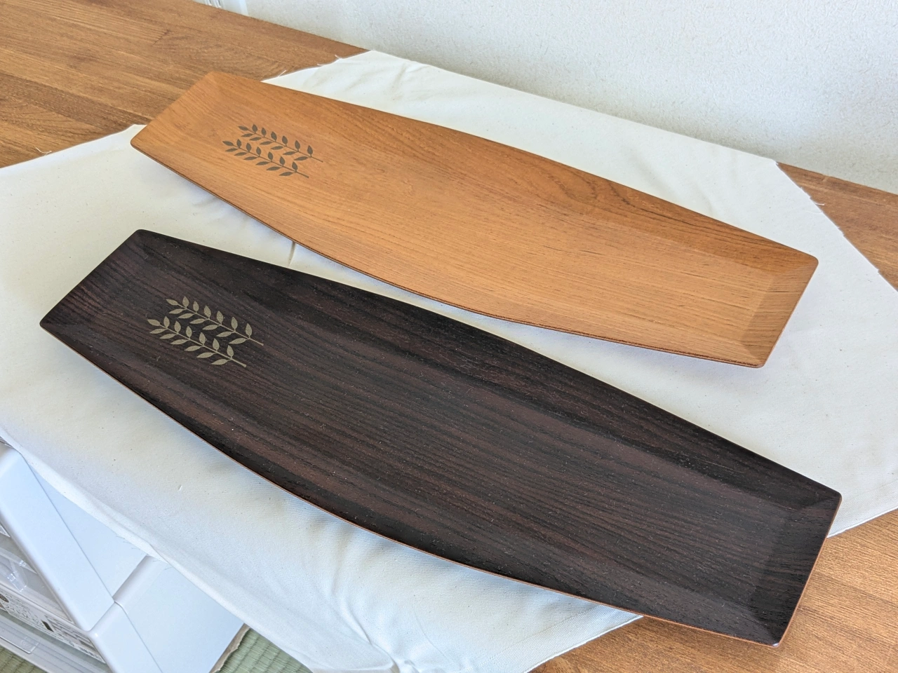 長さ50cmほどの舟形の盛り皿一組です 突き板合板プレス成形、文様はプリント塗装 ☆価格応相談 実家整理で出てきたものです おそらく使うことはなかったと思います 裏面若干擦りキズ有り 経年乾燥していたため全体に木製食器用の蜜蝋ワックスで 軽く手入れしてあります 1965年 高島屋 ロジエ Rosier 長さ約52cm×幅約16cm×高さ約1.5cm 裏面のシールは今でも使われている高島屋の「線ばら」「Rosier」や共箱の「R」のロゴは今は使われていないようです 高島屋でもこの商品について詳細不明とのことです 引き出物として出されたのかも知れません 高島屋ロジエ = 高島屋と「乃村工藝社」の折半出資。1959年設立、1961年独立、2016年解散。 共箱 約54cm×約18cm×約4cm 共箱はひどいものです 重さ(箱共)0.8kg (送料80 サイズ850円込み) この舟形、特に双葉の文様デザインについてご存知の方いらっしゃいましたらご教示ください。