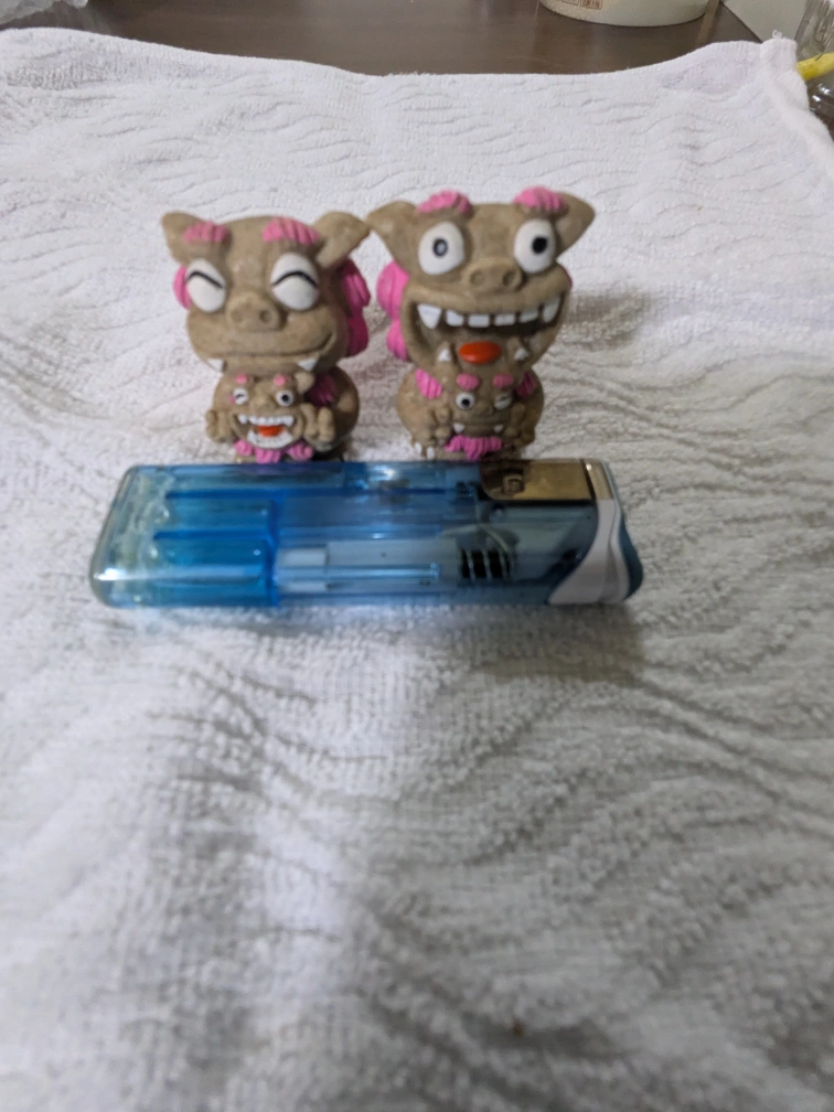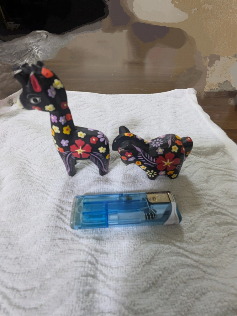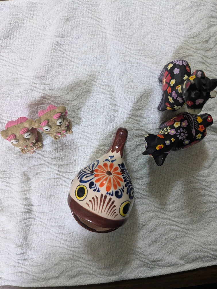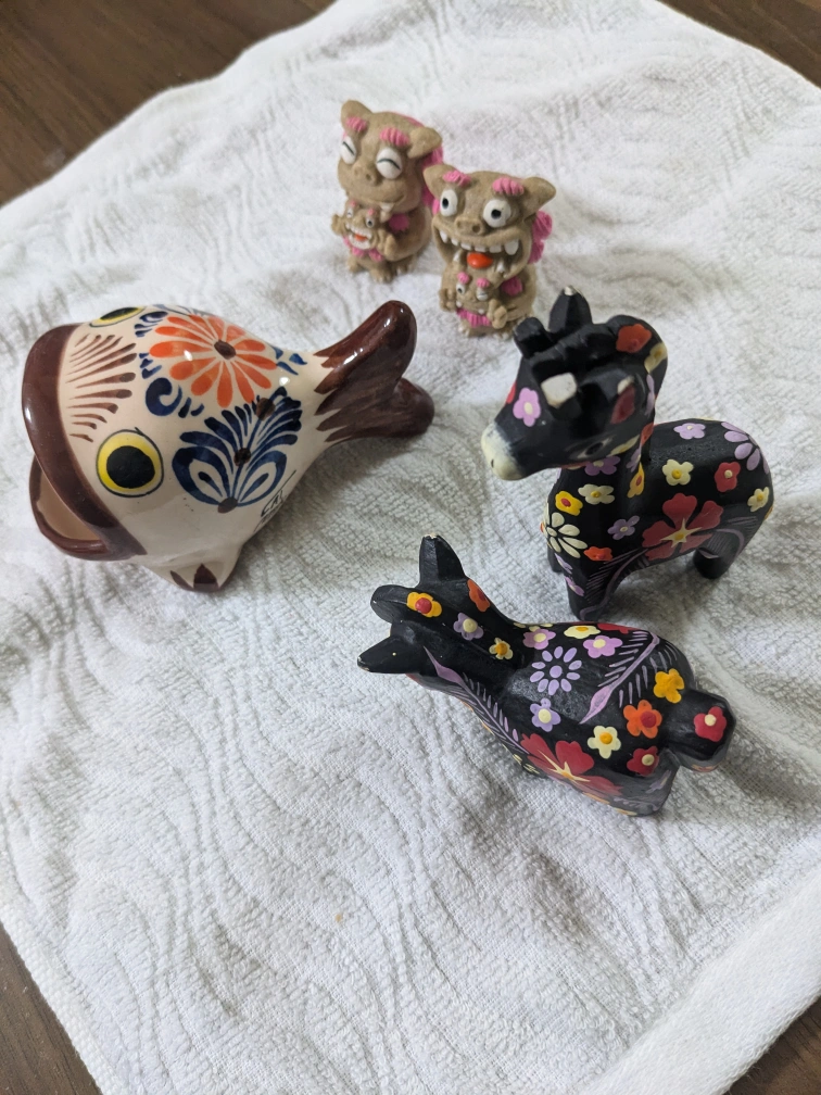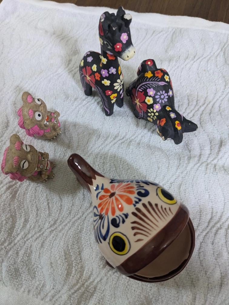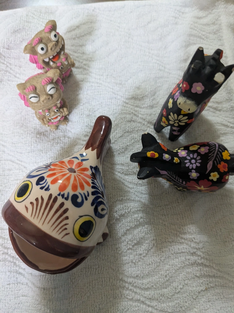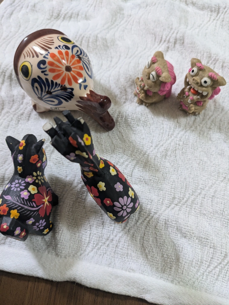 ご覧いただきありがとうございます。 キリンと馬?の黒の一部分(角や脚先)が剥がれています。マジックで塗っていただければ目立たないかもしれません。 他2点は傷・汚れなどの問題ありません。 シーサーはお土産で購入し、クジラ?は昔チチカカで購入しました。 3点でご購入下さい。 トイレ・出窓・玄関等に置いても可愛いと思います。ご質問等あればご連絡下さい。 受け渡しは武蔵新田駅、宜しくお願いします。