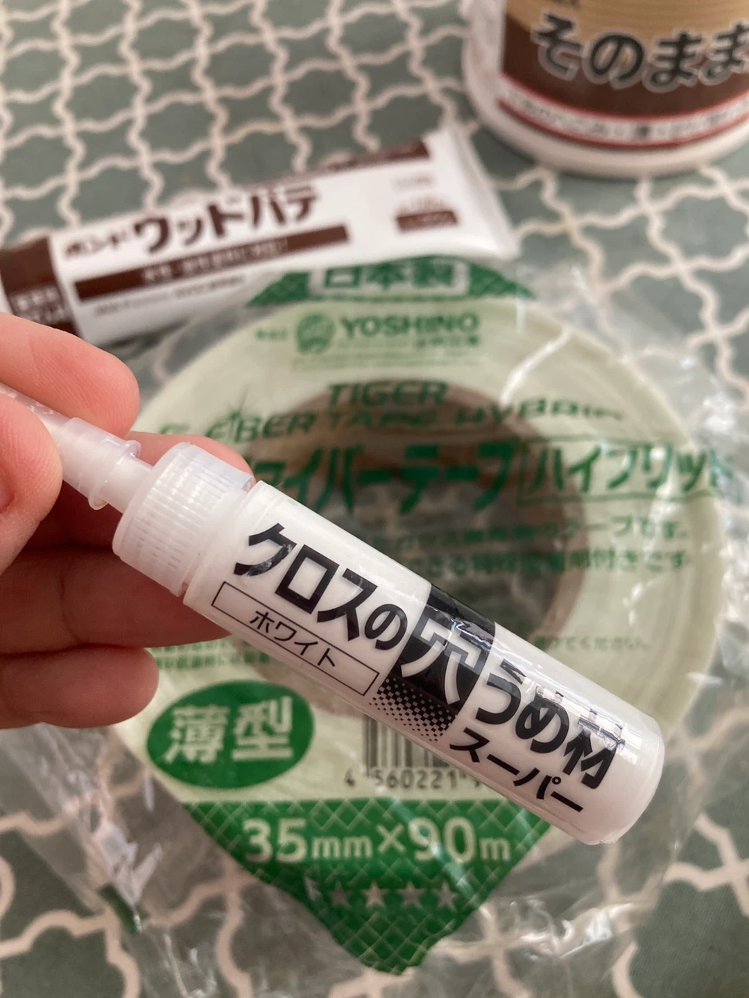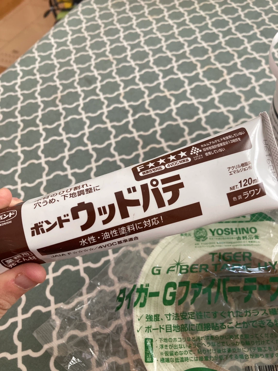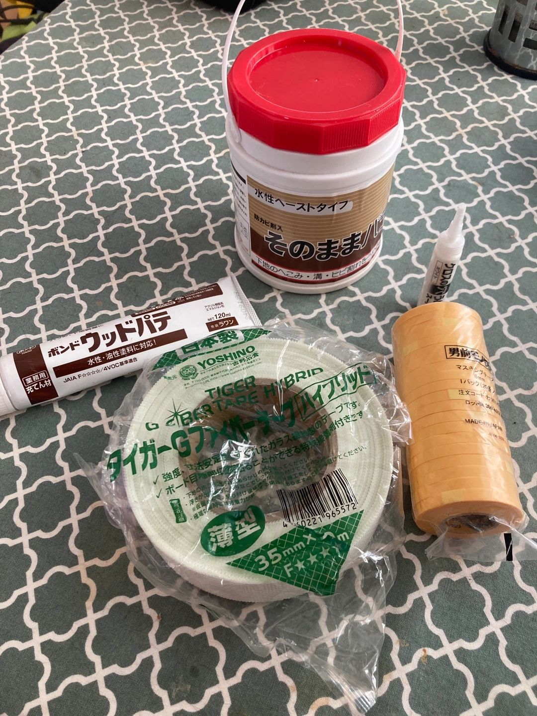 DIY用品のセットです。 【内容】 ・水性ペーストタイプ そのままパテ ・ボンド ウッドパテ(色調:ブラウン、NET 120ml)> ちょっとだけ使いました ・YOSHINO タイガーGファイバーテープ ハイブリッド(35mm×90m) ・男前モノタロウ マスキングテープ 6mm (1パック20巻入) ・クロスの穴うめ材 スーパー ホワイト ウッドパテとクロスの穴埋め剤はちょっと使いましたことご了承ください