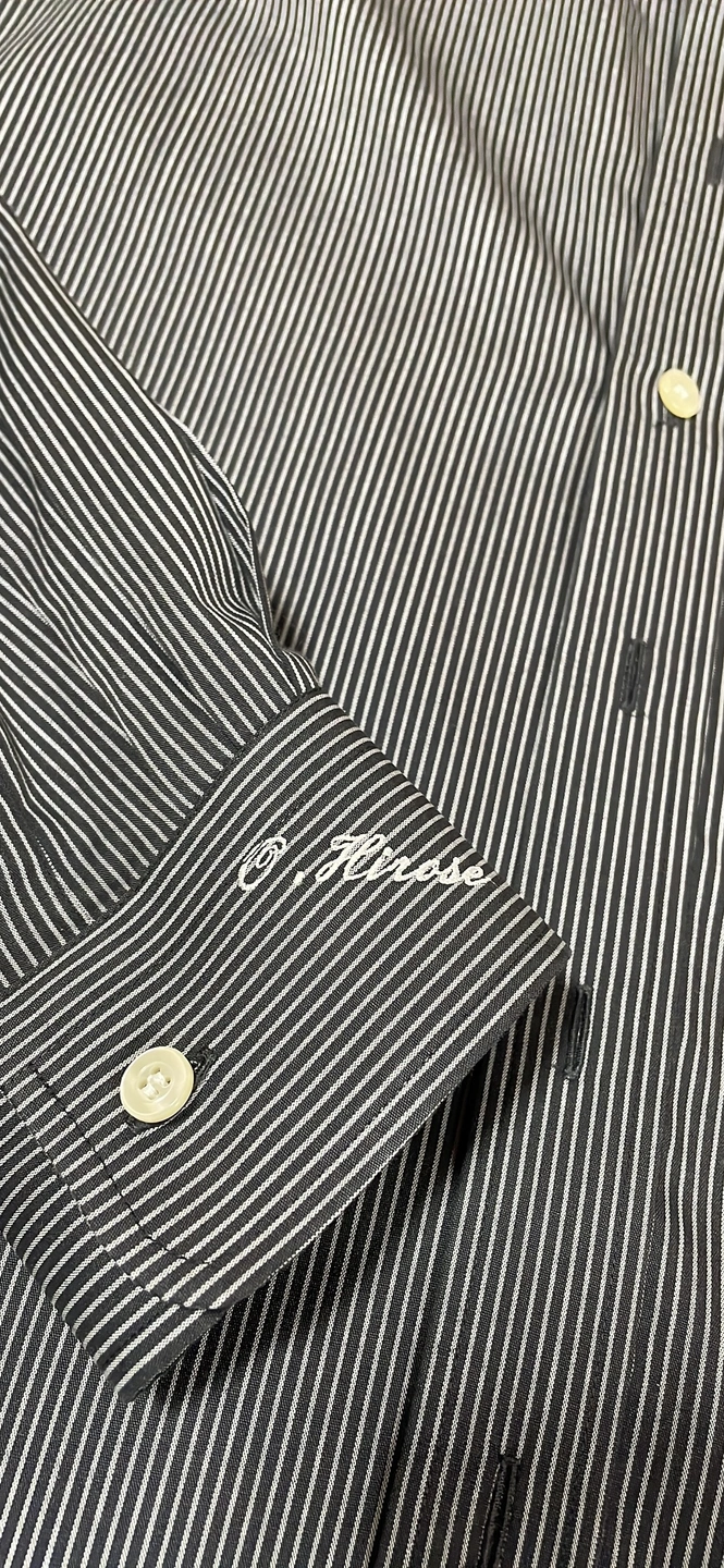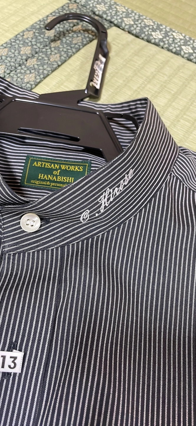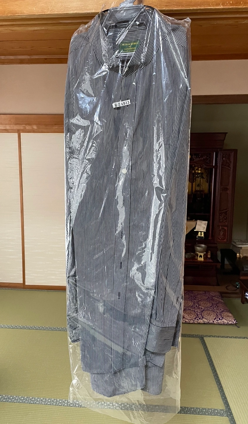 肩幅 約49、身幅63、着丈87.5cm 183cm、90〜100kgくらいのしっかりした体格で着用していました。 同じ位の体格の方購入してくださるとうれしいです😊 実家での出品です。明日までにお気に入り♡の反応があれば東京に持って帰りますが、ない場合はお渡しが先になる可能性あります🙇♂️ 分かりやすくお写真載せます📷 ストライプのスタンドカラーシャツです。 父が来ていたワイシャツです。刺繍で名前が入ってしまっています😂💦 クリーニングに出したあとしまったままになっていました。 お渡し時は、カバーを取って畳んでお渡しします。ご理解頂ける方でご購入お願い致します🙏