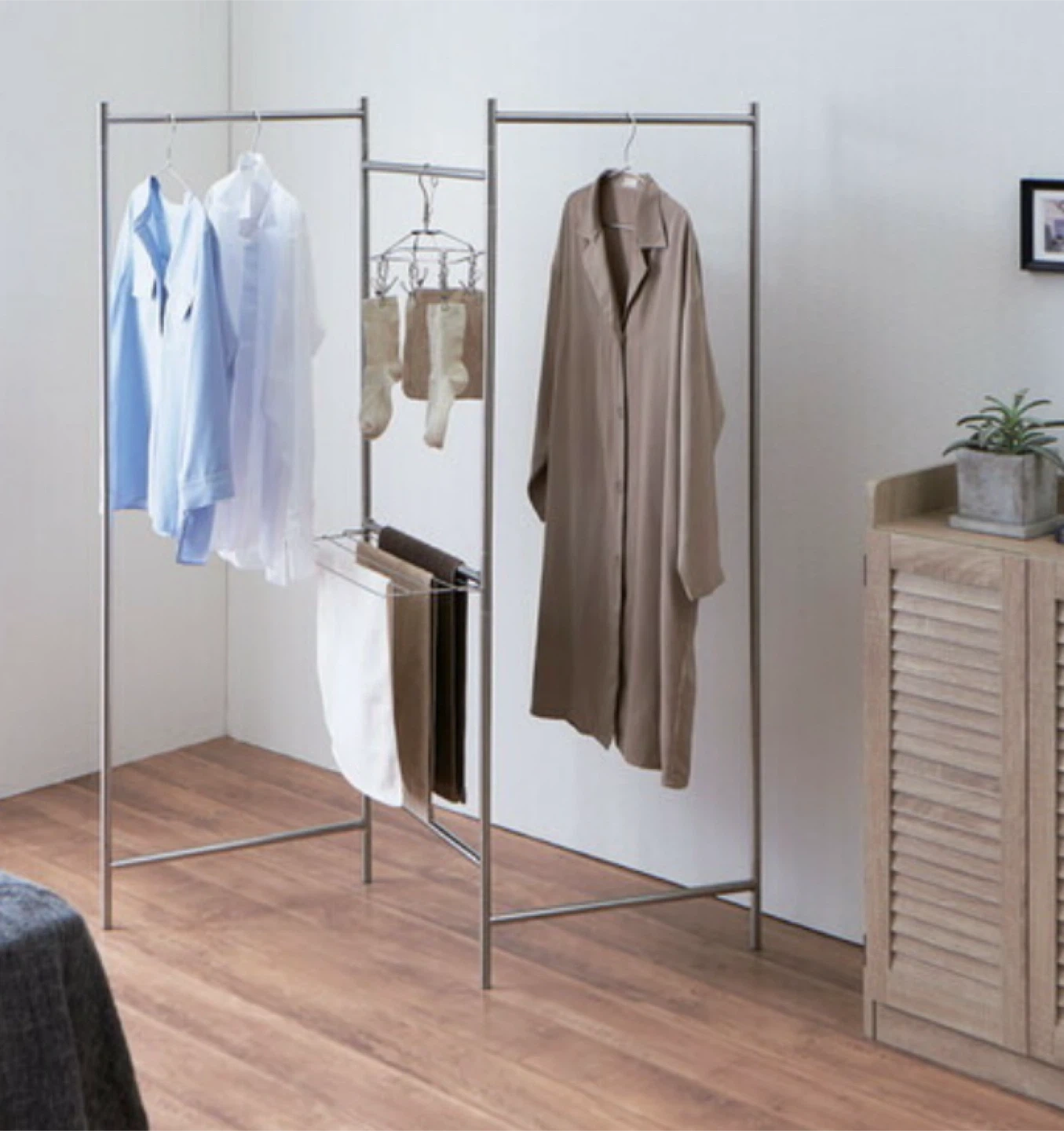 今年の夏購入したばかりですが、キャスター付きの物干しを購入し、使用しなくなったので出品します。 組み立て済みです。 基本土日祝のお取引きになります。 平日は夜のみ対応出来る可能性があります。希望者が多い場合は、お取引きの都合が合わせやすく、早めに取りに来ていただける方を優先させていただきます。 どうぞよろしくお願いいたします。 ◆出しっぱなしでもスタイリッシュに決まるインテリア物干しです。 軽くて丈夫、さらに高級感のあるオールステンレス仕様。 コートなどのロング丈、タオル、小物もし っかり干せるサイズです。 ◆干す物や場所に合わせ自由に変形でき、使わない時は折りたたんでスリムに収納! ■ 仕 様 ■ サイズ(約):幅54から108×奥行54×高さ150cm 折りたたみサイズ(約):幅54×奥行4×高さ150cm 重量(約):2.2kg 全体耐荷重(約):12kg 材質 本体:ステンレスパイプ 樹脂部品:ポリプロピレン 金属部分:ステンレス 組立:組立済み