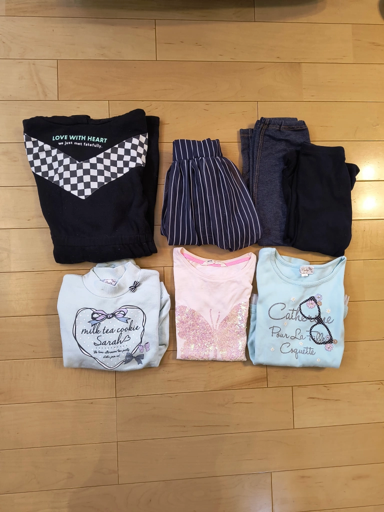 子供服のまとめ売りです どれも 汚れやシミがあります デニムのレギンスは補修した後があります ・Tシャツ(ピンク、蝶の柄) ・トレーナー(水色、リボンの柄) ・トレーナー(水色、Cathyのロゴ、サイズ130) ・ワンピース(黒、LOVE WITH HEARTのロゴ) ・パンツ(黒、デニム) ・使用感あり 中古品であることご了承ください