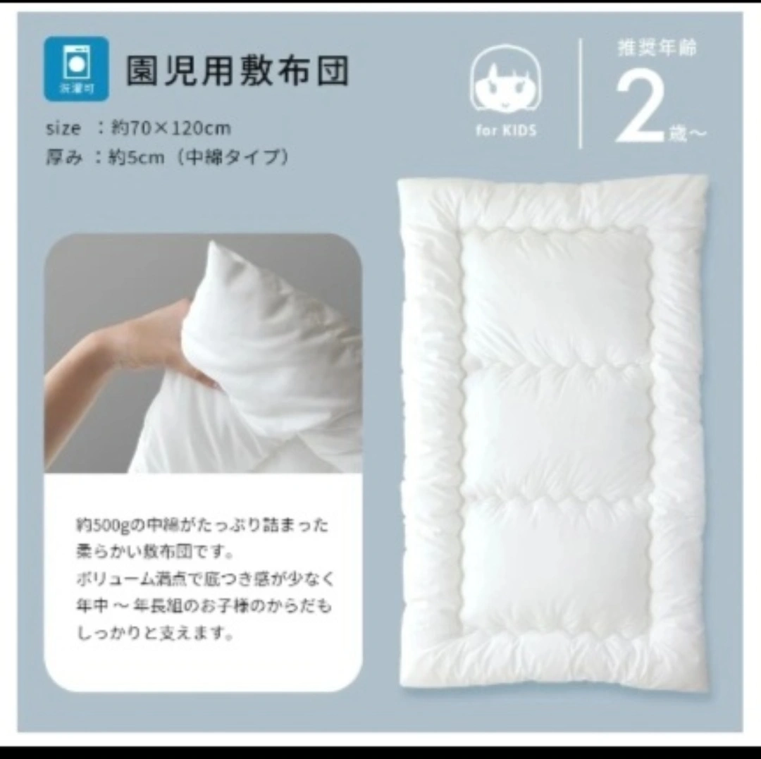 外泊用に用意したもので、3回ほど使用しましたが汚れはありません。次回から実家で用意してくれることになったので、この布団は不要になりました。 ① 敷カバー 約72×123cm 生地: 綿100%(サイドファスナータイプ)※裏面に生地の継ぎ目があります ② 園児用 敷布団 約70×120×5cm 側生地:ポリエステル65%・綿35%/中綿:ポリエステル100%( テイジンの洗えるウォシュロン中綿) ※2023年にAmazonで6000円ほどで購入しました。 ※車で取りに来られる場合ですが、用賀駅は停めにくいので、自宅の住所をお教えします。子供用なので折りたためば、電車でも持ち歩けると思います。