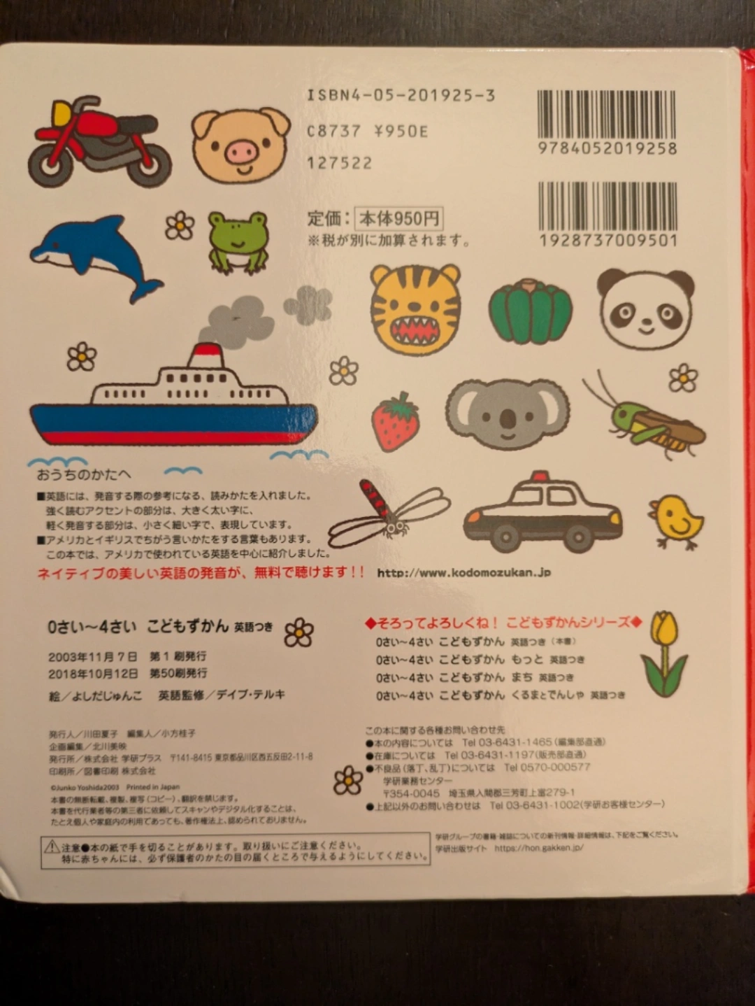学研のこどもずかんです。 はじめての図鑑として、ちょうど良かったです。 ・対象年齢:0〜4歳 ・定価:950円 ・英語つき ・使用感はありますが、中は比較的きれいです 中古品であることご了承ください。